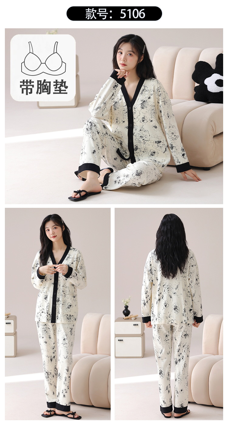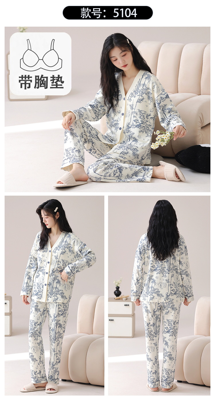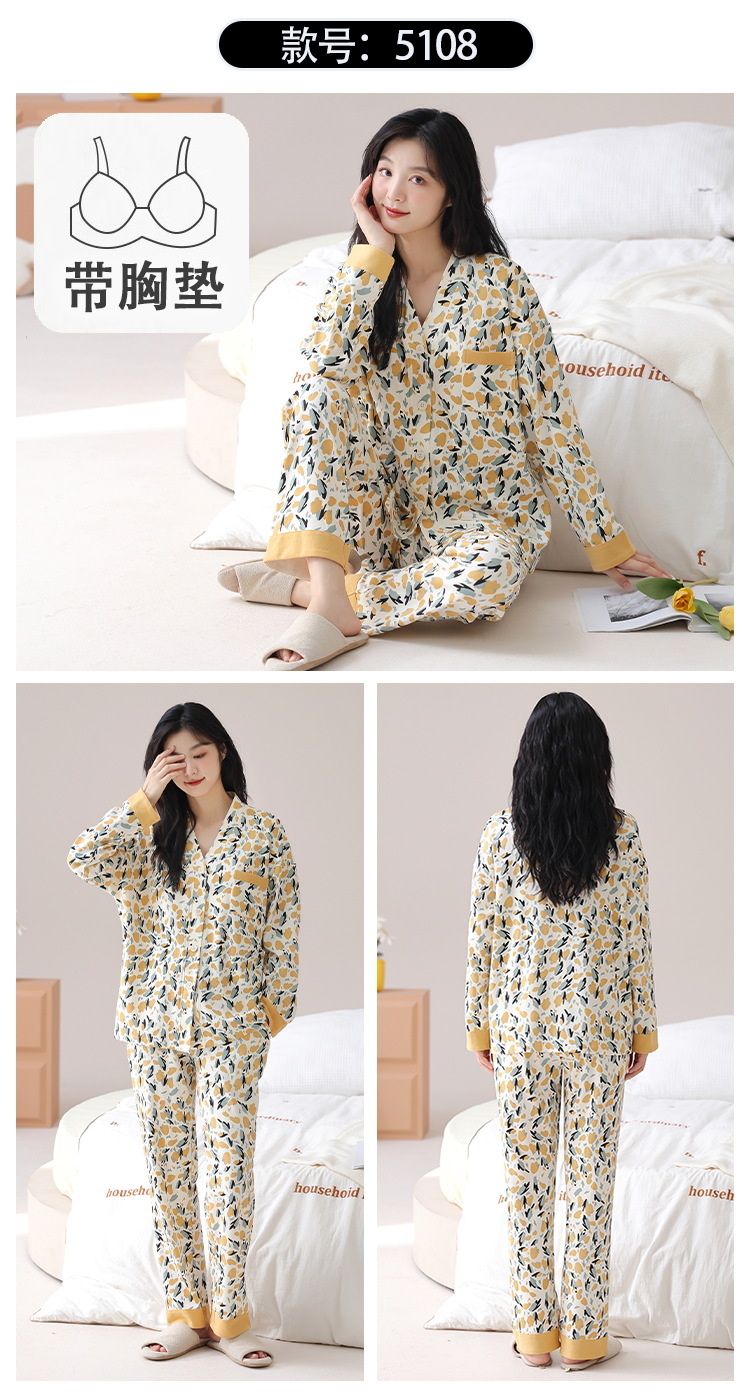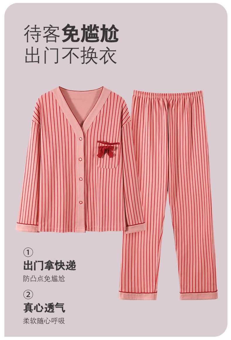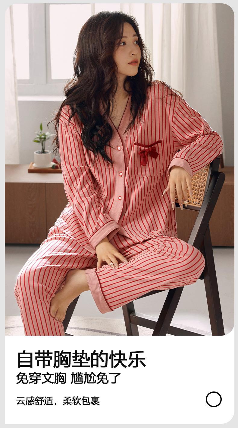 新款日系家居服抖音网红同款带胸垫睡衣女秋冬款长袖开衫条纹韩版家居服秋季套装大码