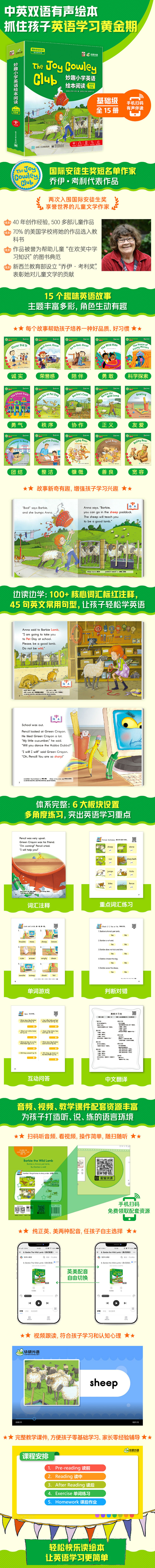 绘本故事提供英音和美音两种录音,重点词汇、互动问答、趣味练习等由美国外教示范朗读,手机扫描二维码即可在线听音,也可使用配套点读笔互动学习。