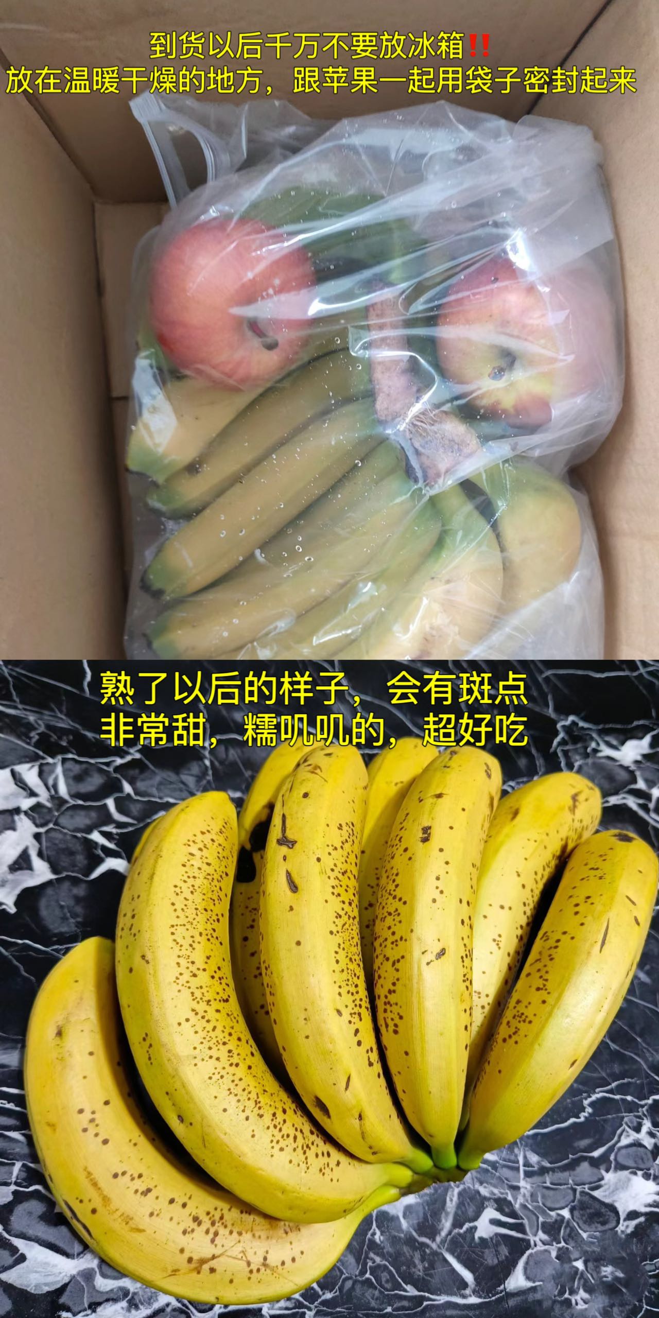 1、香蕉收到后,先打开检查有没有坏果,没有的情况下擦干香蕉水气,用袋子装好,在袋子里放入3-4个苹果,封好袋口装进纸箱保存即可。