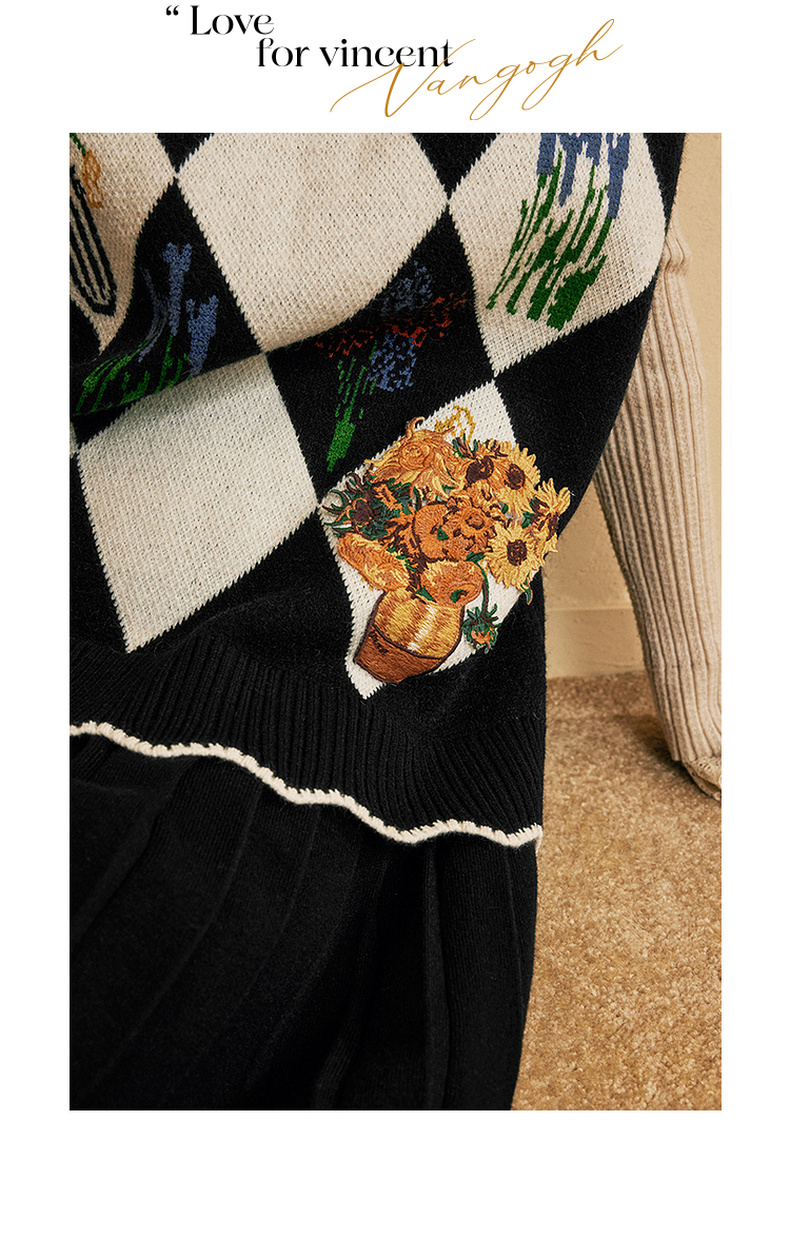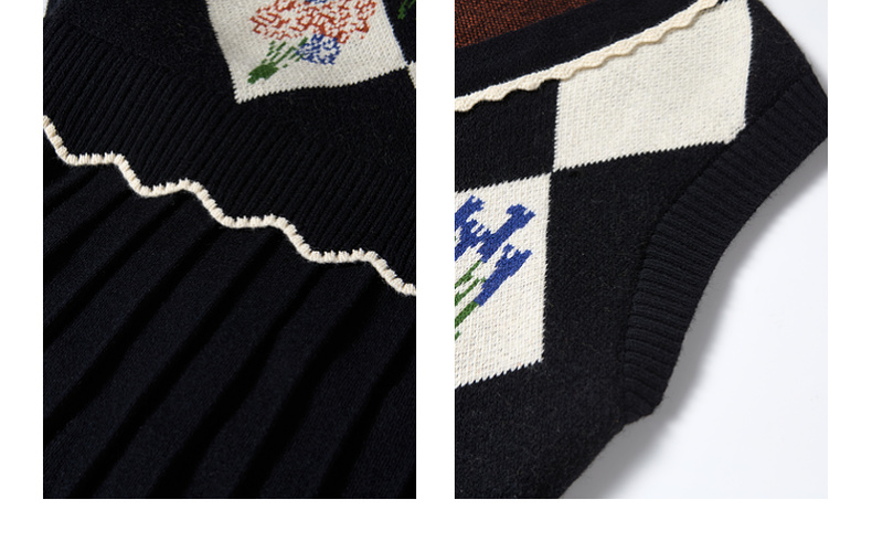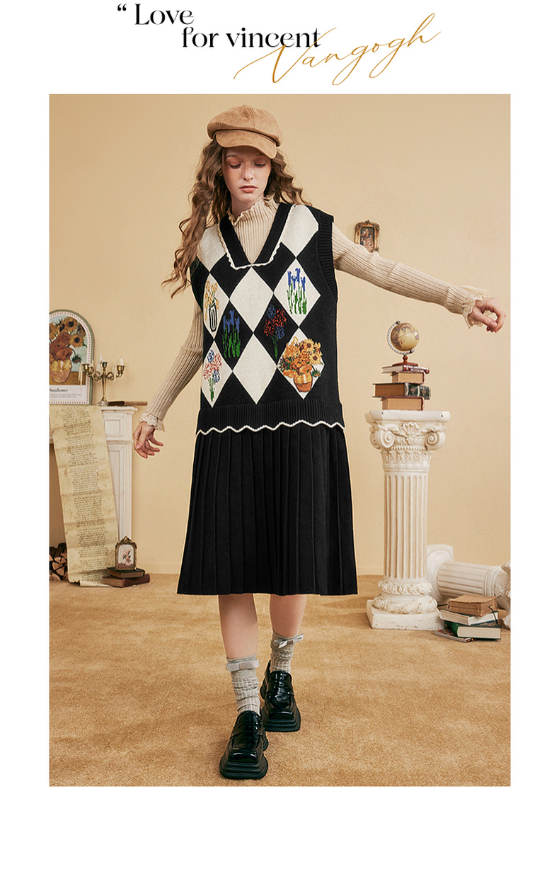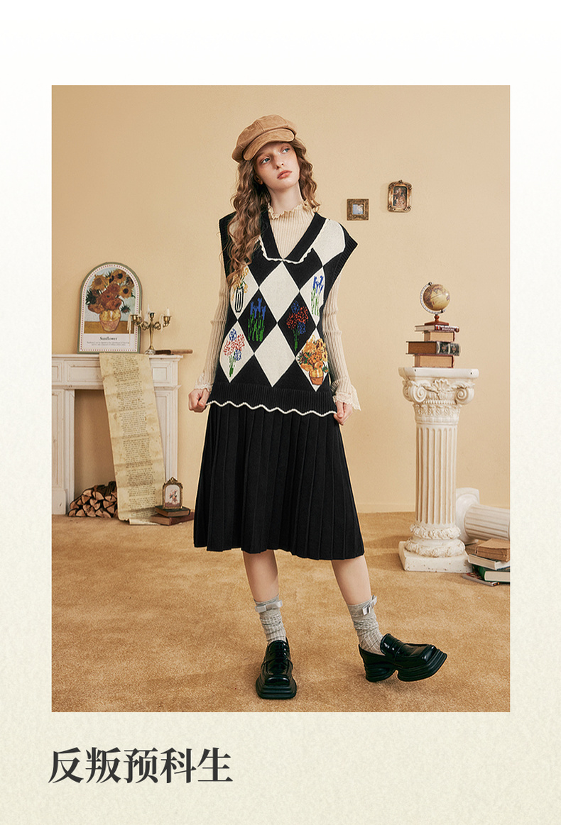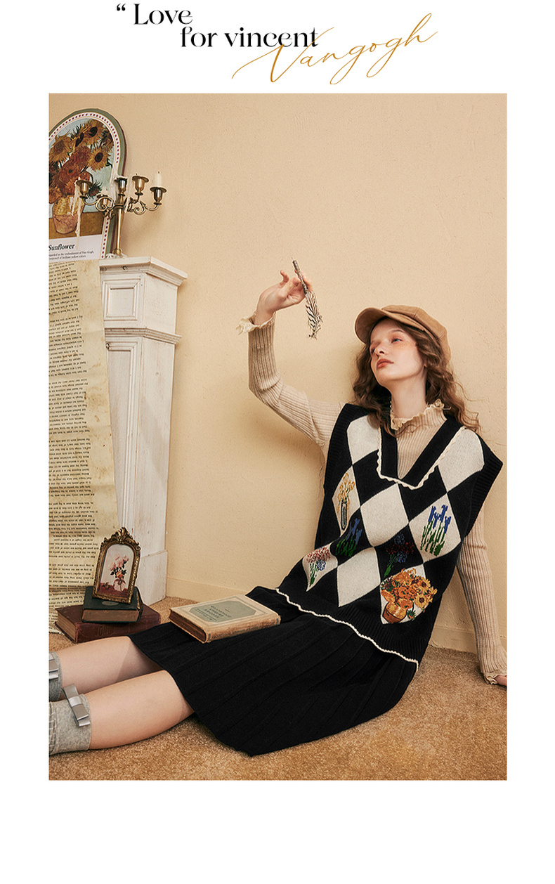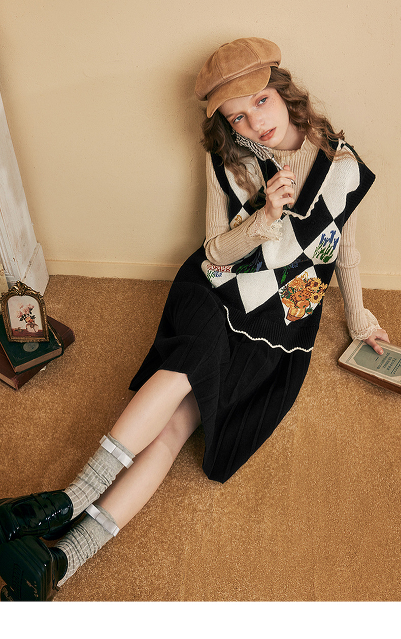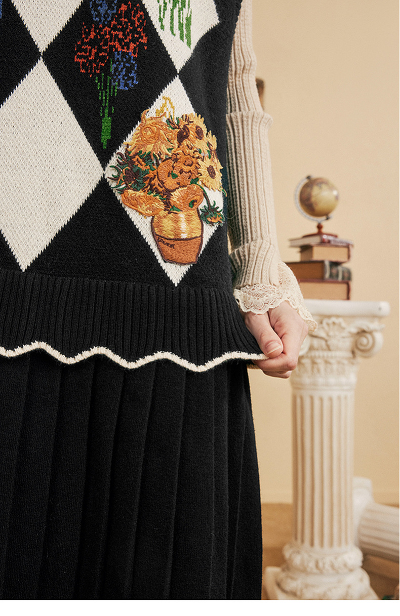 两三事梵高文艺反叛预科生2024秋季新款绣花拼色菱形格针织连衣裙
