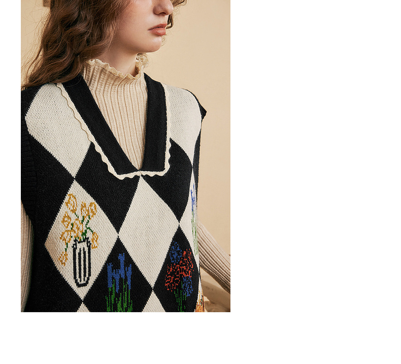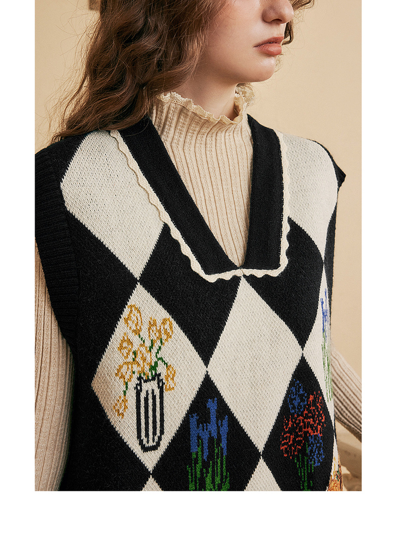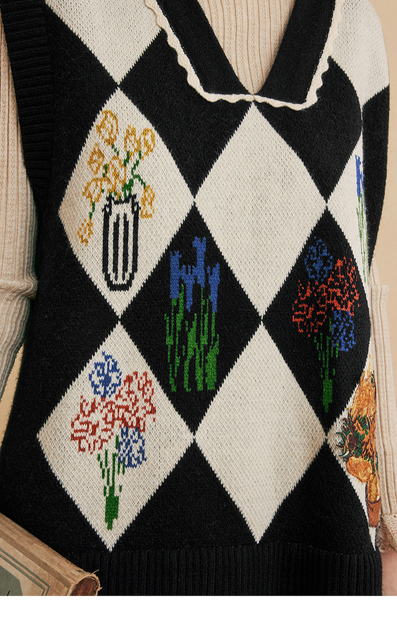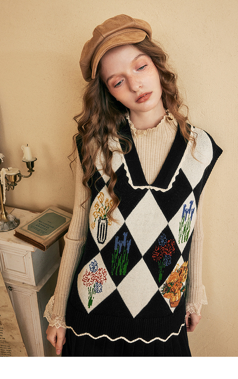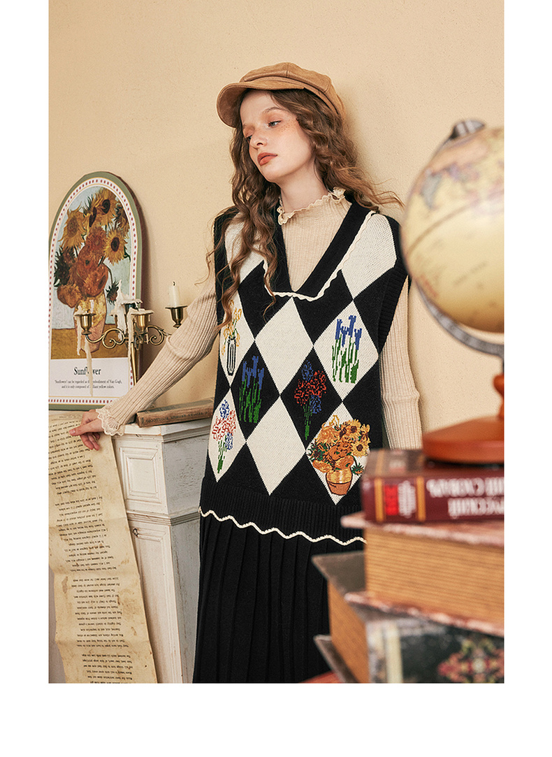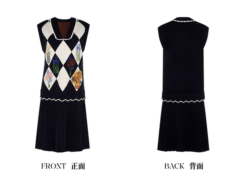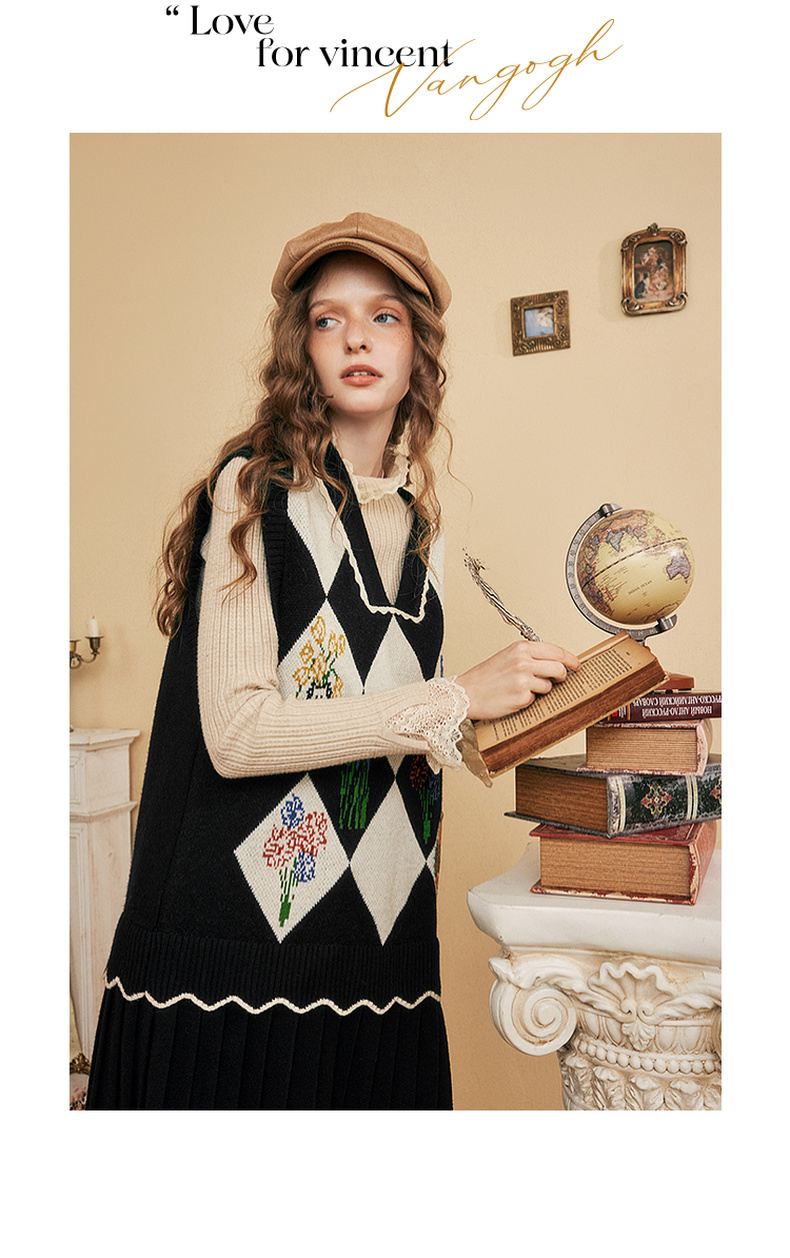 两三事梵高文艺反叛预科生2024秋季新款绣花拼色菱形格针织连衣裙
