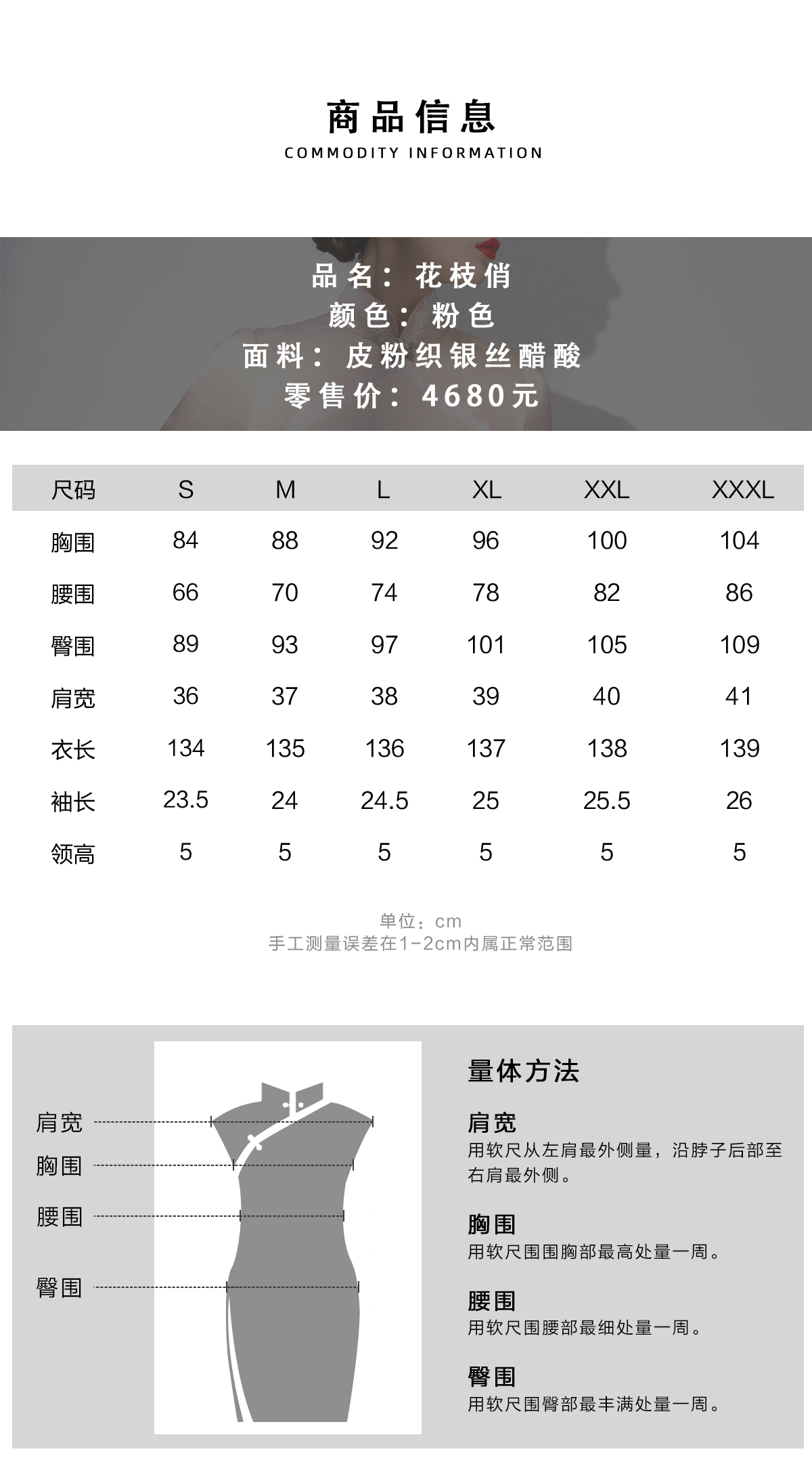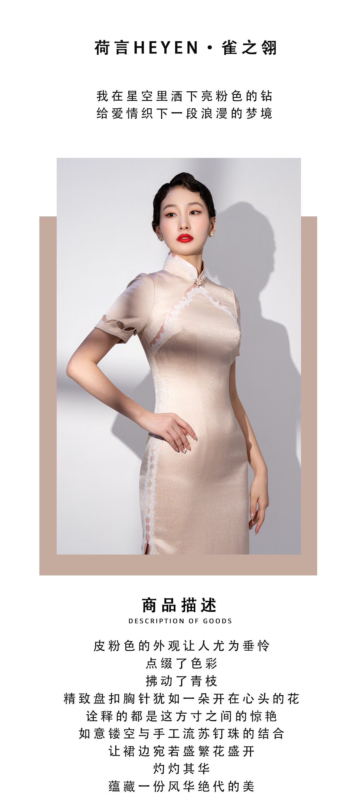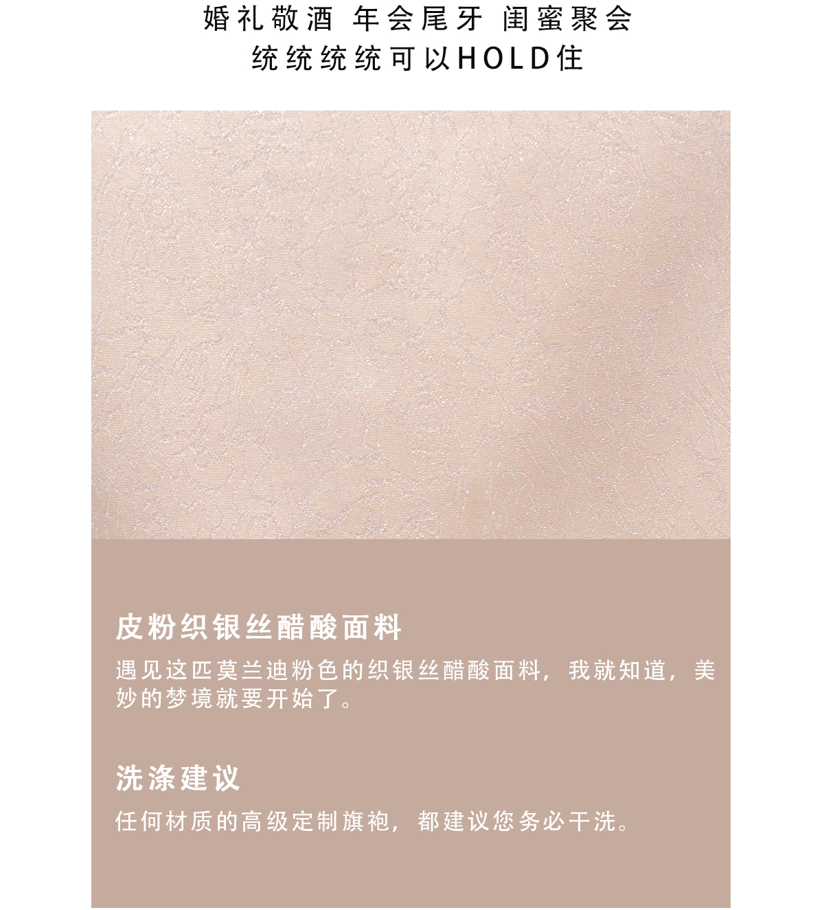 荷言HEYEN 花枝俏 皮粉织银丝醋酸面料+手工流苏钉珠+精致盘扣胸针+如意镂空透视造型+婚庆旗袍礼服款