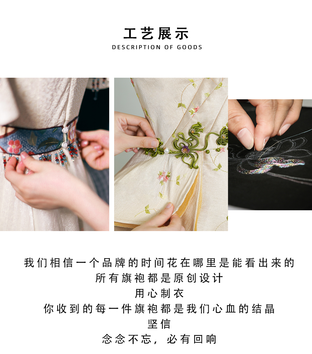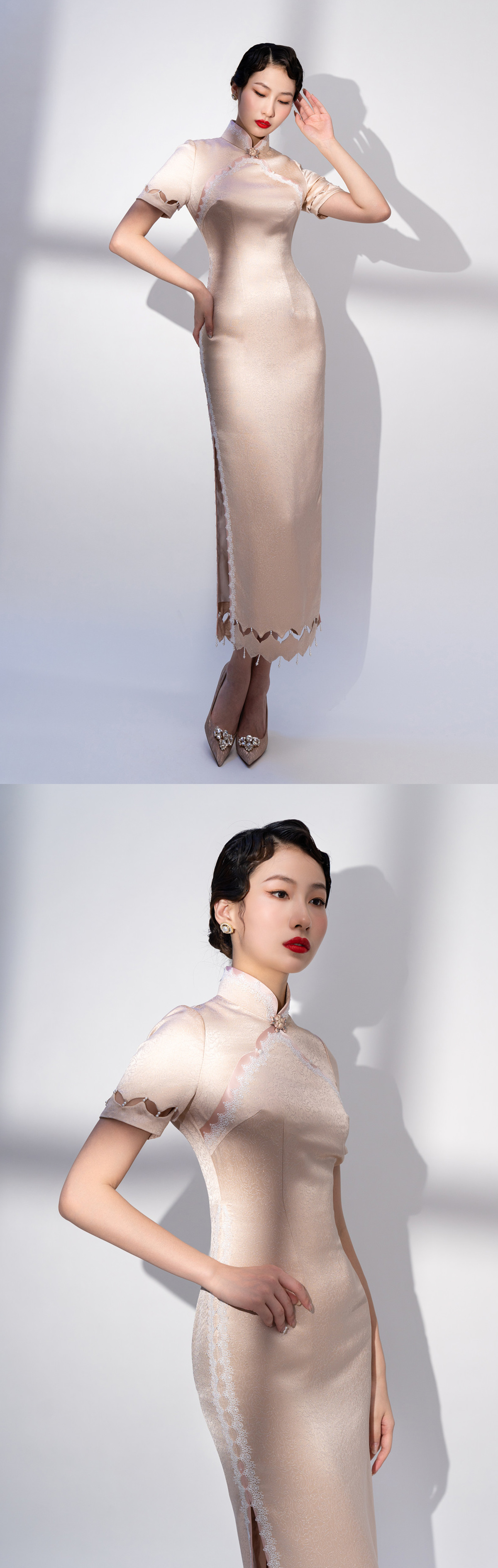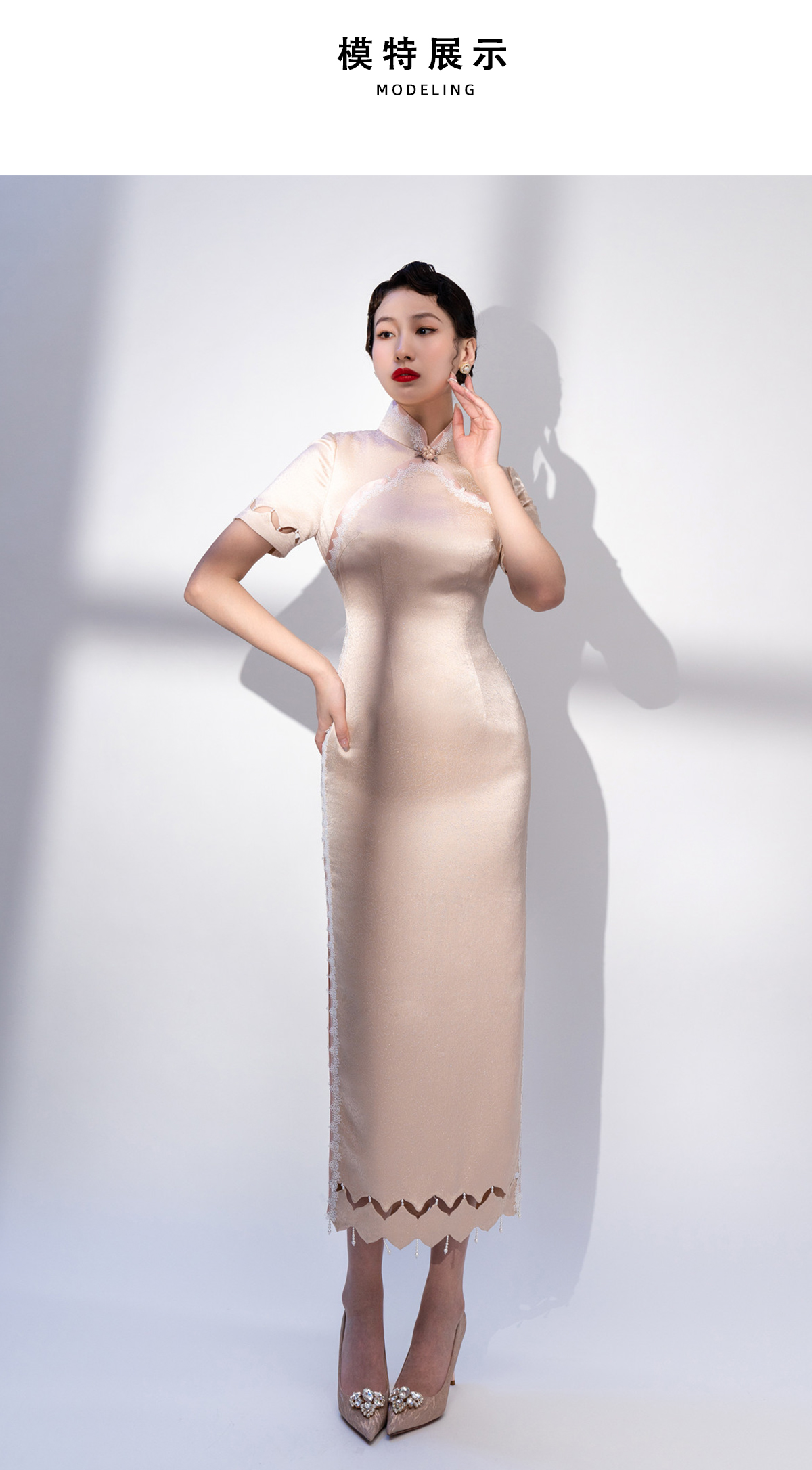 荷言HEYEN 花枝俏 皮粉织银丝醋酸面料+手工流苏钉珠+精致盘扣胸针+如意镂空透视造型+婚庆旗袍礼服款