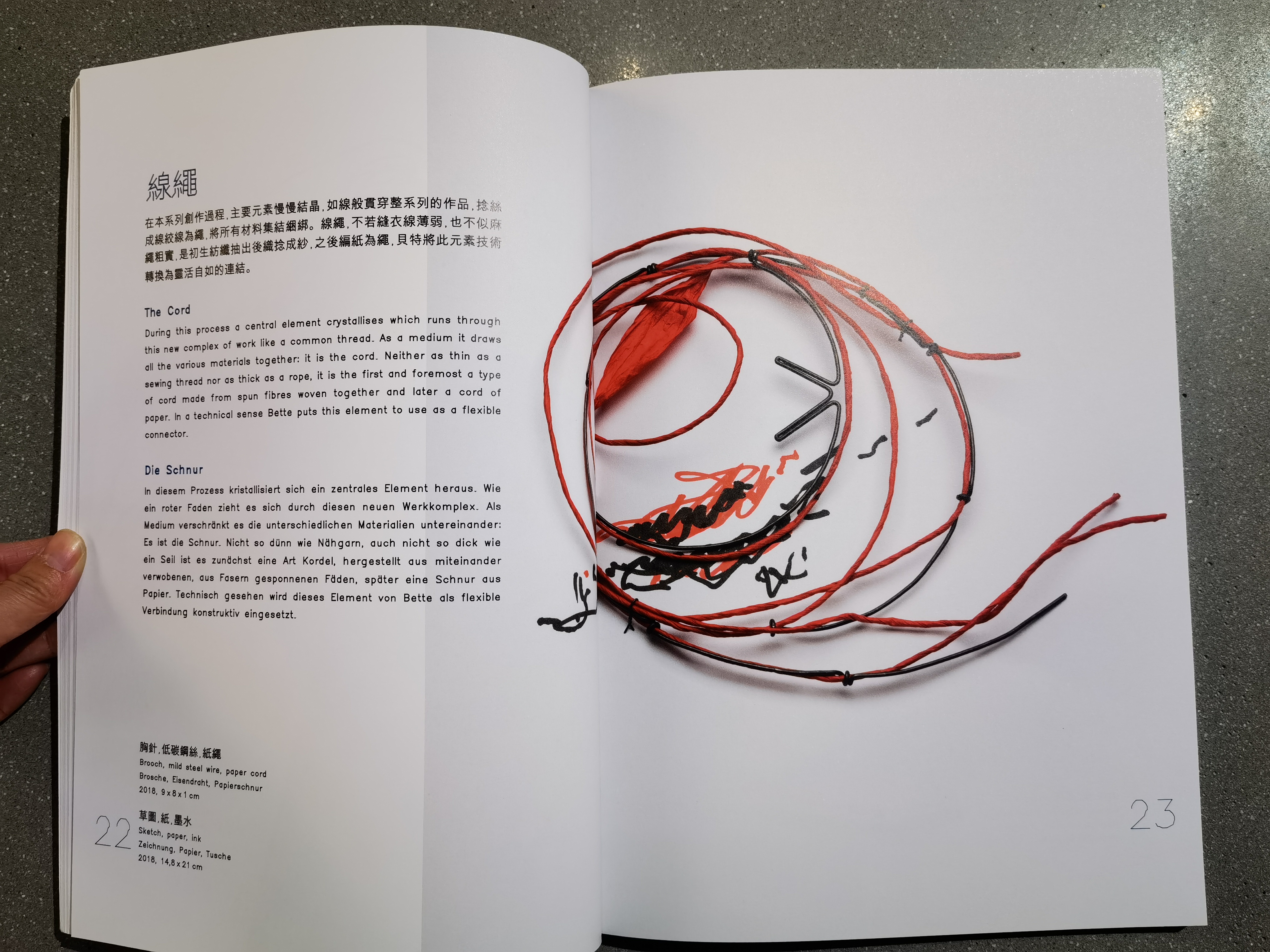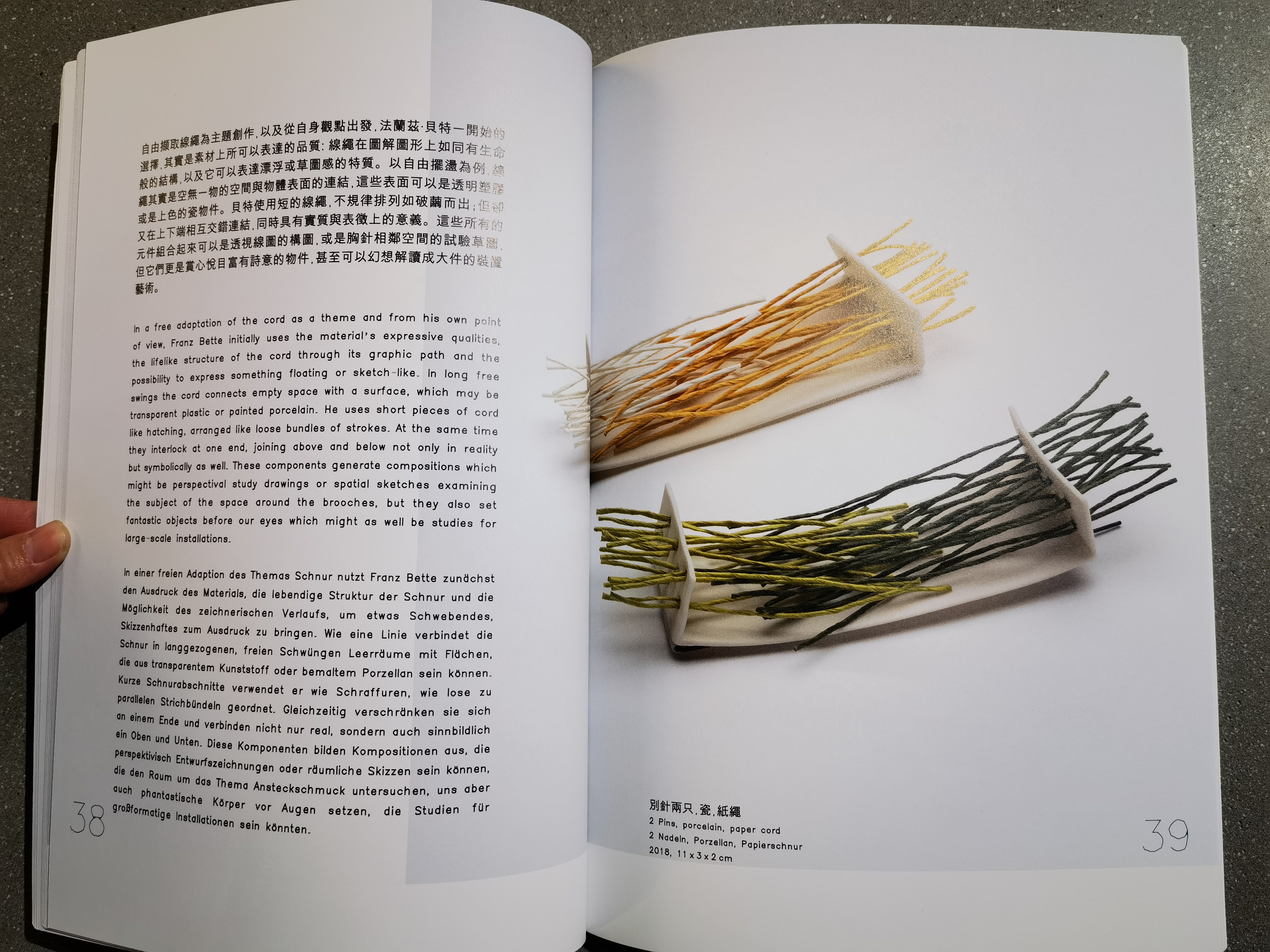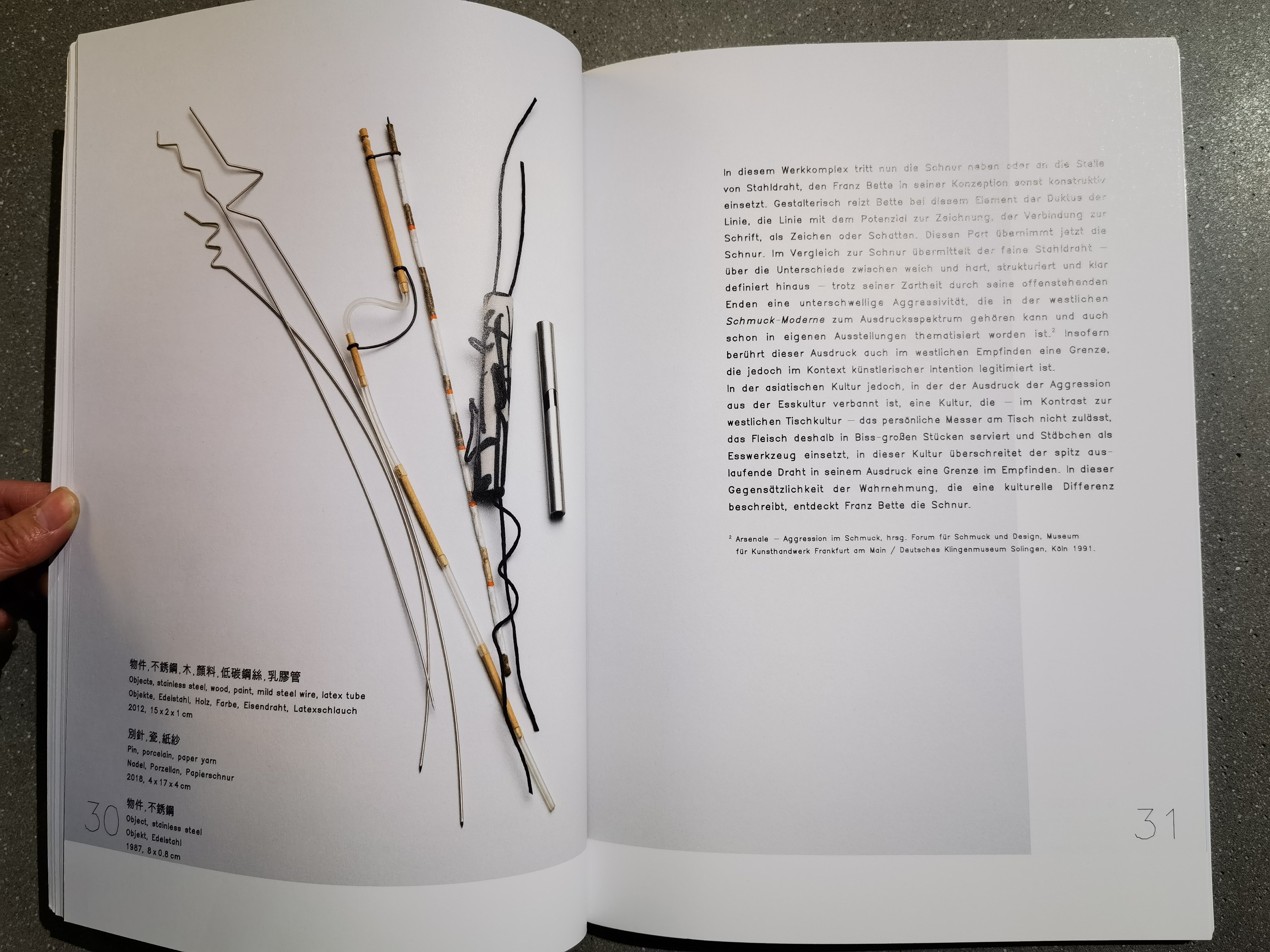 为了《红色X线:弗兰兹·贝特-珠宝》这本书,金银匠和设计师弗朗茨·贝特制作了一套反映他在亚洲经历的新作品。他在自己的艺术手法中融入了新的元素,通过添加瓷器、纸张、竹子、木材和纺织品等具有亚洲内涵的材料,扩展了他对钢、银、金和塑料这些西方影响的材料。他使用这些材料,并了解到它们在亚洲文化中的传统和意义。