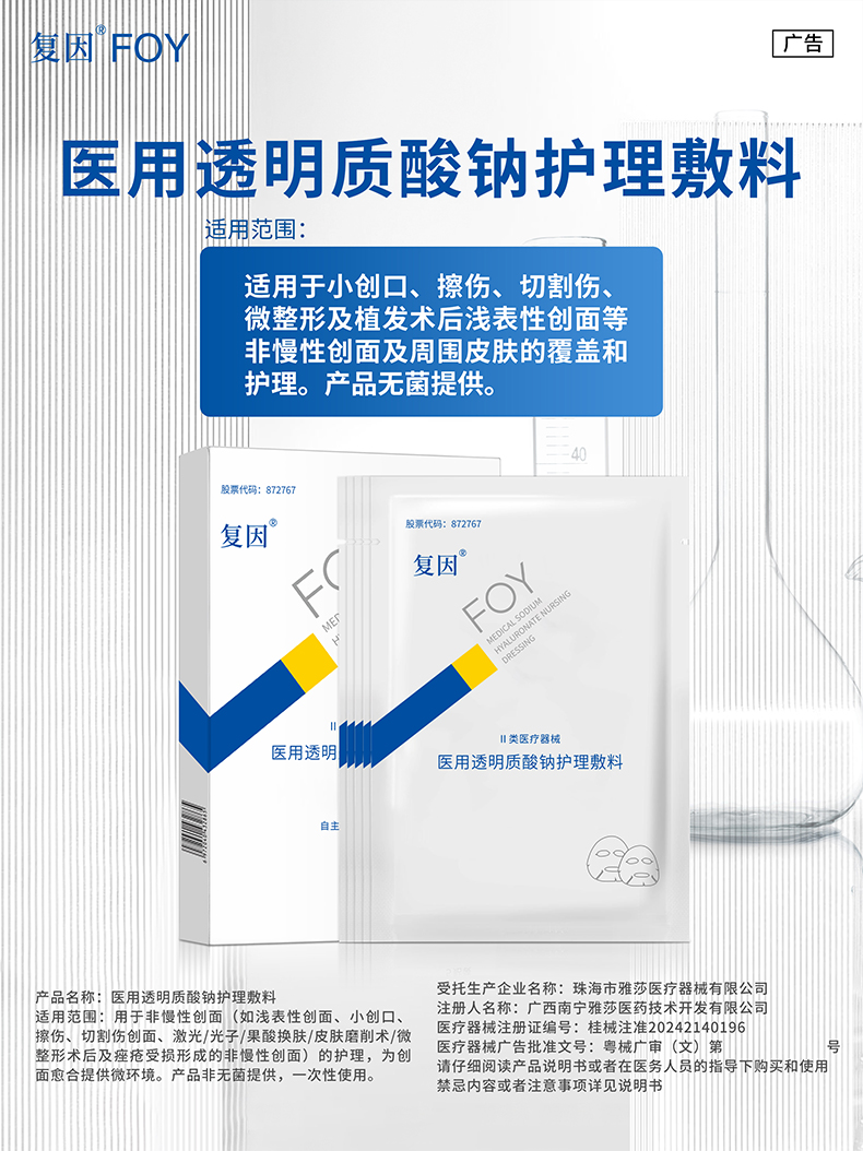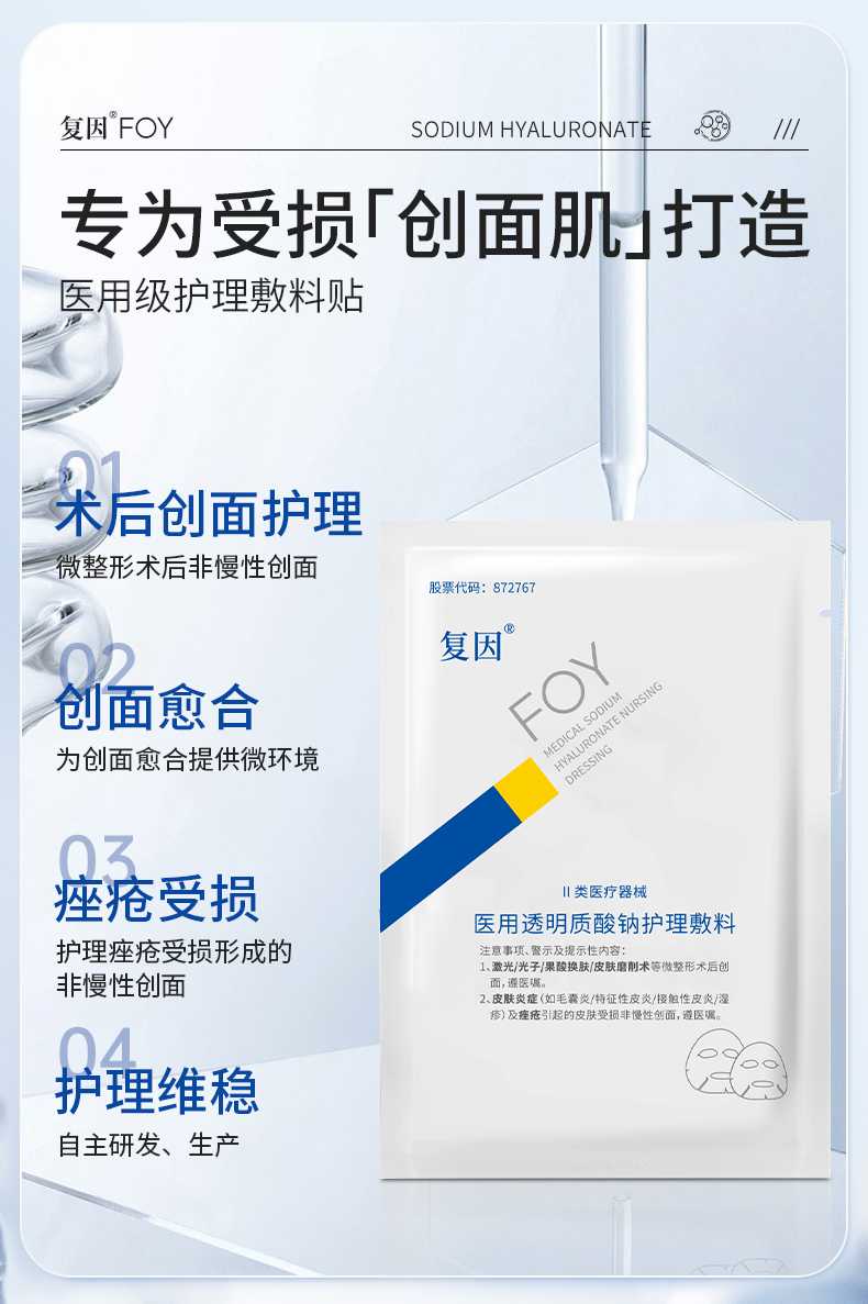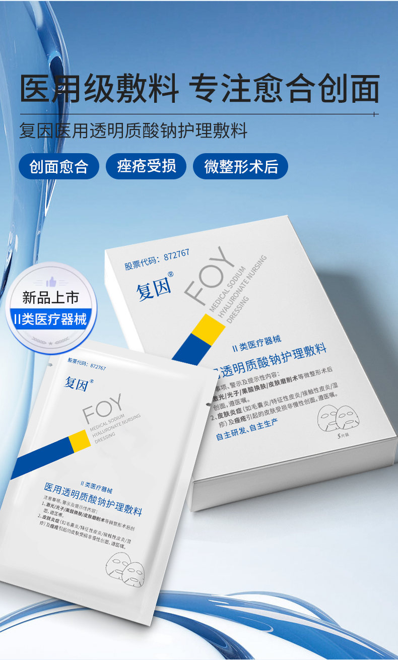【买3送8片】复因医用透明质酸钠护理敷料【院线同款】(透明质酸钠修复贴(白膜)升级款)5片/盒(单盒装) ***2件9折、3件8折