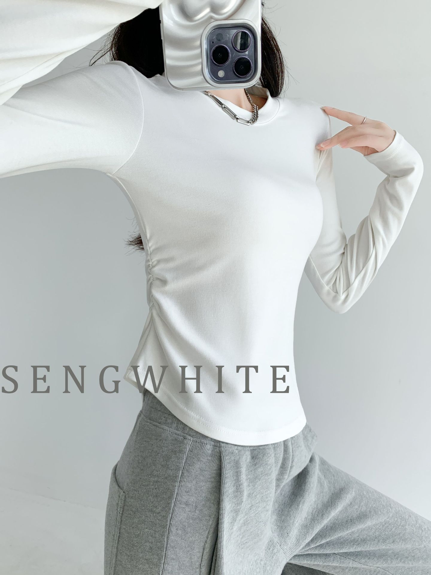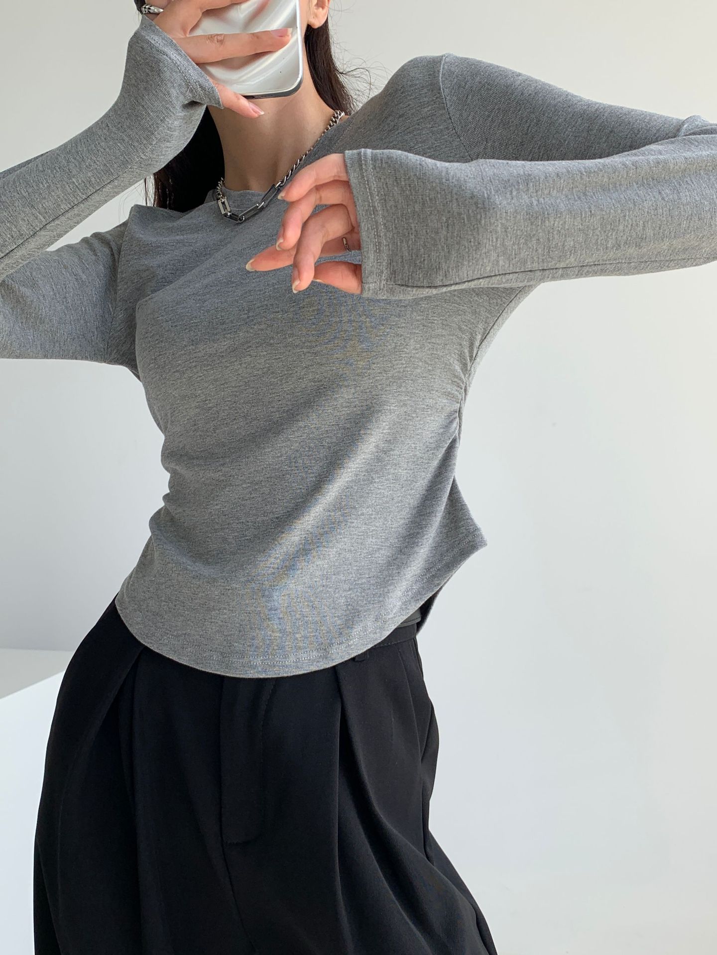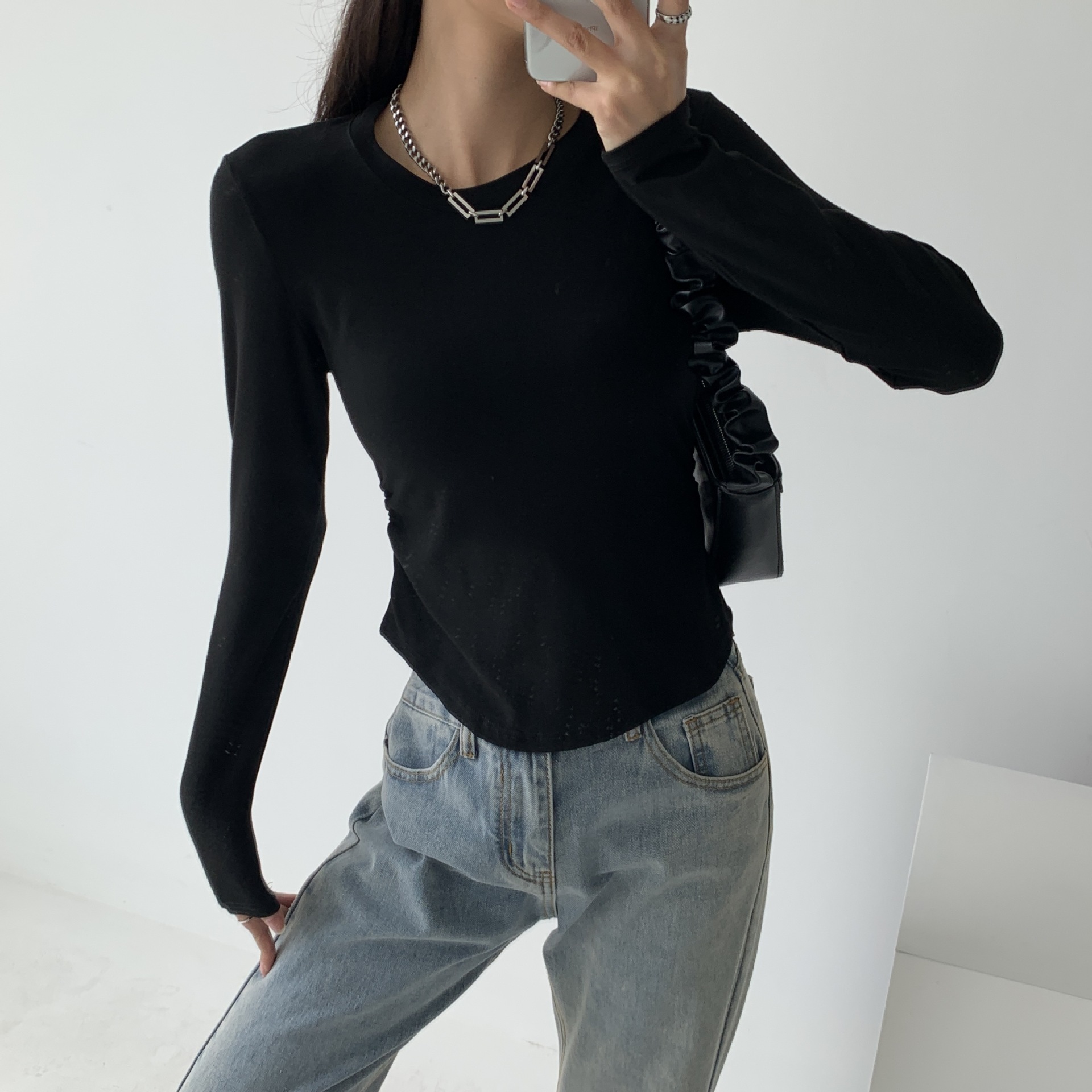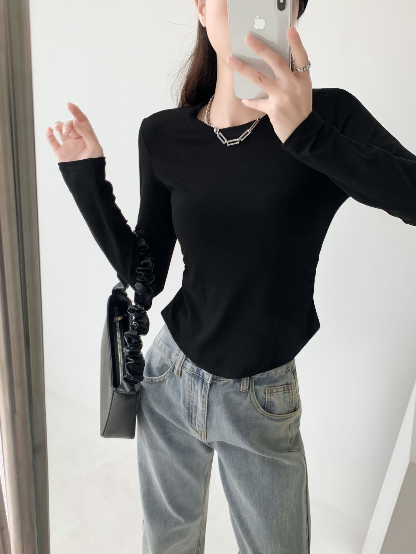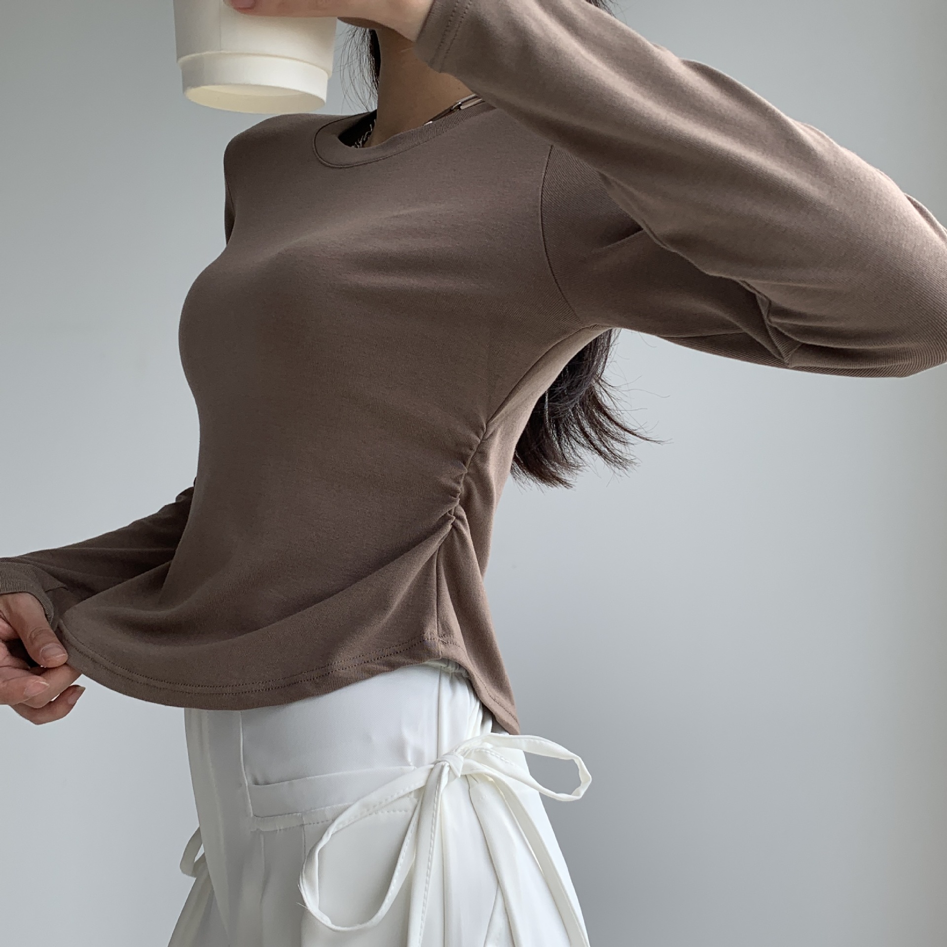 圆弧下摆圆领纯欲风松紧收腰纯色正肩女修身小蛮腰上衣打底衫显瘦