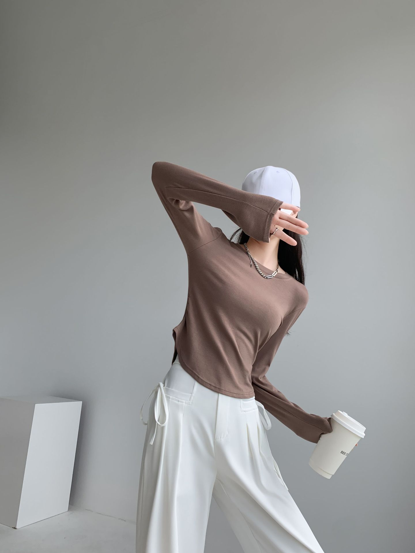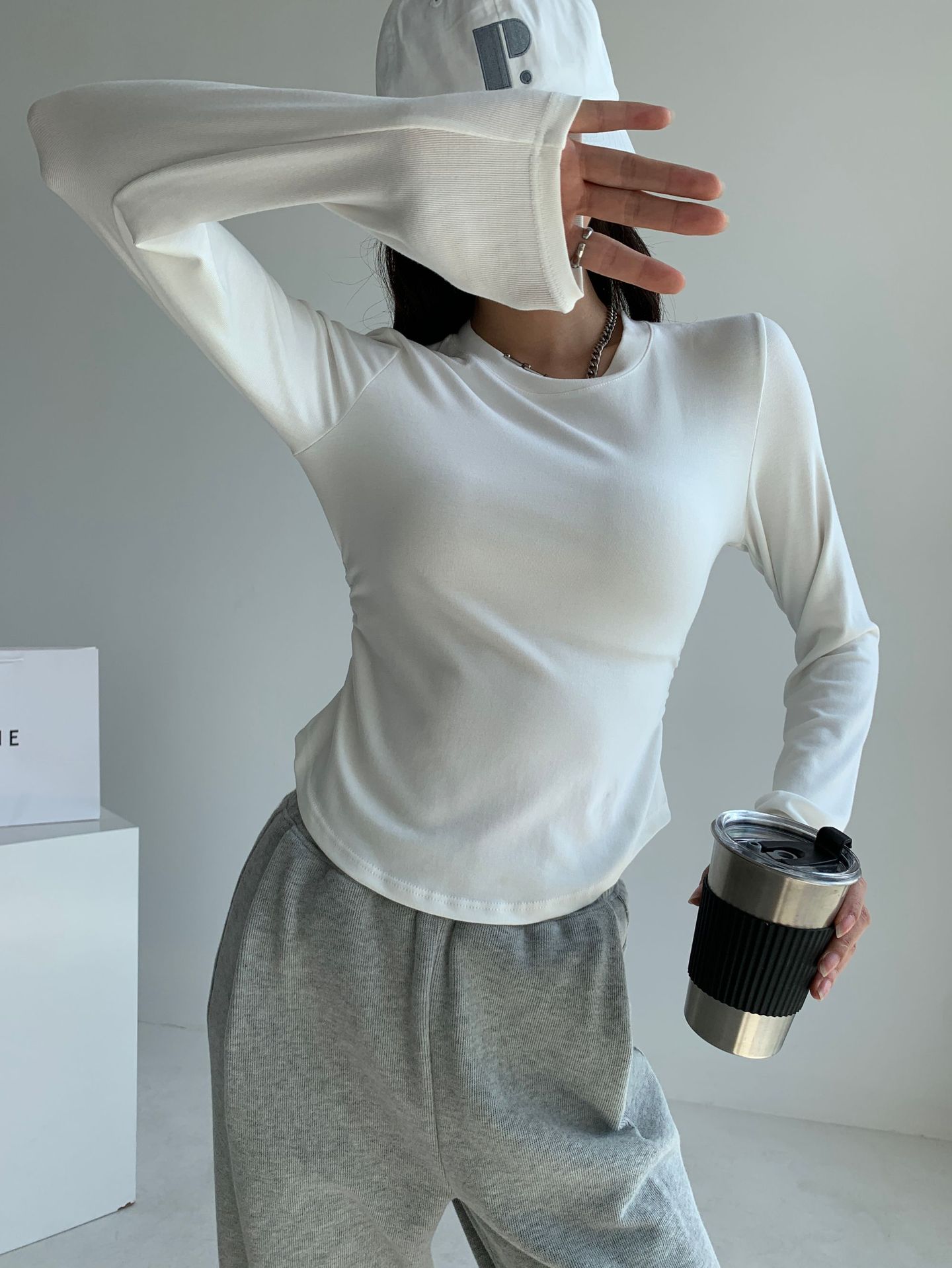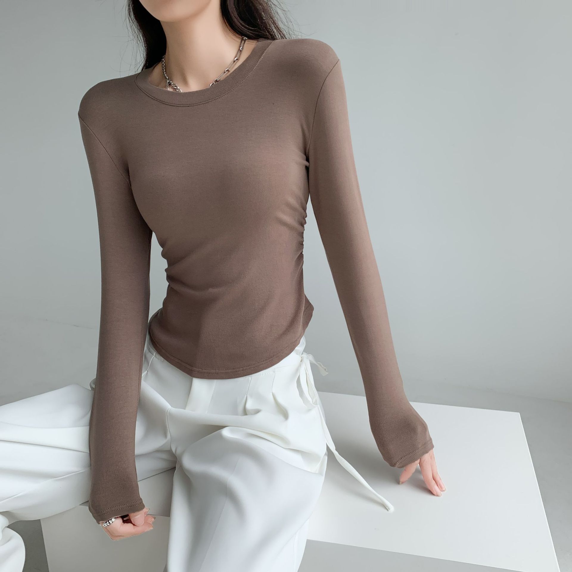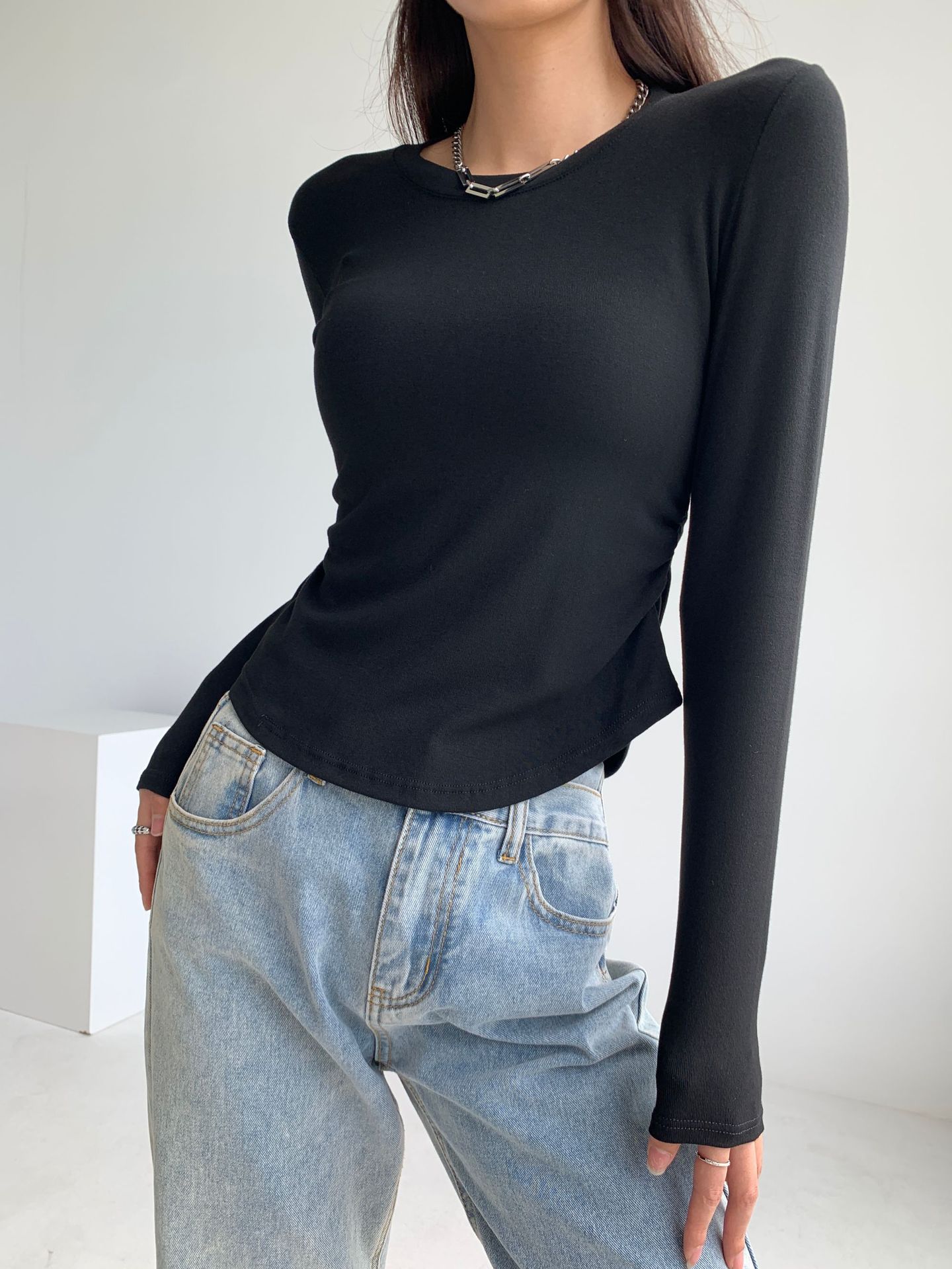 圆弧下摆圆领纯欲风松紧收腰纯色正肩女修身小蛮腰上衣打底衫显瘦 商品图5