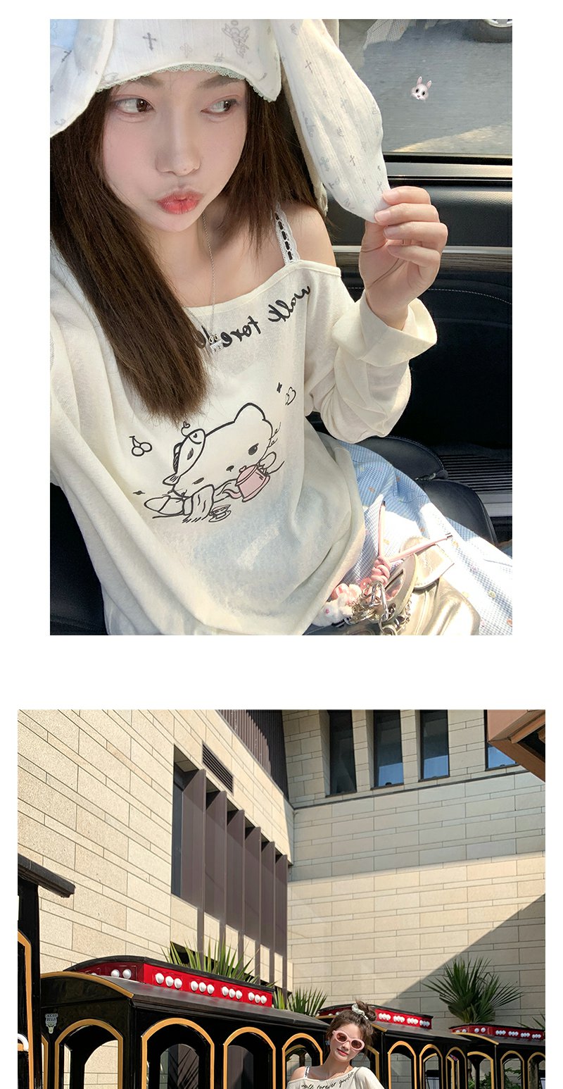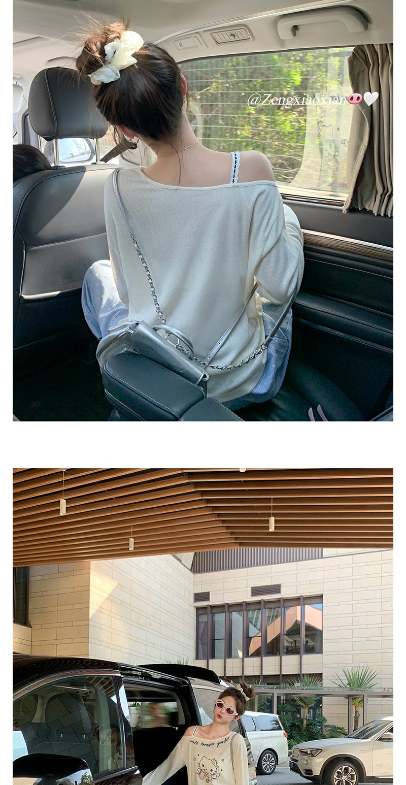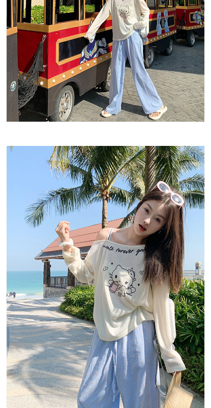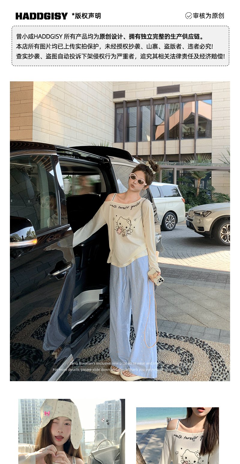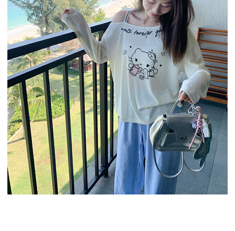 <曾小咸推荐>猫咪印花侧边露肩长袖T恤罩衫