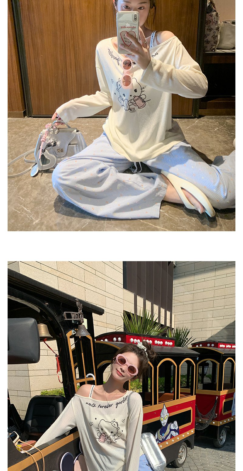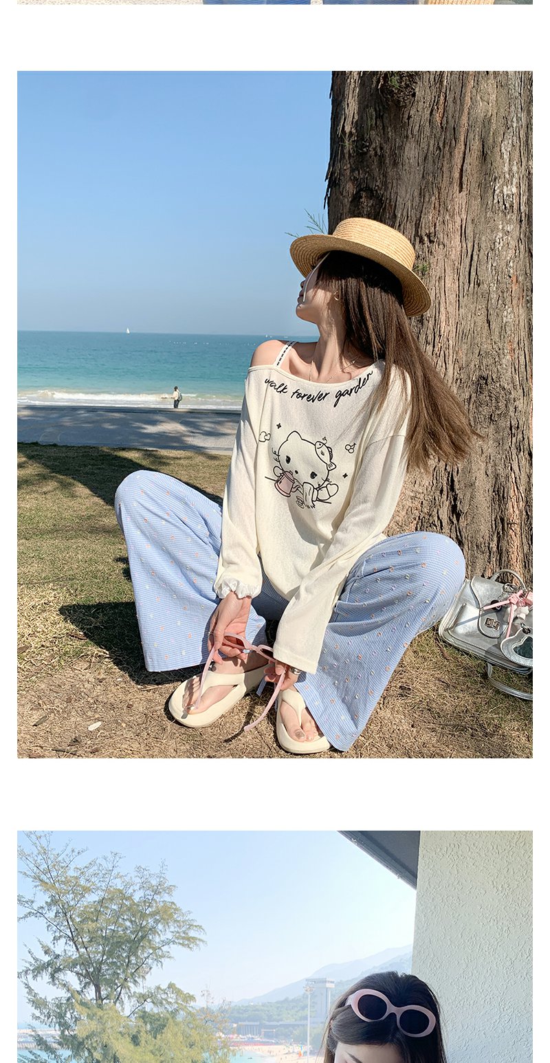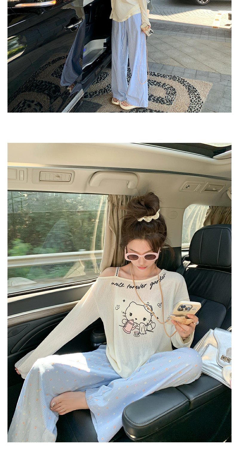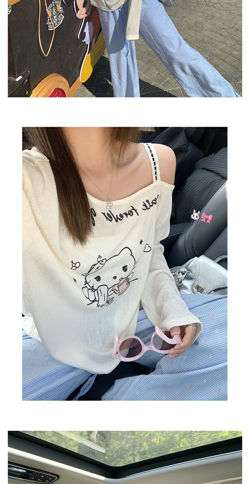 <曾小咸推荐>猫咪印花侧边露肩长袖T恤罩衫