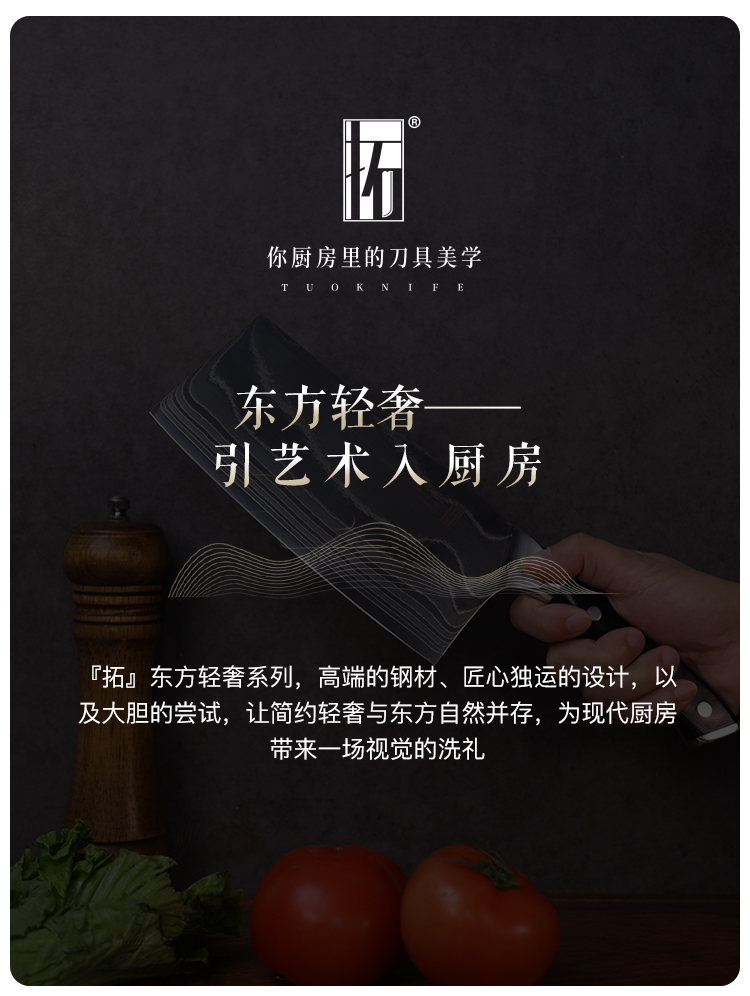 “拓”牌刀具为广东拓必拓科技股份有限公司旗下品牌,一直专注于研究、生产、销售专业厨房刀具,并与欧美、日本、台湾地区等多家知名品牌刀具进行合作,产品行销欧洲、美洲、日本等三十几个国家和地区。
