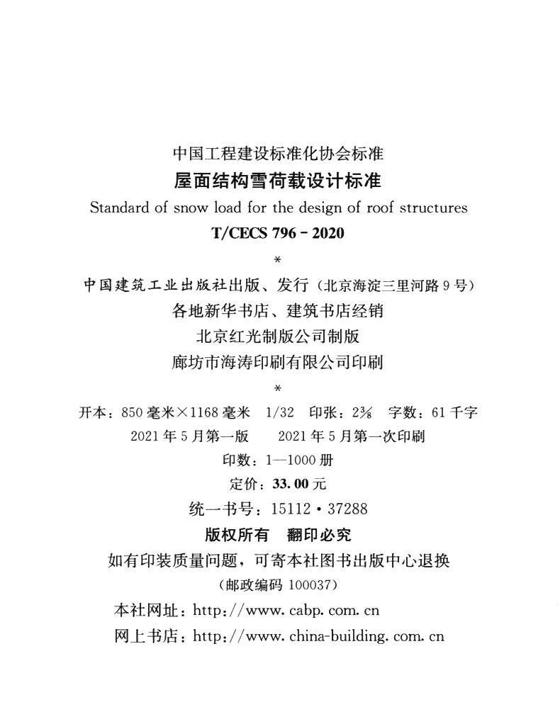 书名:T/CECS 796-2020 屋面结构雪荷载设计标准