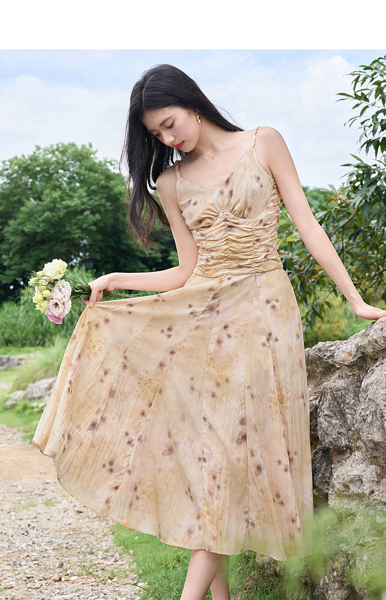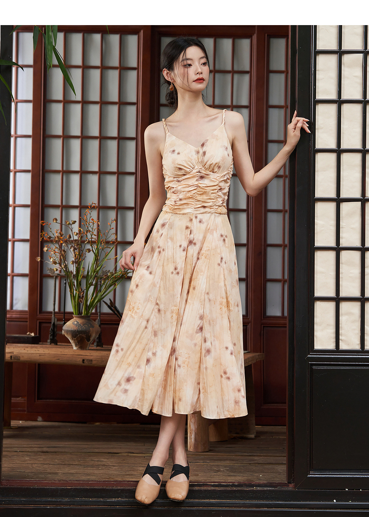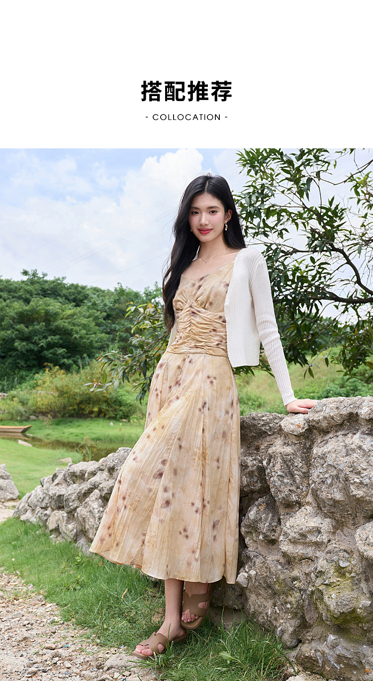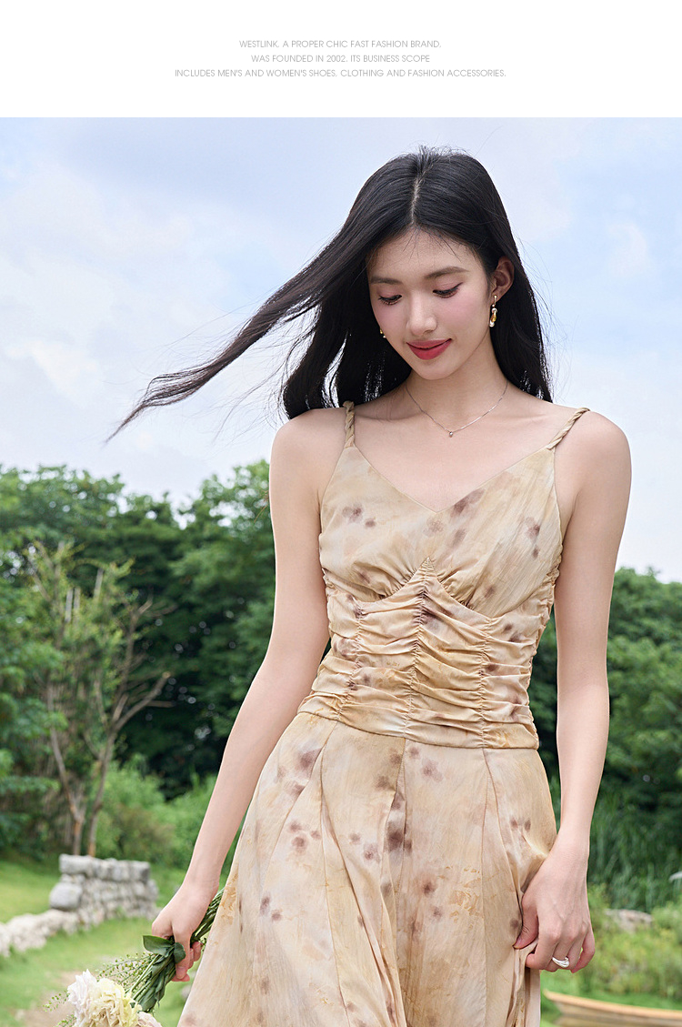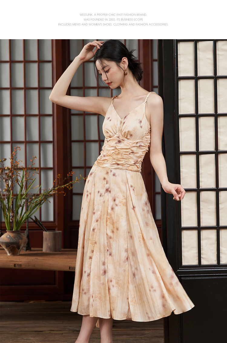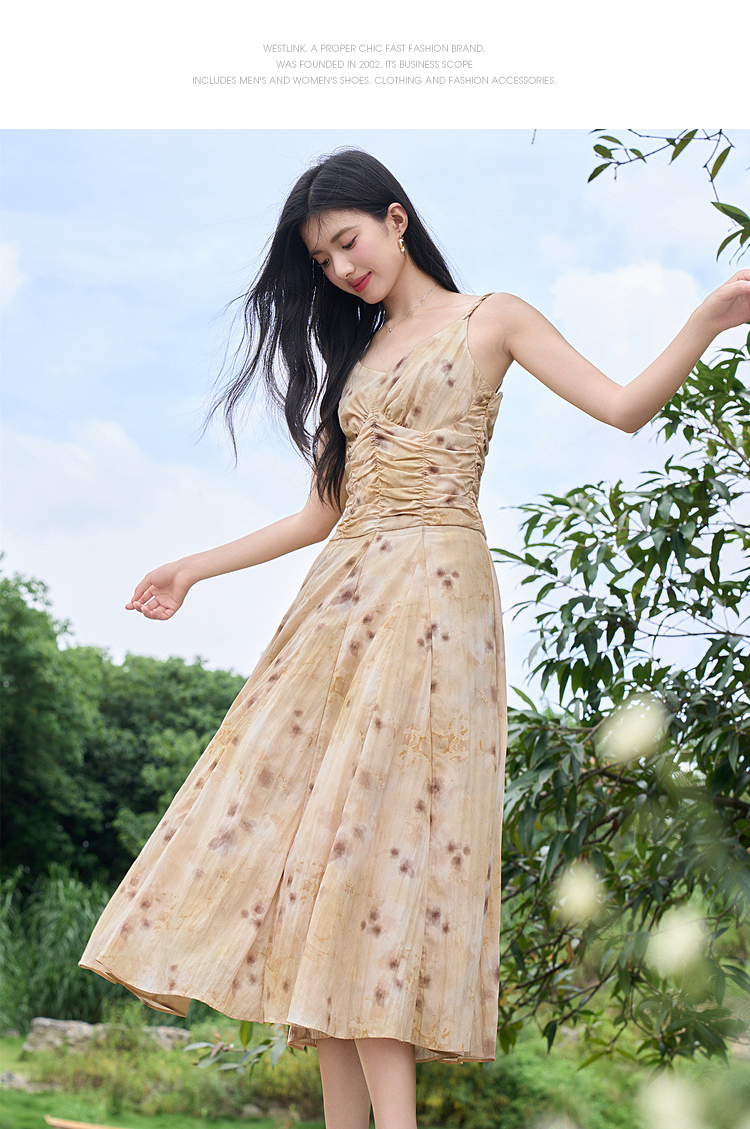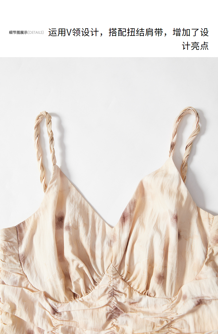 复古晕染印花气质吊带裙女夏季V领扭结肩带褶皱连衣裙V1441223
