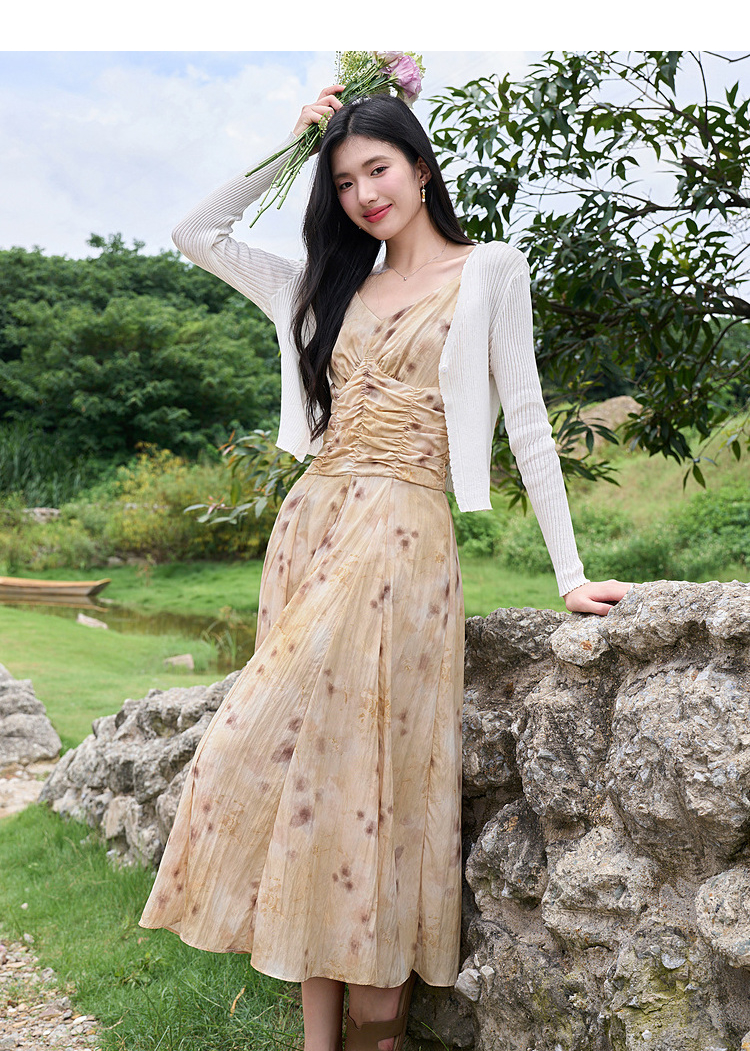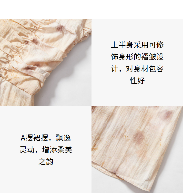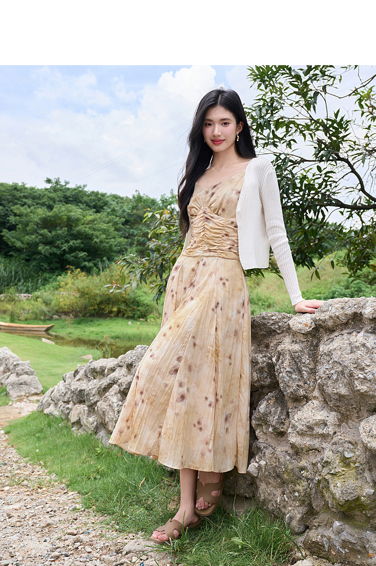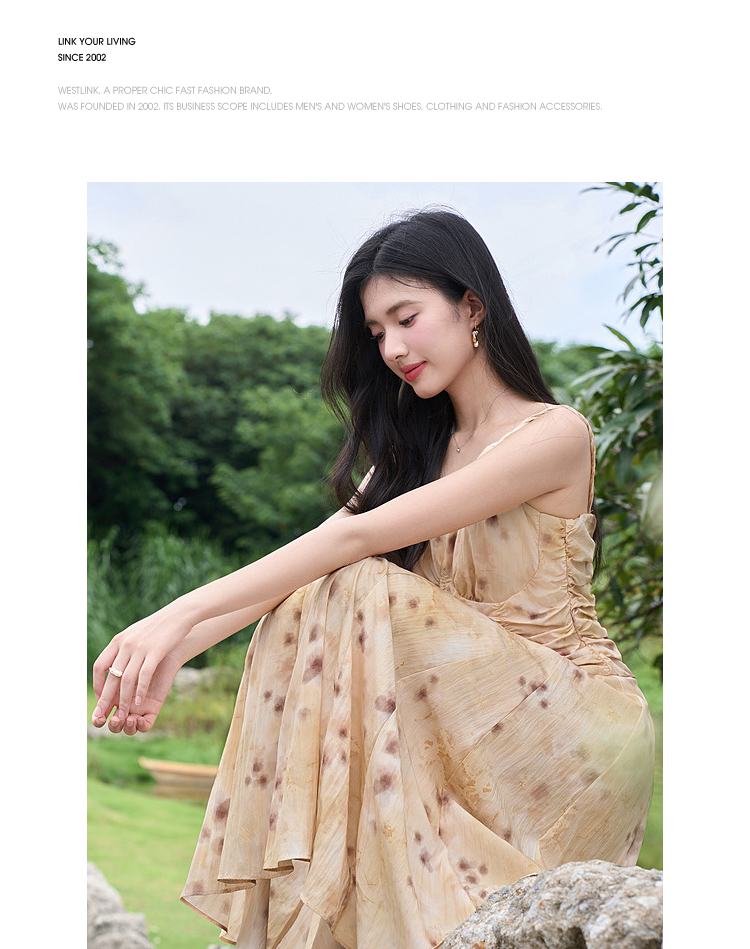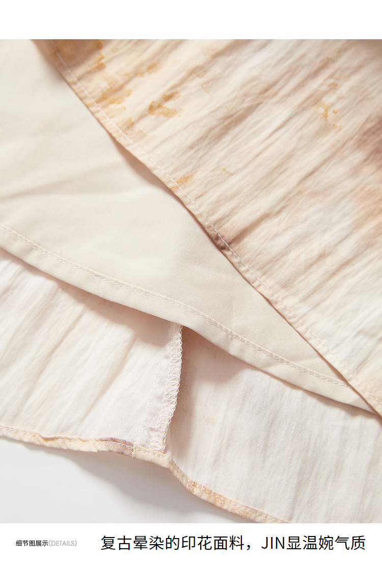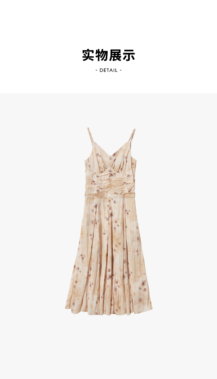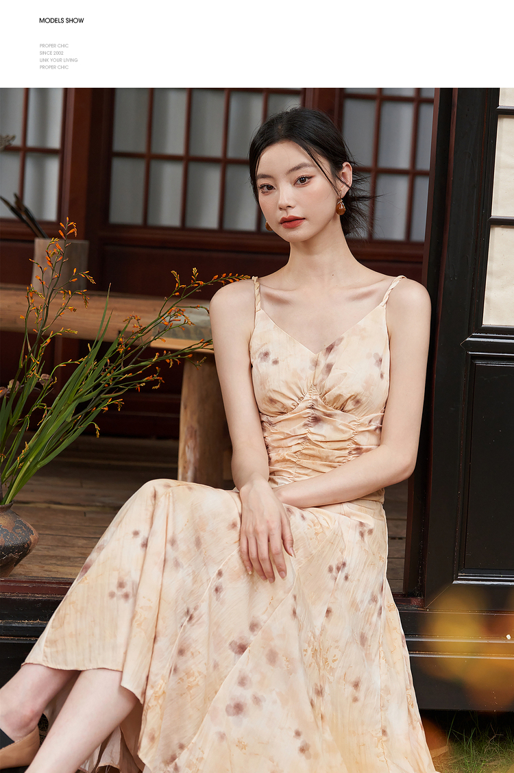 复古晕染印花气质吊带裙女夏季V领扭结肩带褶皱连衣裙V1441223