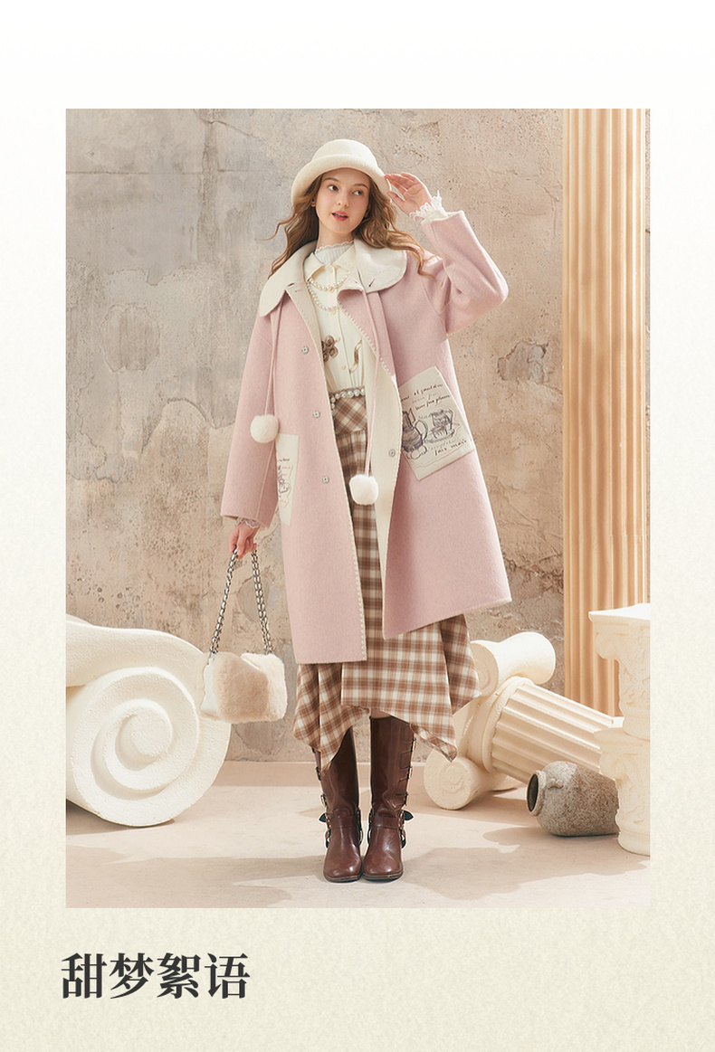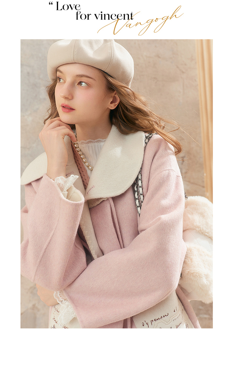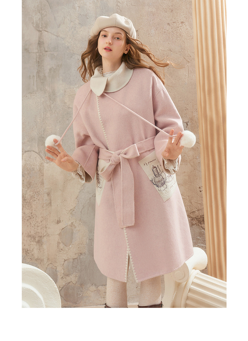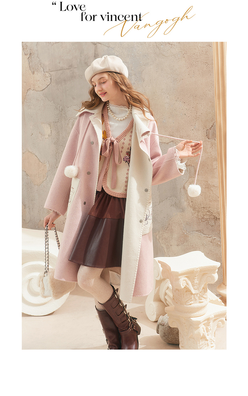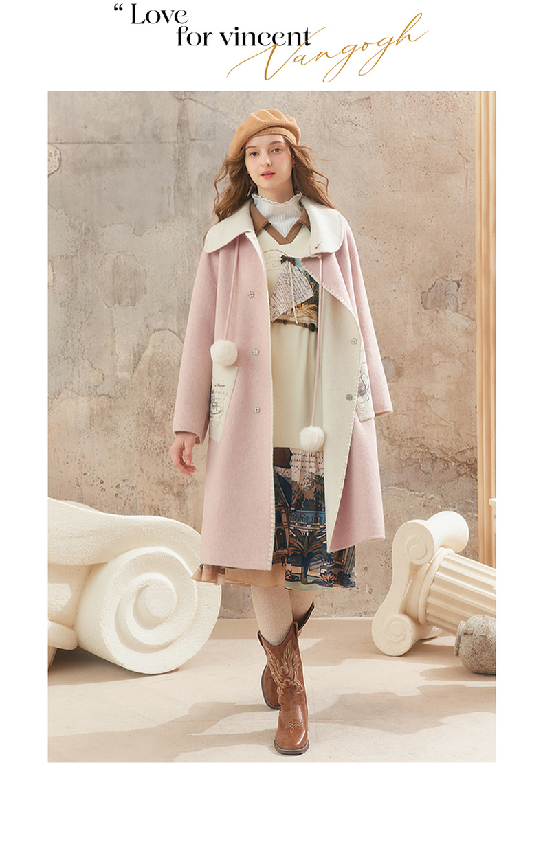 【暖冬内购】两三事梵高文艺甜梦絮语2025秋冬新款贴布绣绑带毛球双面呢外套女