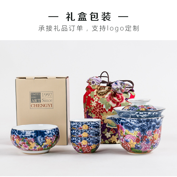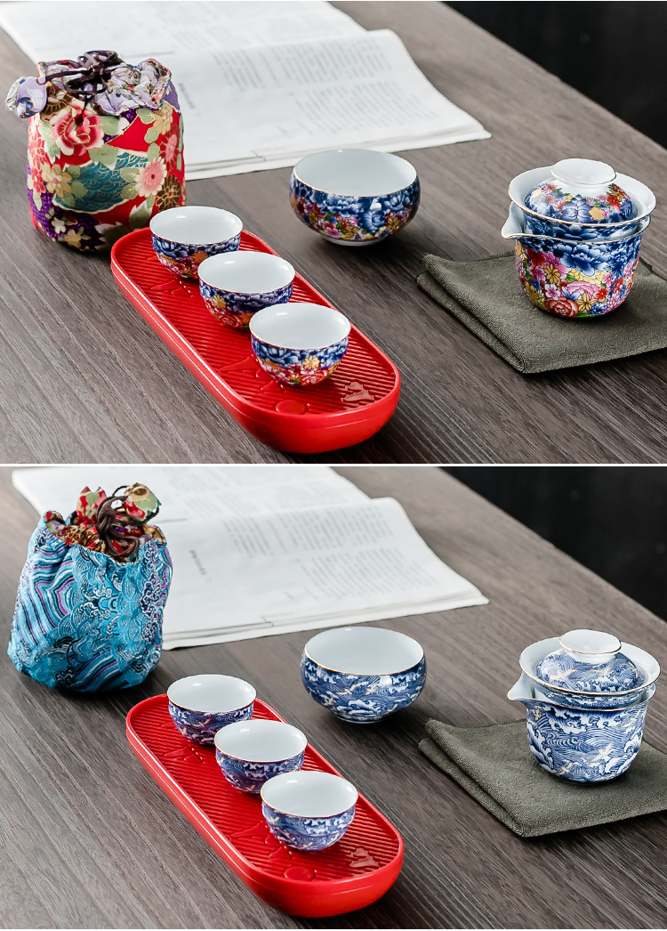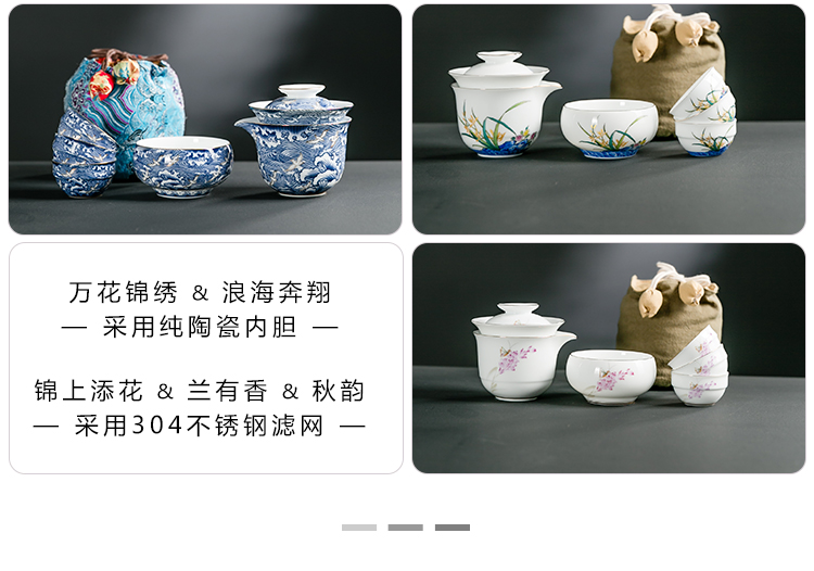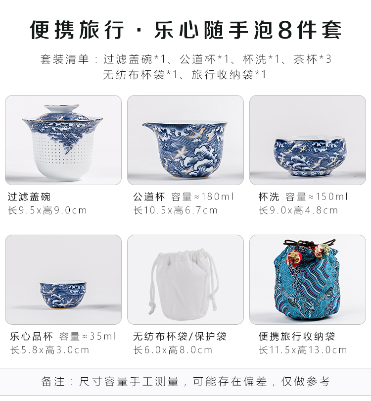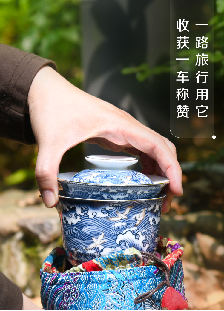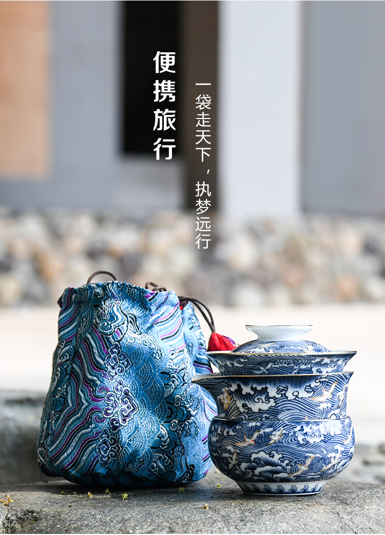 【样品特惠6.5折,仅2套,无原包装,无货退款】成艺青花瓷快客杯一壶三杯旅行功夫茶具便携包随身单人迷你泡茶壶锦上天花乐心随手泡【不支持补差,非质量问题不退不换】S
