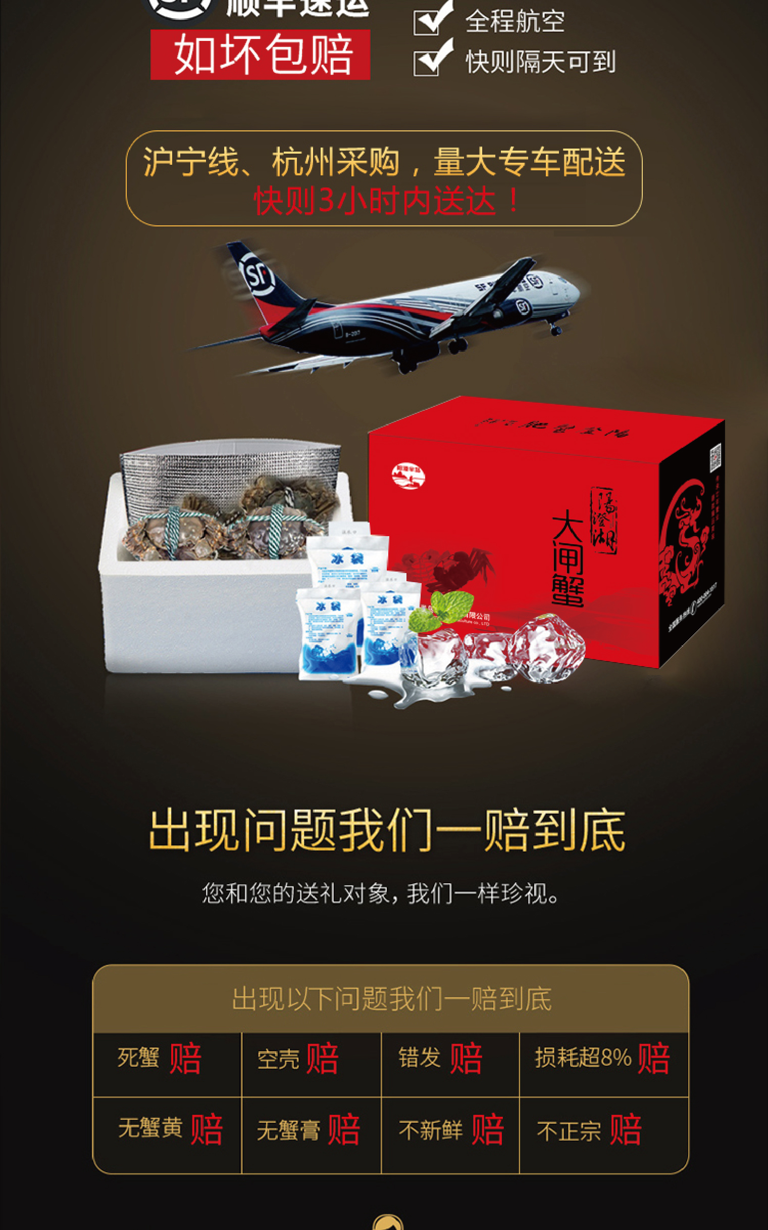 4、大闸蟹为鲜活水产品,收到货物请当场验收确认,如果有问题及时联系我们。售后服务台联系(收到蟹六小时内有效),并拍照为证(拍下照片传给我们),拍照时请把蟹肚子朝上,掰开蟹脐,以方便售后服务员确认。