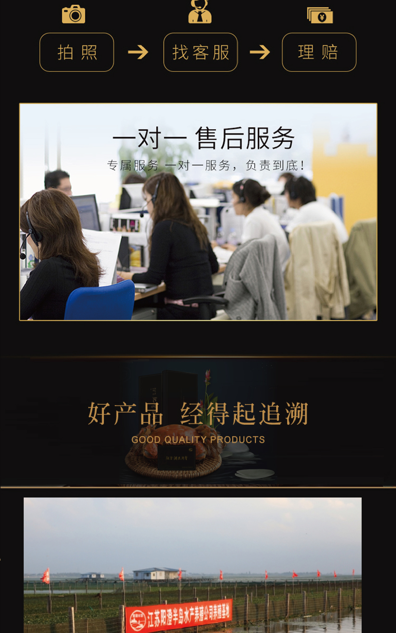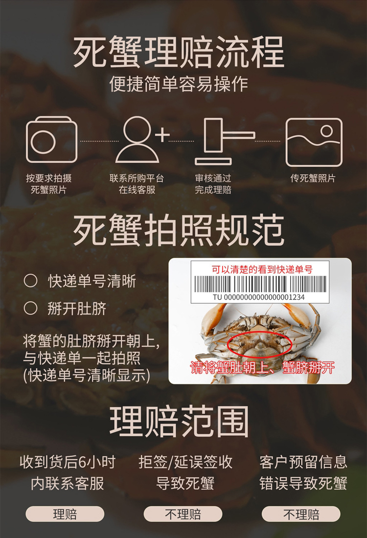 3、如仍无反应立即和售后服务台联系(收到整六小时内有效),并拍照为证(拍下照片传给我们),拍照时请把蟹肚子朝上,掰开蟹脐,以方便售后服务员确认。一经确认,我们会按死蟹等值赔款或者下次予以补发,让您选择!