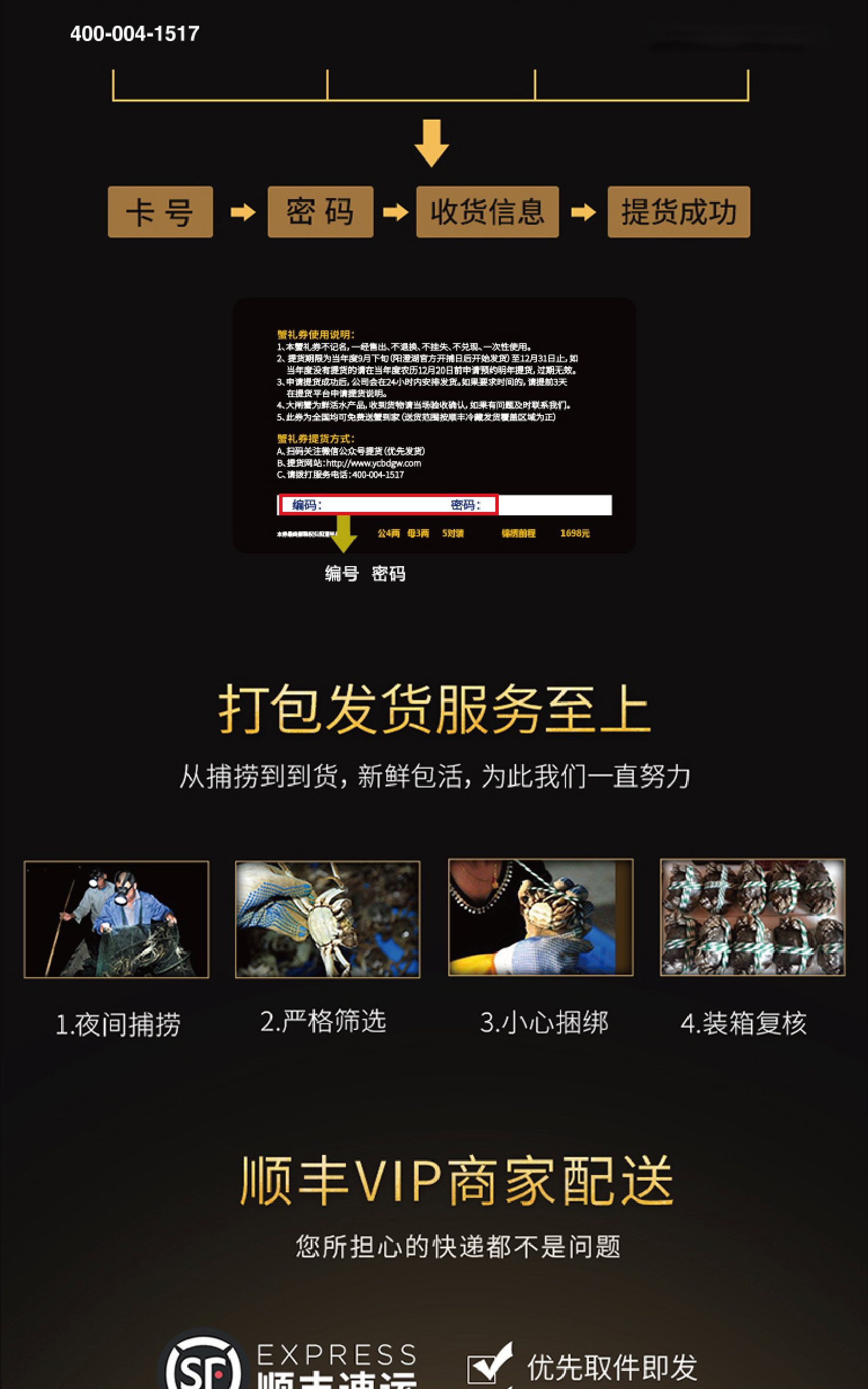 5、此券为全国均可免费送蟹到家(送货范围按顺丰冷藏发货覆盖区域为正)蟹礼券提货方式。