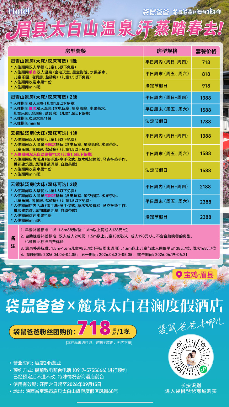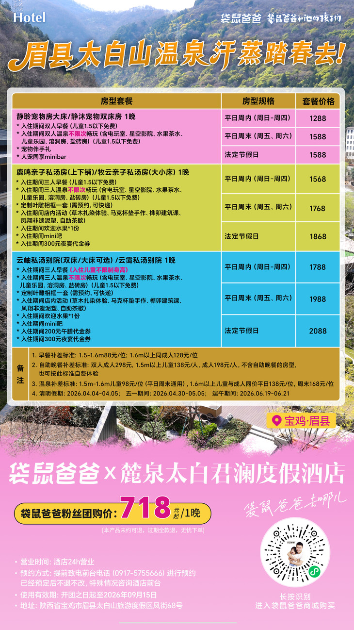 五一期间(2026.04.30-05.04)商城开团的【麓泉太白君澜度假酒店】开业预售特惠套餐已经约满,没有预定的小伙伴建议错峰出行,体验感更佳。如果没有预约上,随时可申请退款,无需担心。