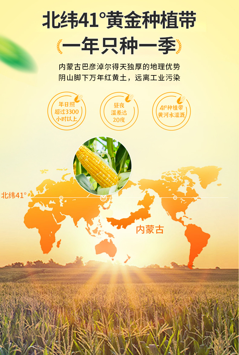 好玉米离不开好环境,这穗黑糯玉米源自北纬 41° 内蒙古黄金农业种植带 —— 这里全年光照长达 3200 小时,充足的日照让玉米积累了满满的糖分;昼夜温差大,锁住营养与风味;肥沃的有机质土壤搭配黄河水灌溉,为玉米生长提供了充足的天然养分,也让它的口感和香气更出众。