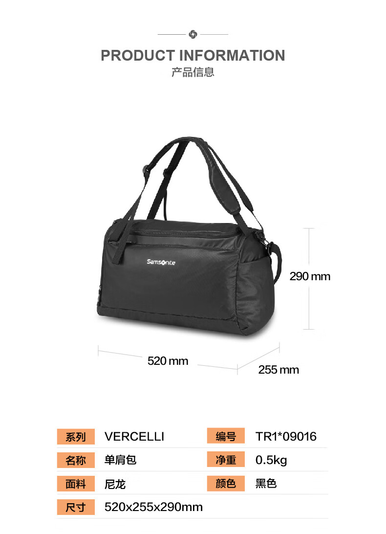 【多样屋专柜】新秀丽健身包男女轻便短途行李包 大容量手提单肩多功能旅行袋
