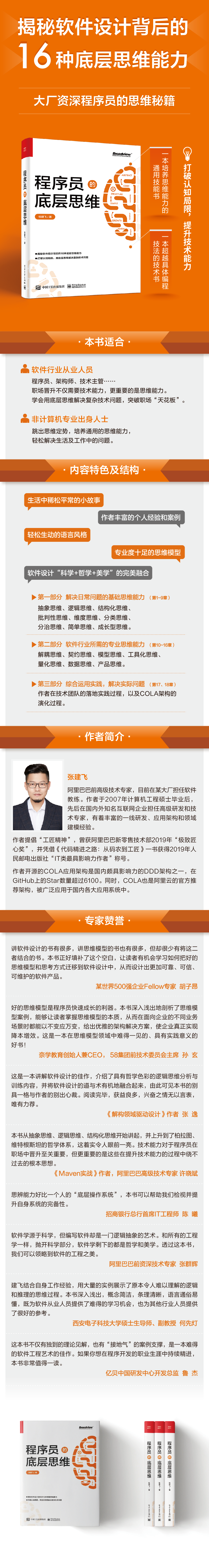 张建飞,阿里巴巴前高级技术专家,目前在某大厂担任软件教练。作者于2007年计算机工程硕士毕业后,先后在国内外知名互联网企业担任高级研发和技术专家,有着丰富的一线研发、应用架构和领域建模经验。作者提倡“工匠精神”,曾获阿里巴巴新零售技术部2019年“**匠心奖”,并凭借《代码精进之路:从码农到工匠》一书获得2019年人民邮电出版社“IT类*具影响力作者”称号。作者开源的COLA应用架构是国内颇具影响力的DDD架构之一,在GitHub上的Star数量超过6100。同时,COLA也是阿里云的官方推荐架构,被广泛应用于国内各大应用系统中。