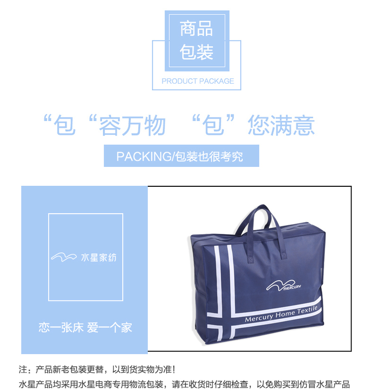 1、关于枕套花型:由于面料裁剪的原因,可能会造成枕套的花纹跟实物图有所区别 2、因拍摄时的光线及显示器的不同,会造成一定的色差 3、关于包装:为增强竞争力,公司会不定期更新部分产品外包装,产品包装以收到实物为准。产品图片实物拍摄,以上问题均不属于质量问题, 不能接受的买家慎重考虑。如有疑义可咨询客服,谢谢!