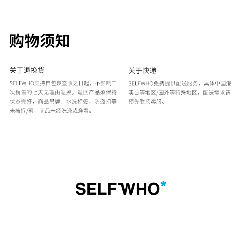 - SELFWHO——将街头文化融入高级成衣,以服装为载体,用廓形、解构设计和艺术意象探寻极致的生活方式。特立独行,知行合一,TO BE YOURSELF。