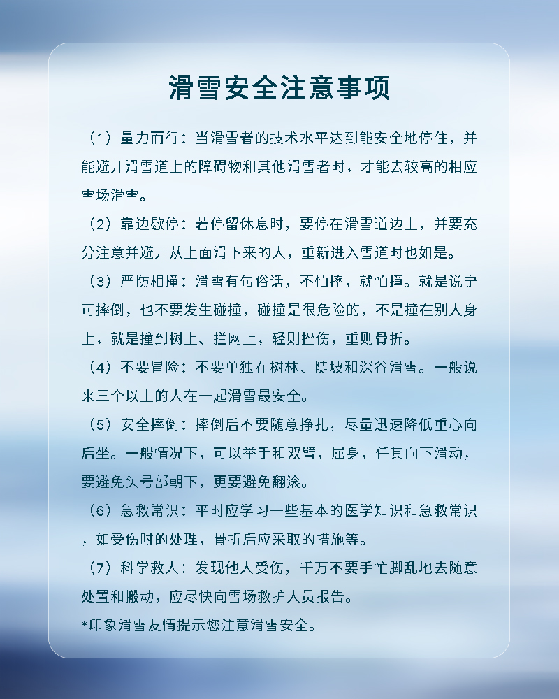 4)保险:赠送意外保险,以报名时提交的身份信息为准!(注:滑雪属于高危户外运动,风险系数较高!如发生意外,本俱乐部协助保险理赔,保险公司免赔部分及额外花费需要由个人承担,请报名前知悉。)