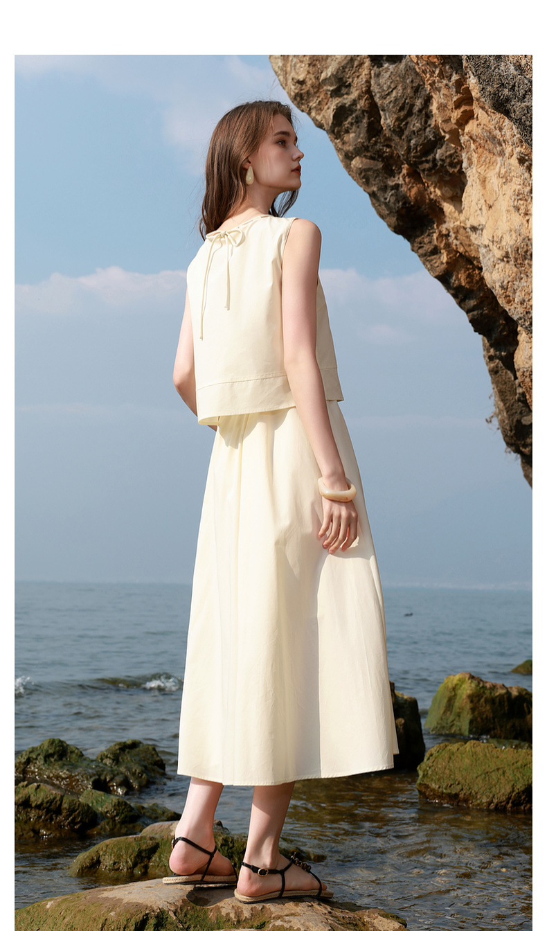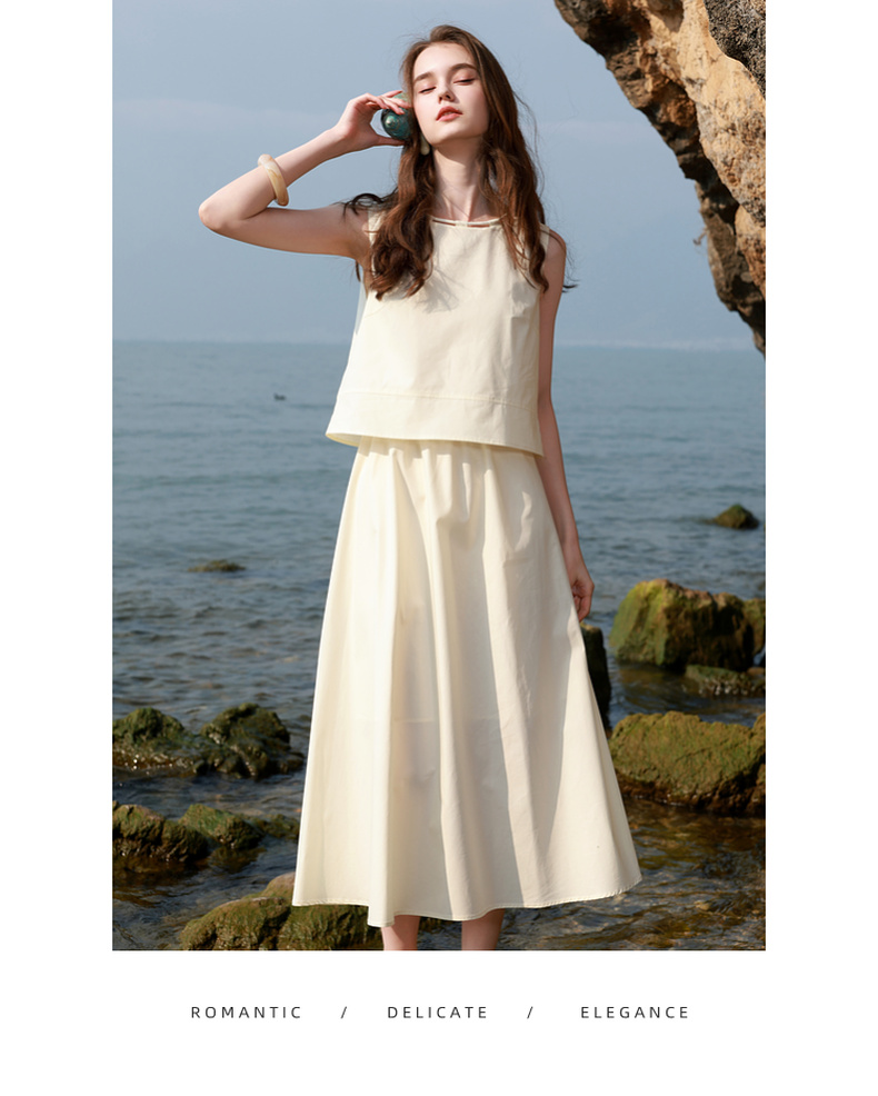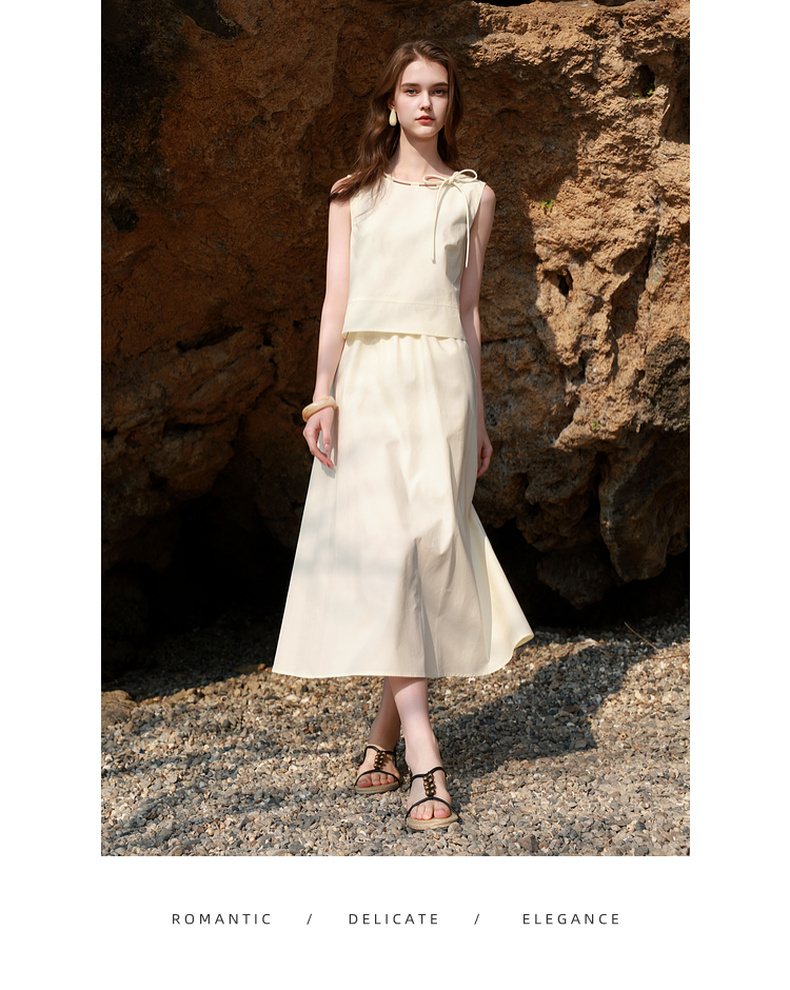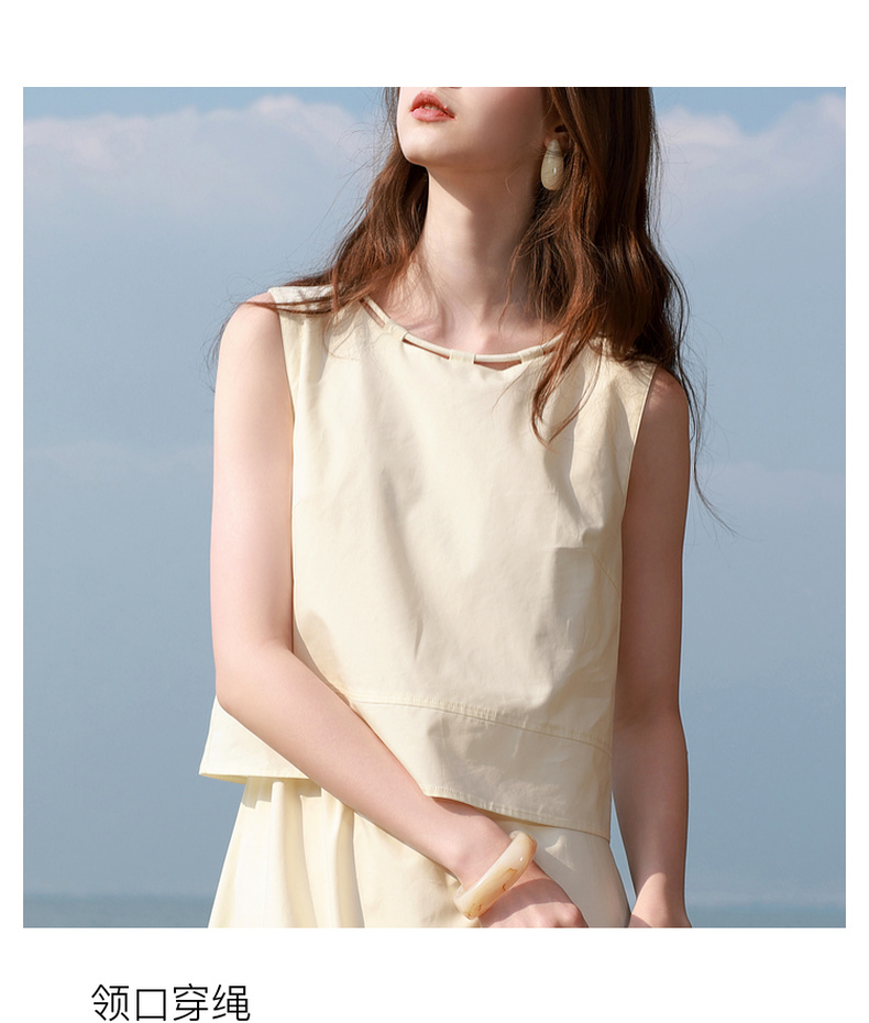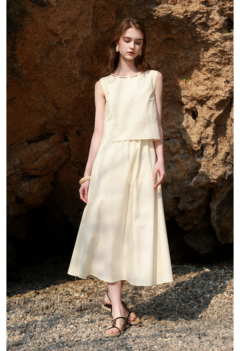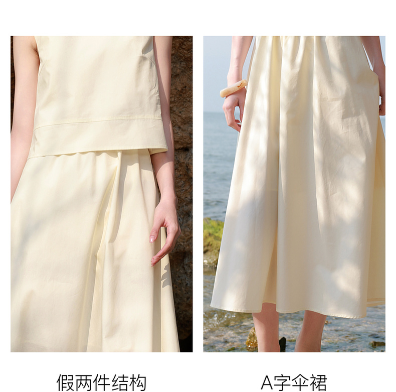 三彩2025夏季新款假两件连衣裙圆领无袖收腰A字裙伞裙优雅M