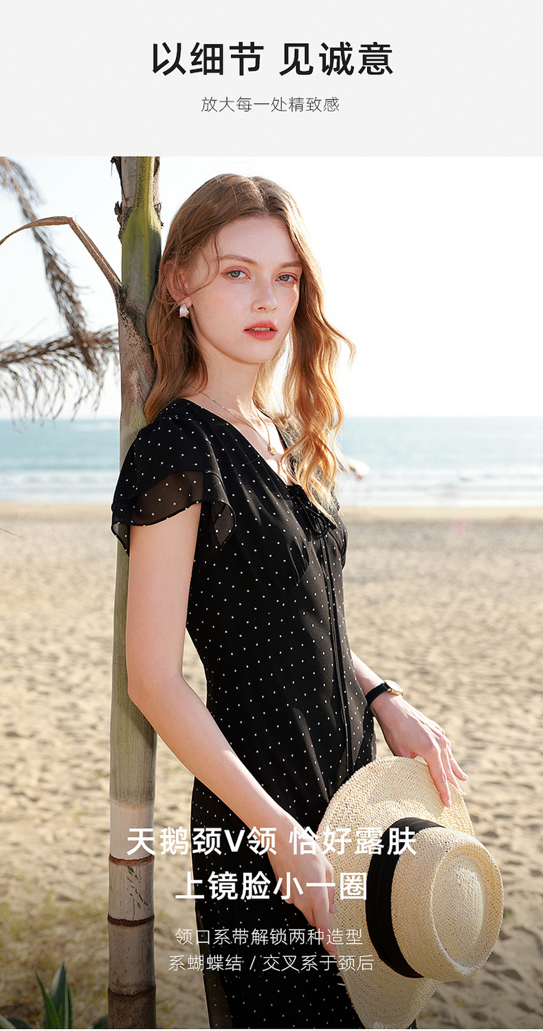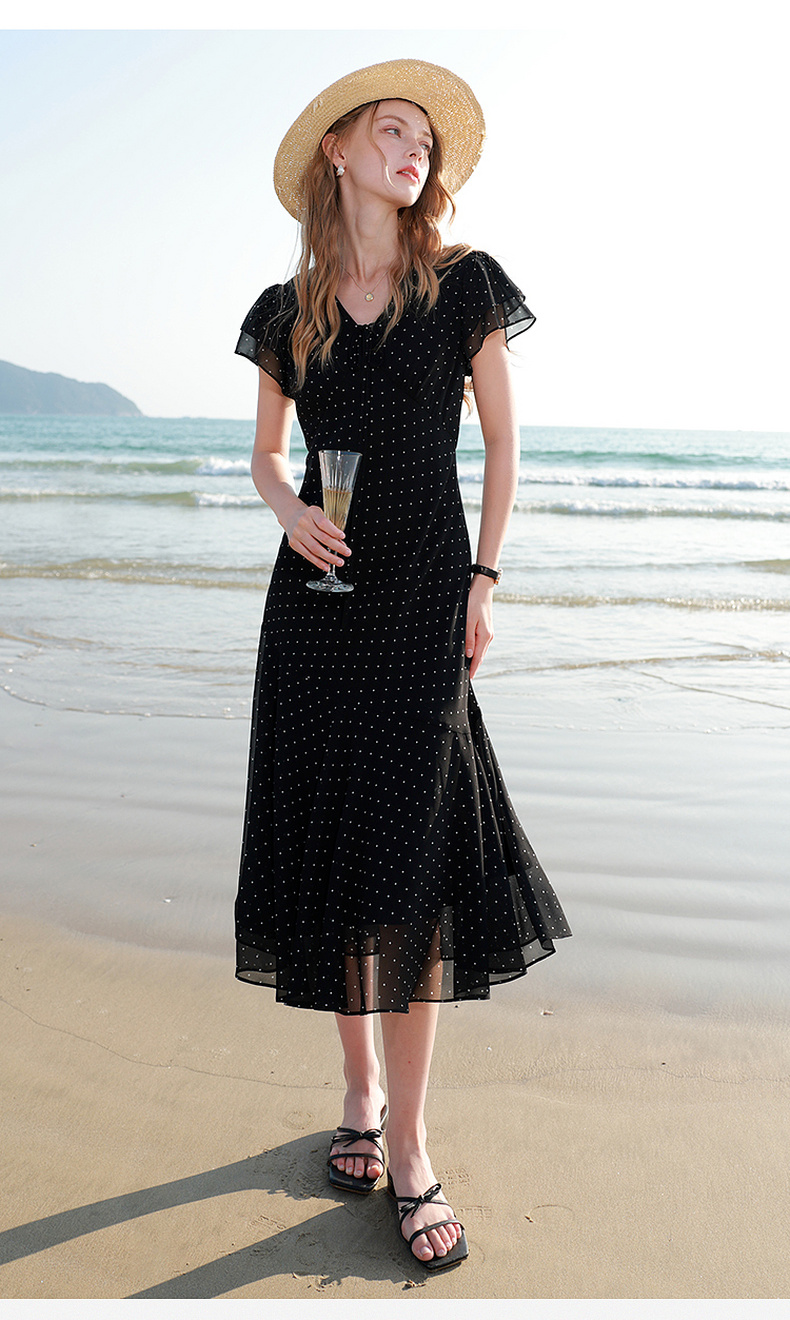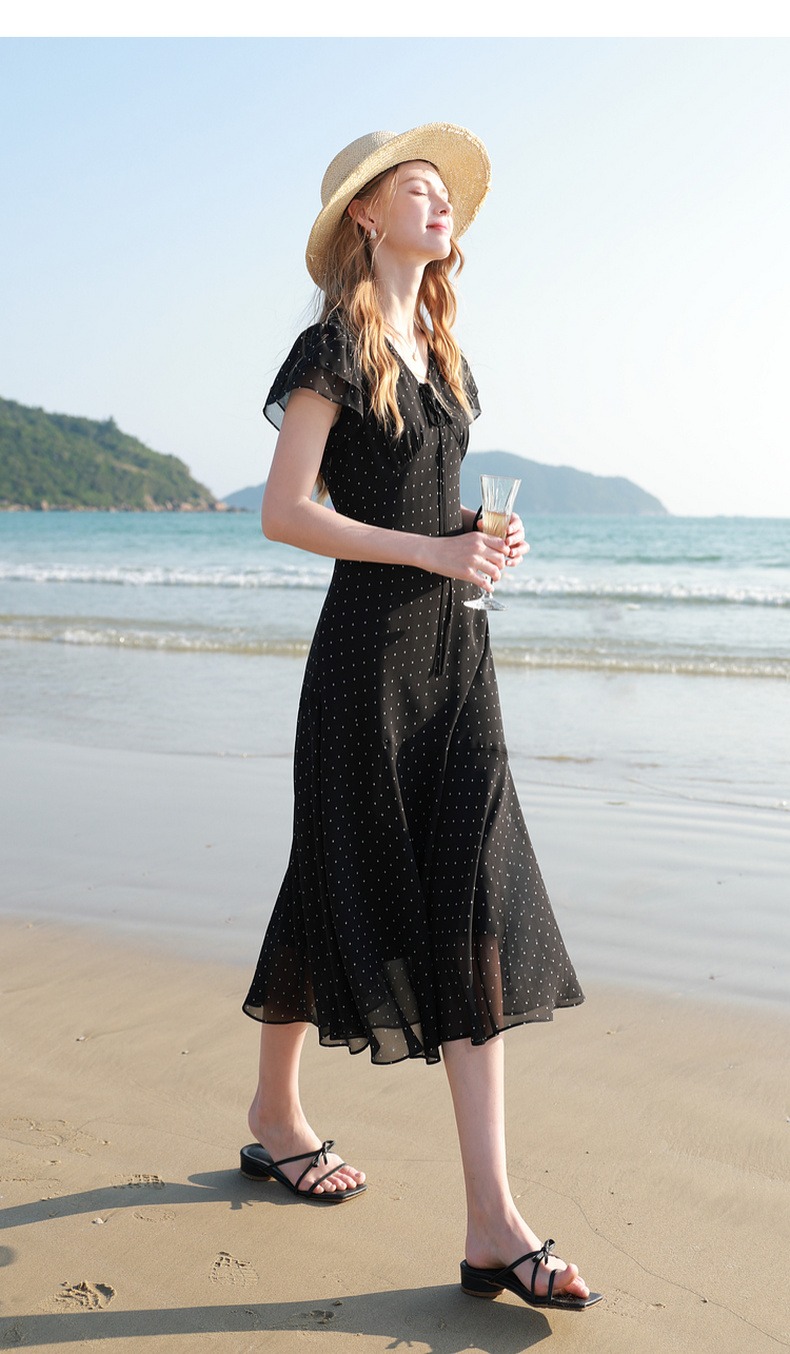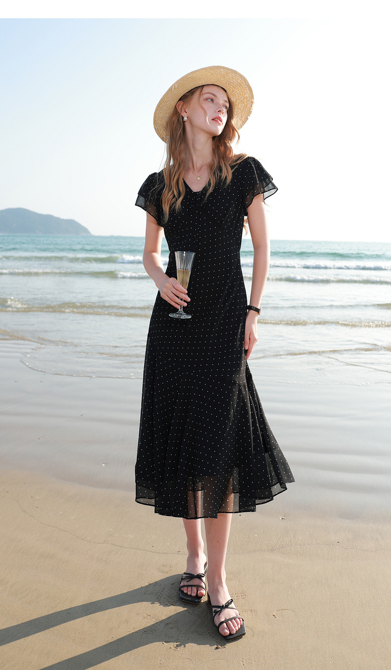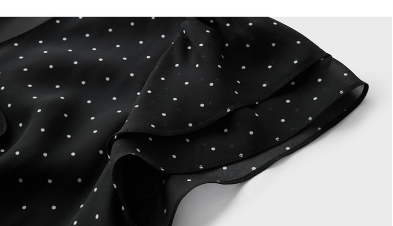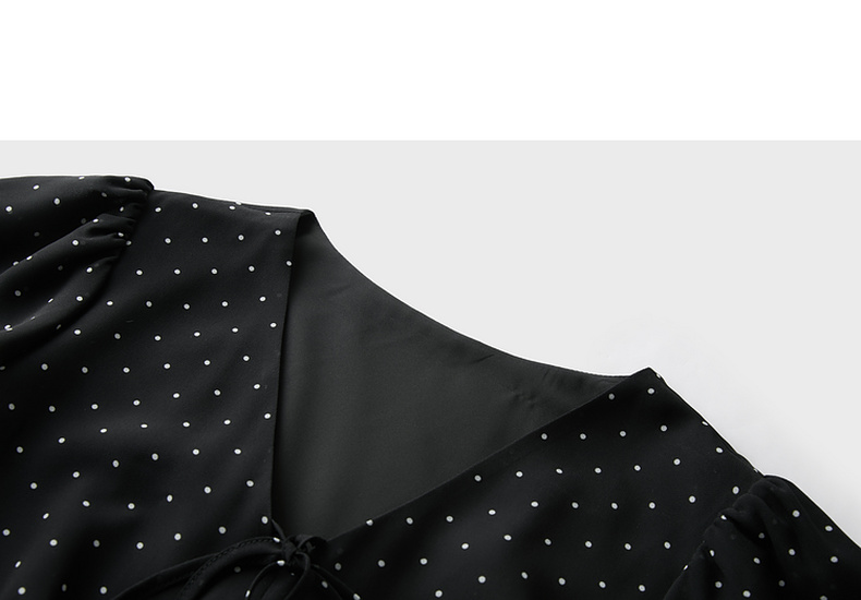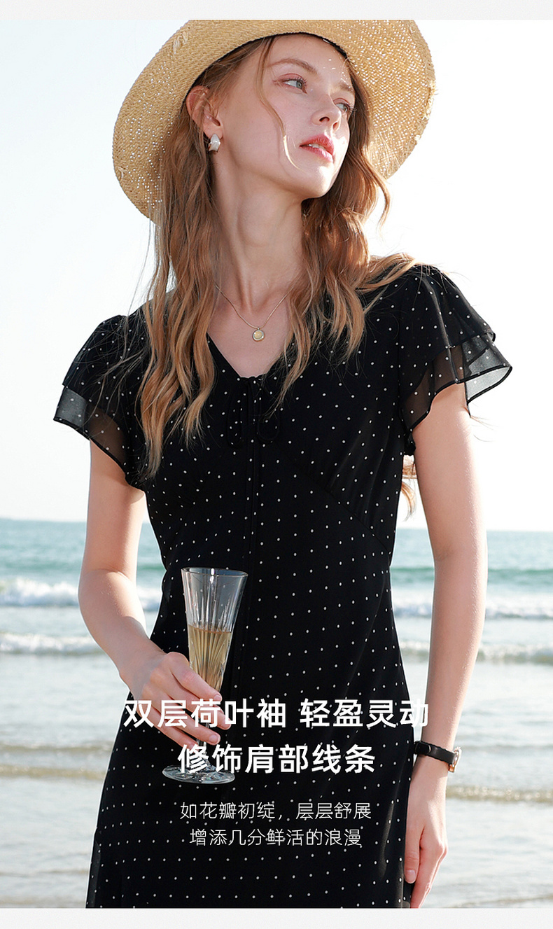 三彩2026春季新款法式波点小黑裙V领A字雪纺裙连衣裙荷叶袖长裙M