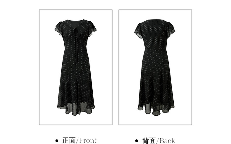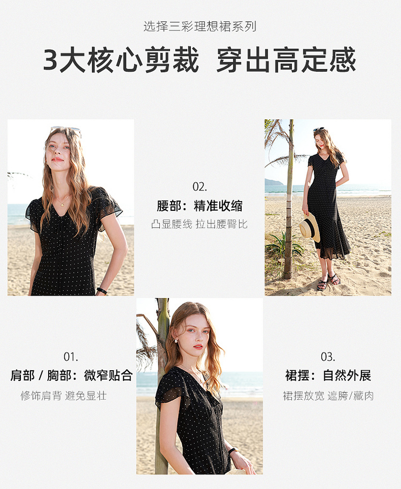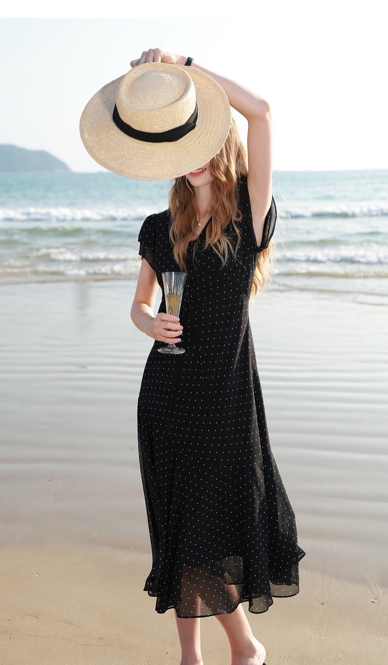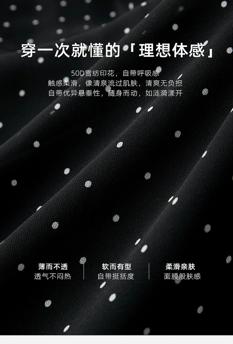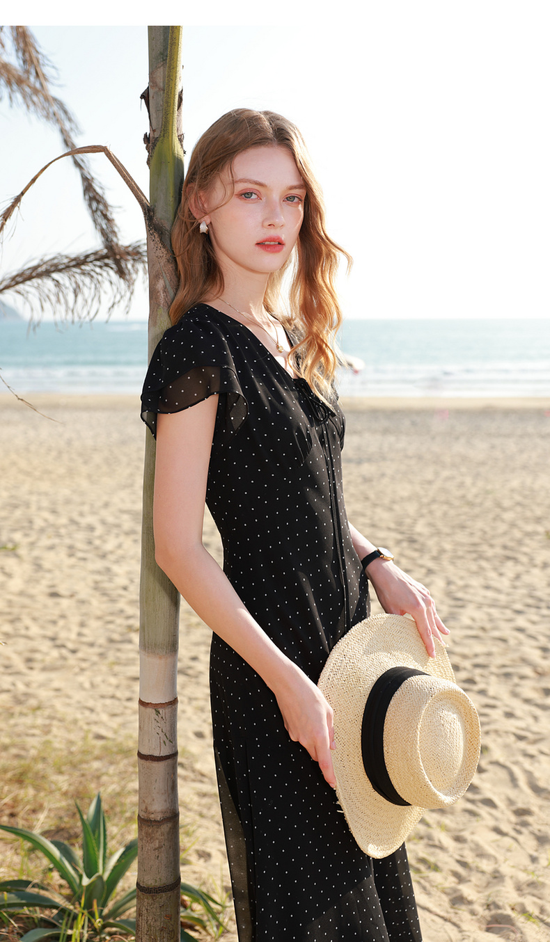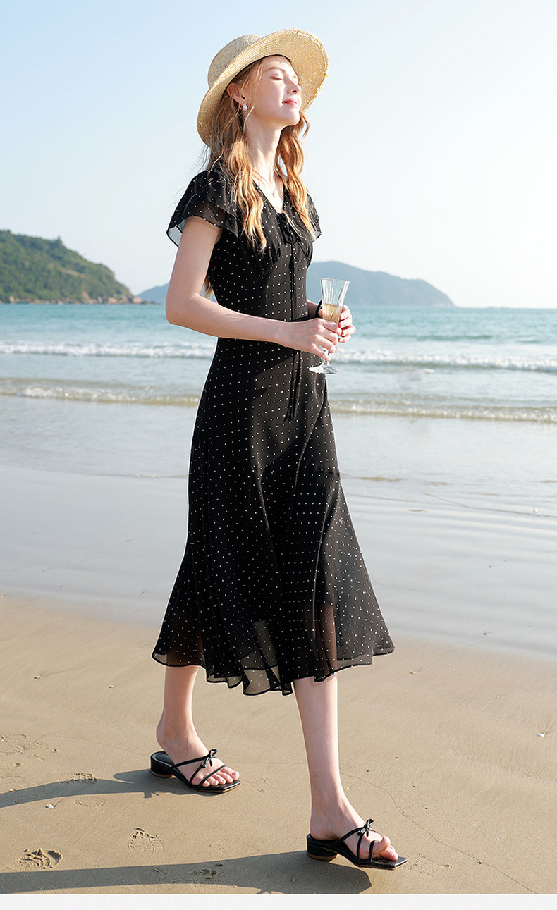 三彩2026春季新款法式波点小黑裙V领A字雪纺裙连衣裙荷叶袖长裙M