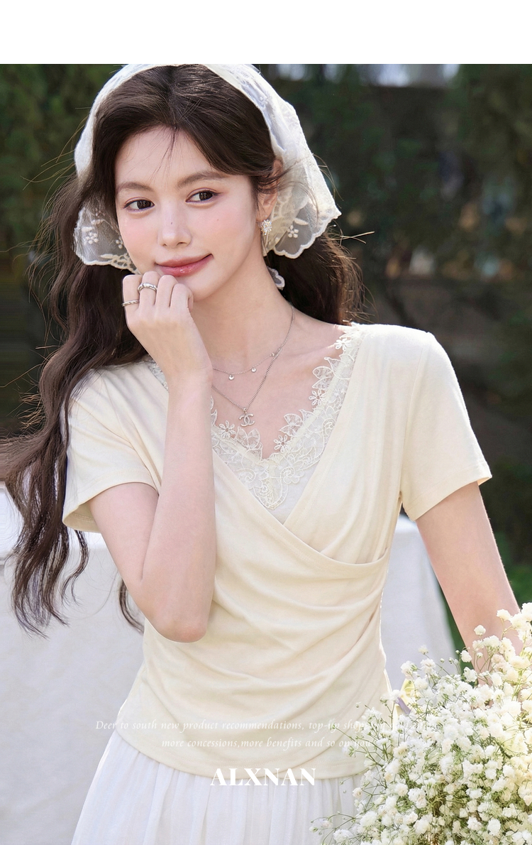 鹿向南「桃风粉絮」淡粉色短袖T恤女夏洋气通勤修身收腰褶皱上衣