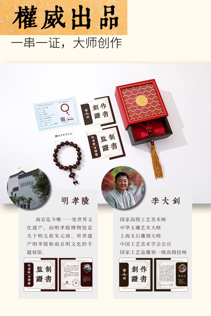 小叶紫檀手串均配有检定证书、博物馆监制证书和杨大钊老师创作证书,一串一证,支持复检,放心入手。