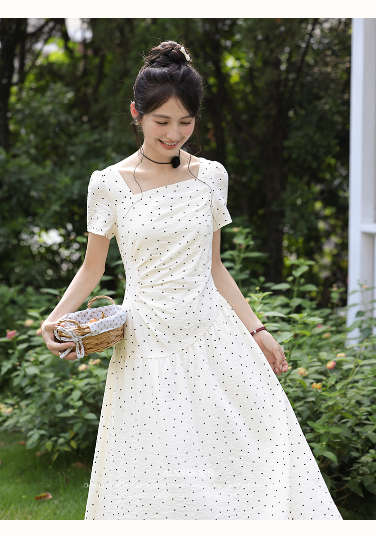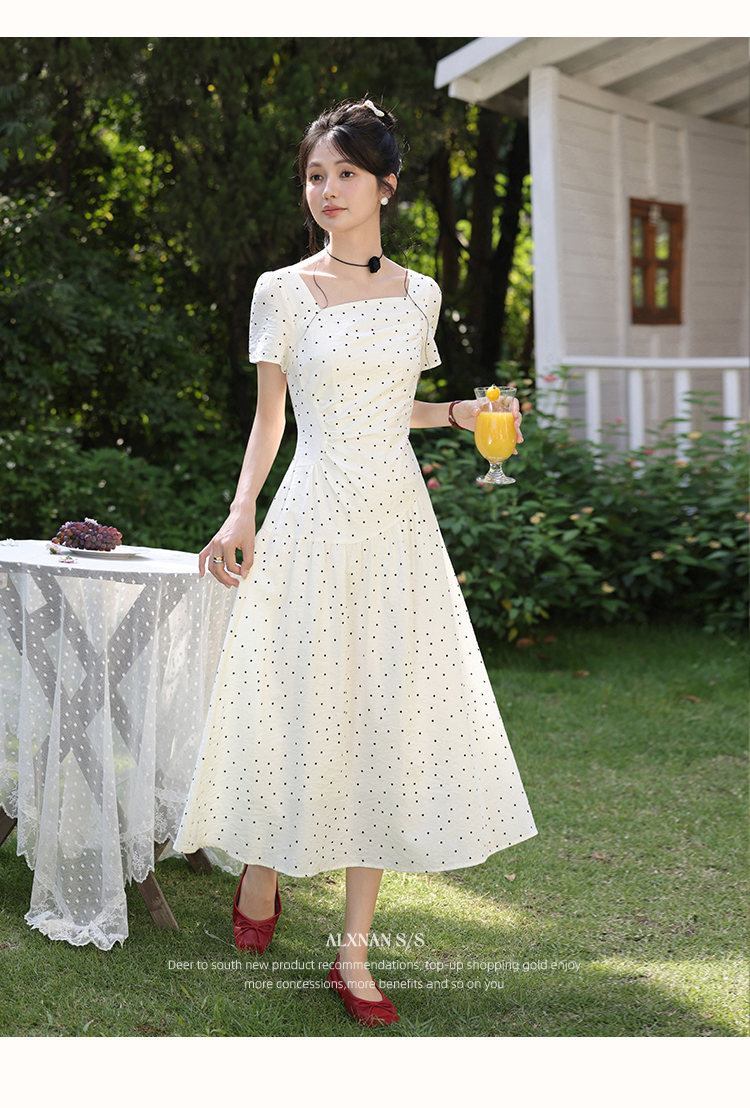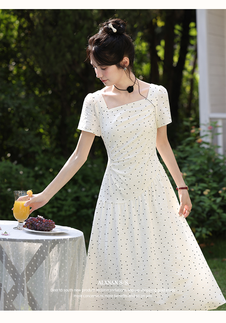 【65折秒杀】鹿向南「南法少女」优雅法式短袖波点连衣裙女夏复古收腰方领长裙DYL661831