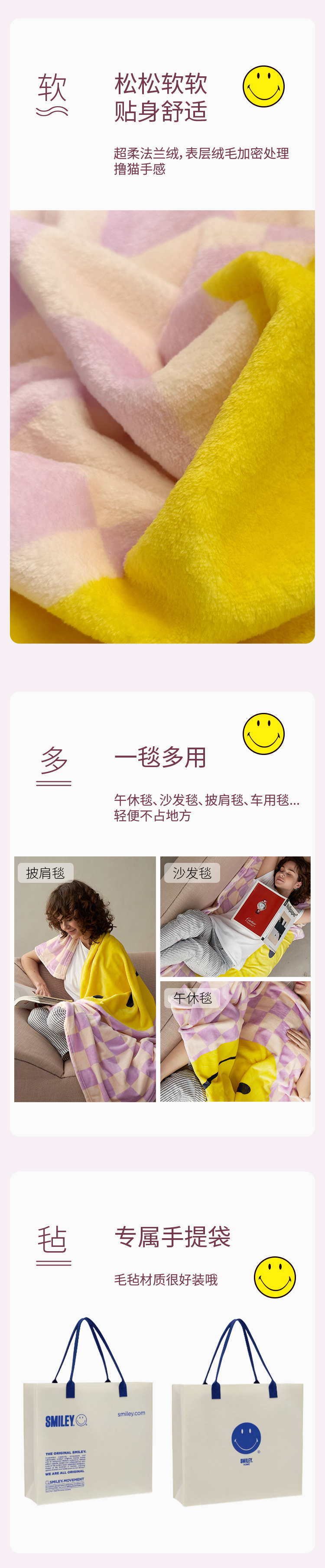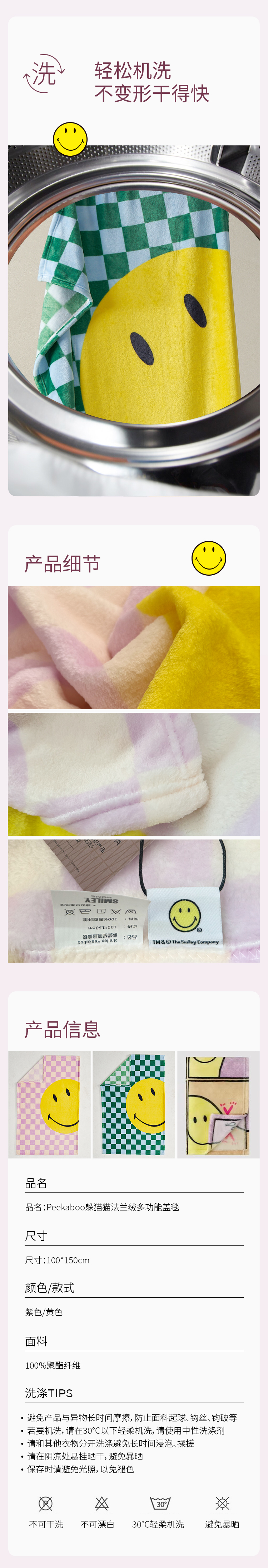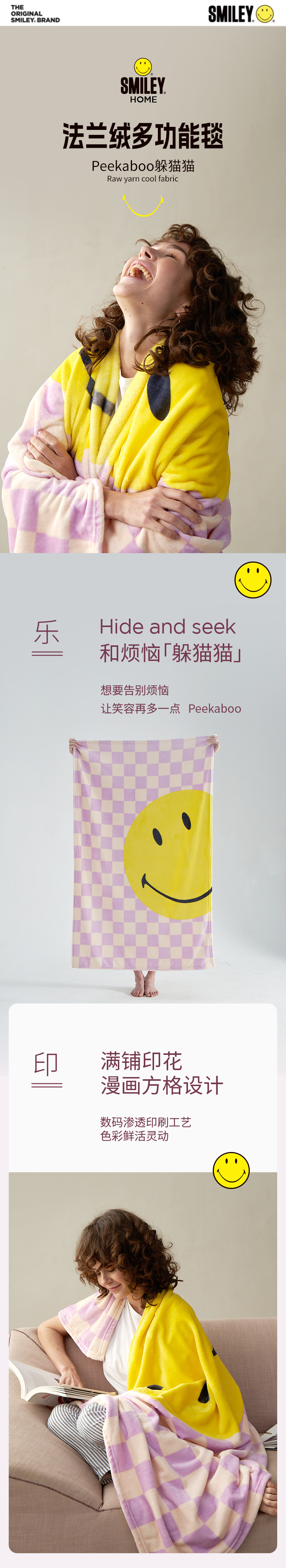 商品签收后【双面法兰绒紫色 礼品袋装】主推款Smiley躲猫猫笑脸盖毯100*150cm,海南/甘肃/青海/宁夏/内蒙古 15元/件,新疆/西藏 30元/件,按件续重。退仅运费差价❗️❗️