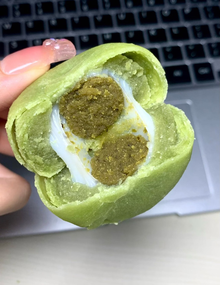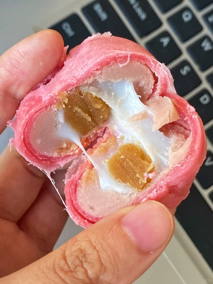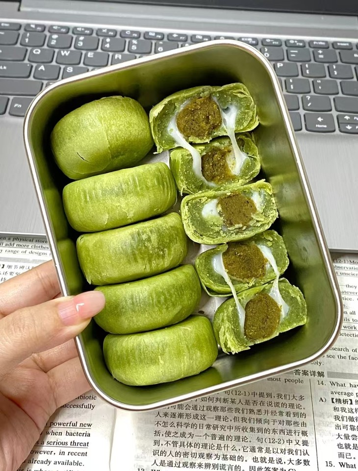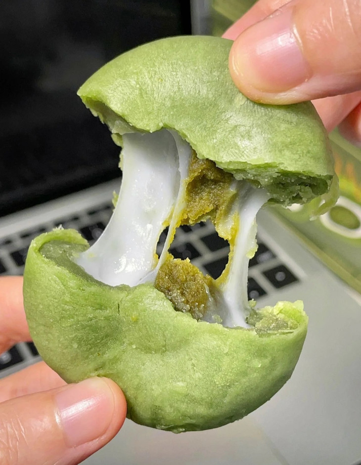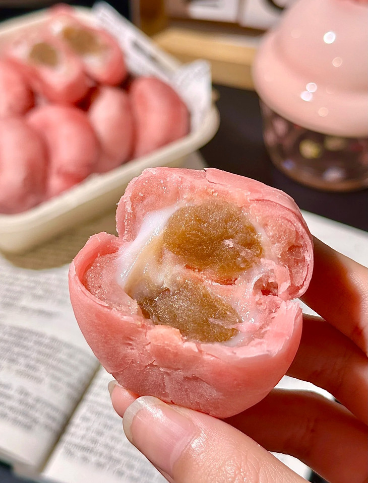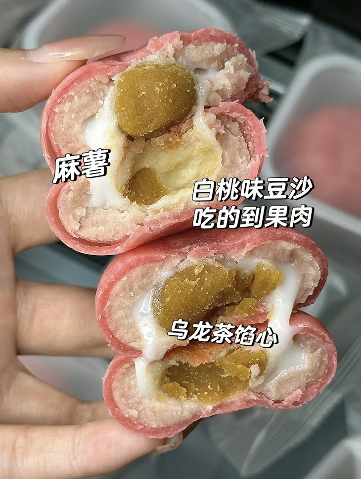 清新粉看起来尊嘟很zhi愈 闻起来是奶奶的茶香味 酥皮层层掉渣 里面包的是软软糯糯的白芸豆泥🥜 和长拉丝的麻薯➕糯叽叽的口感!! 外皮和麻薯甜度很低 刚好和豆沙的甜度中和 吃起来不会腻 微微加热30s☝️️内馅更糯 拉丝更长