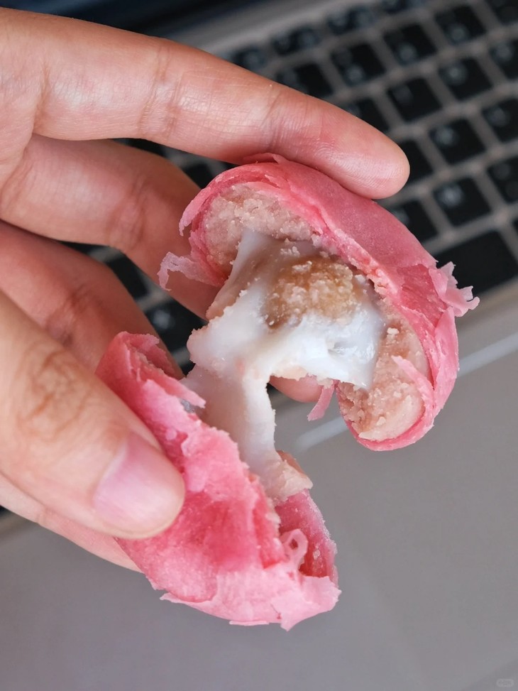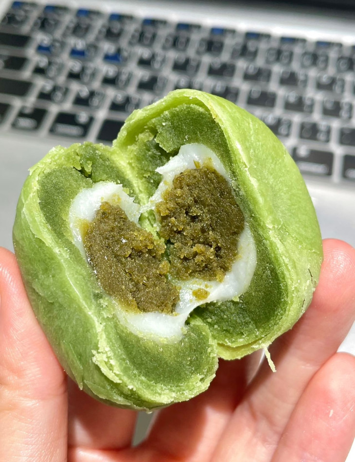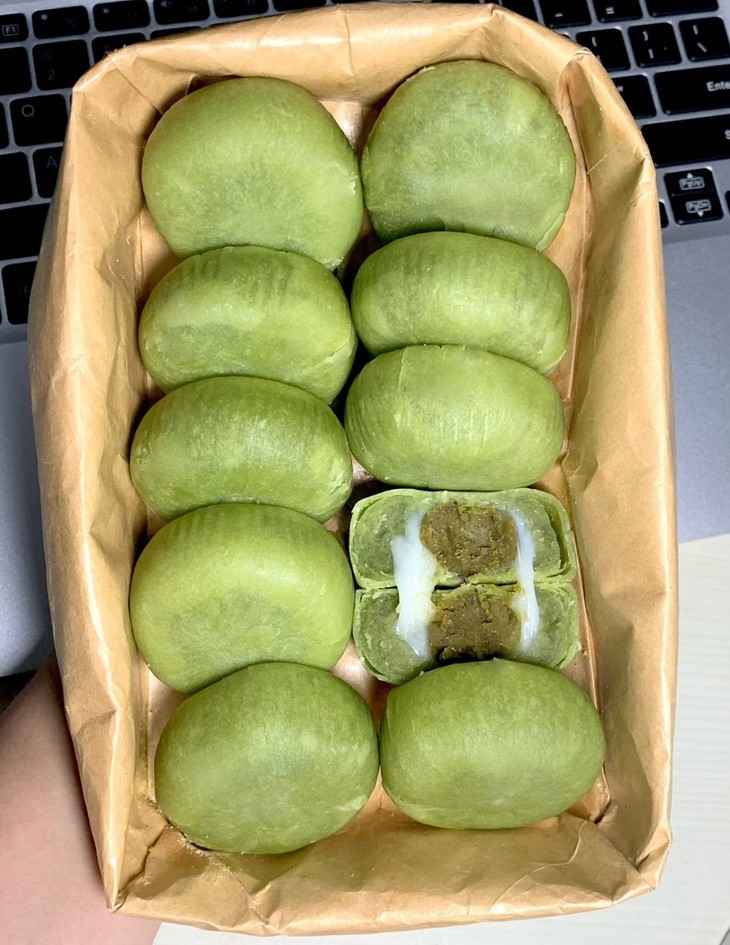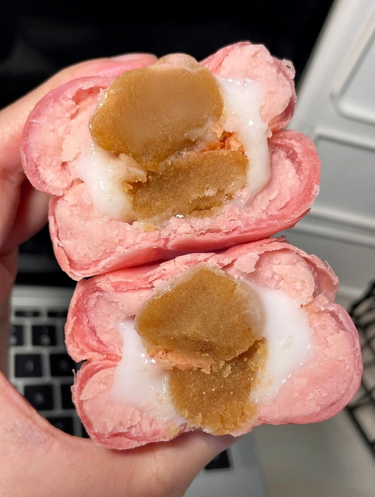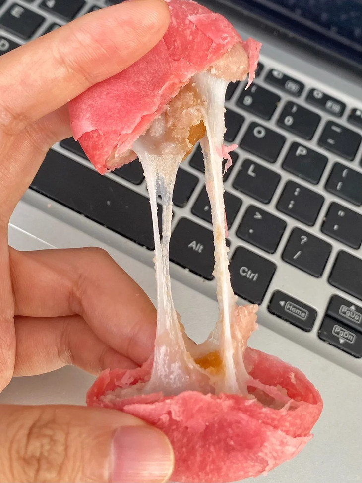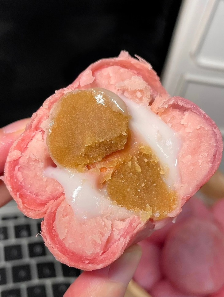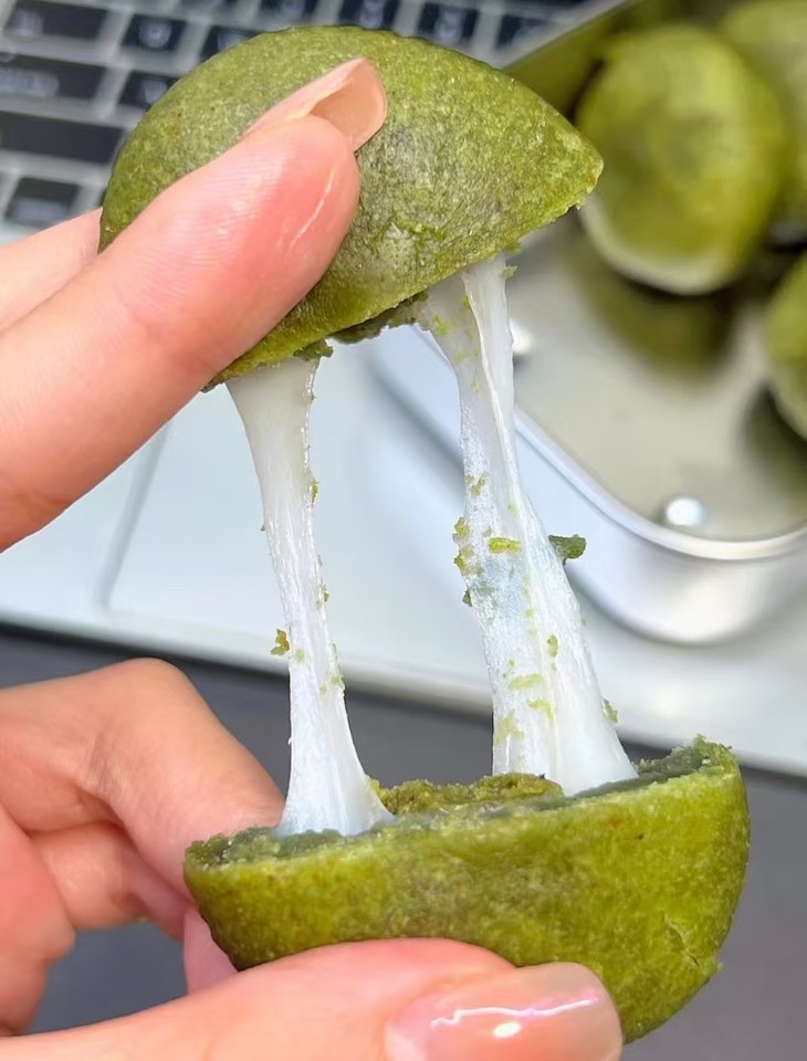 清新粉看起来尊嘟很zhi愈 闻起来是奶奶的茶香味 酥皮层层掉渣 里面包的是软软糯糯的白芸豆泥🥜 和长拉丝的麻薯➕糯叽叽的口感!! 外皮和麻薯甜度很低 刚好和豆沙的甜度中和 吃起来不会腻 微微加热30s☝️️内馅更糯 拉丝更长