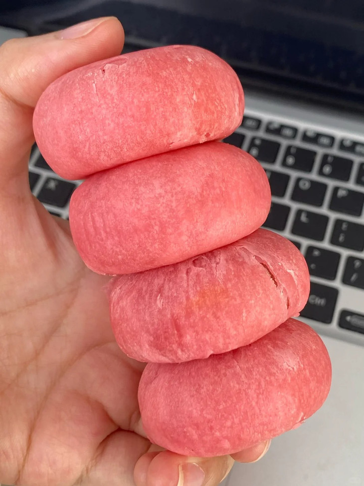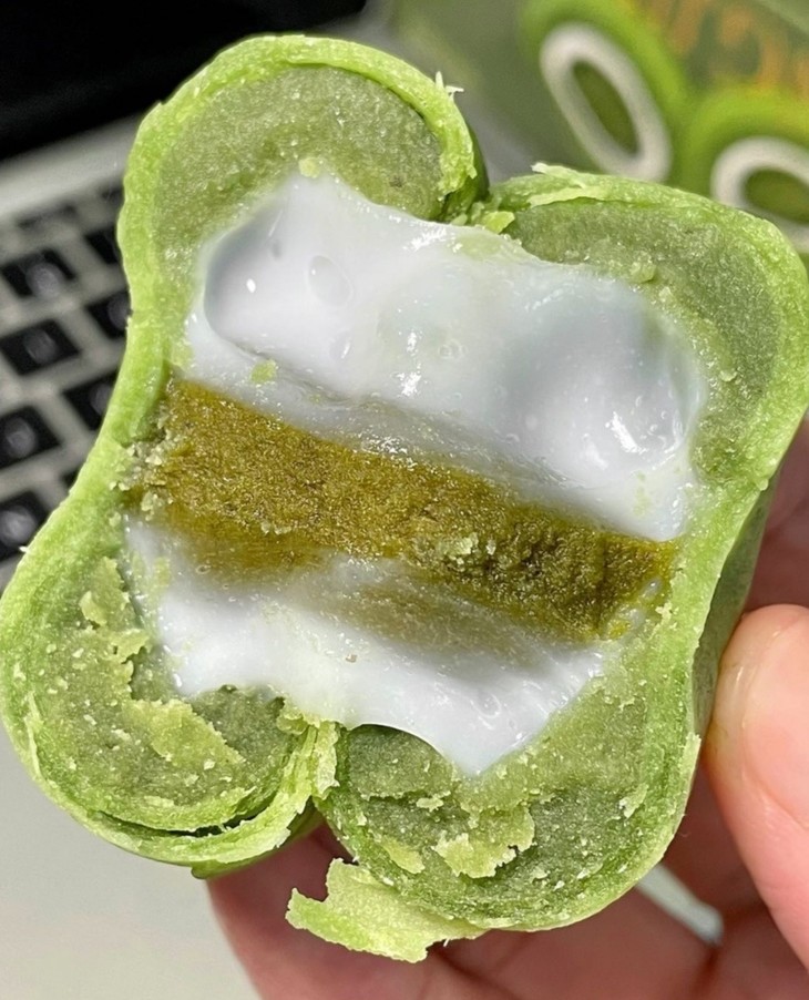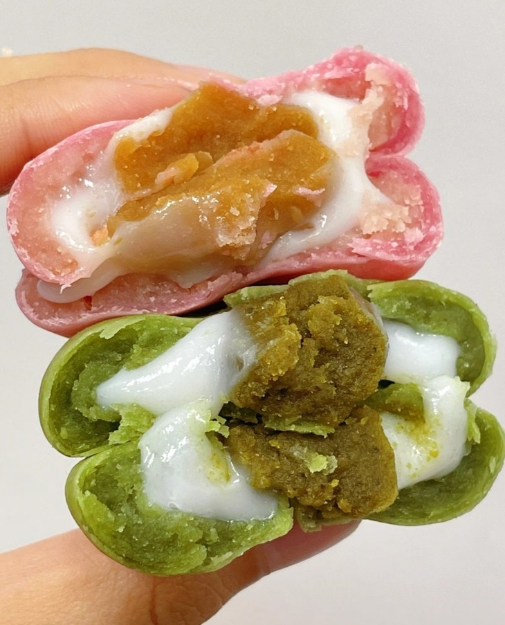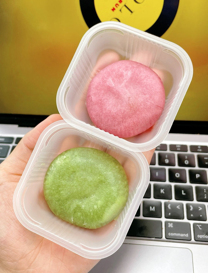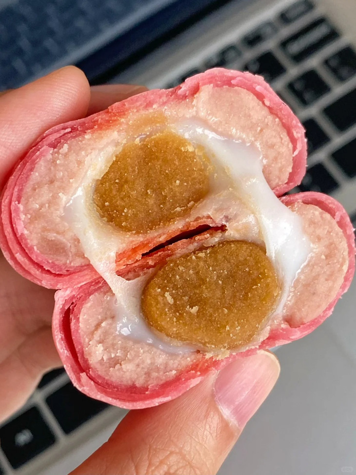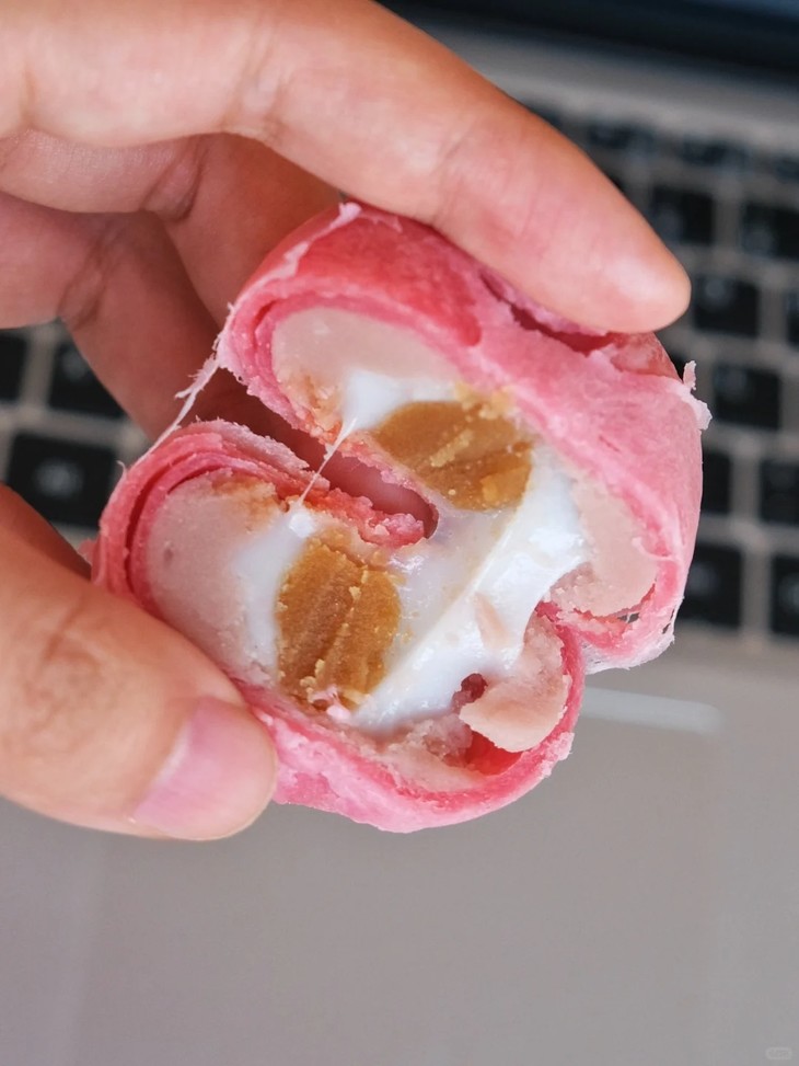 清新粉看起来尊嘟很zhi愈 闻起来是奶奶的茶香味 酥皮层层掉渣 里面包的是软软糯糯的白芸豆泥🥜 和长拉丝的麻薯➕糯叽叽的口感!! 外皮和麻薯甜度很低 刚好和豆沙的甜度中和 吃起来不会腻 微微加热30s☝️️内馅更糯 拉丝更长