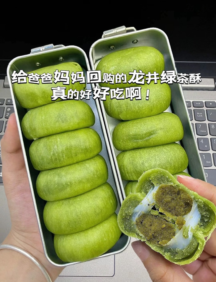 一口咬下 酥得掉渣!!跟咱平时吃的桃酥似的😋 再嚼一嚼 那股龙井的清香就出来了🍵 咬一口里面的馅料软乎乎 味道清甜不腻🥰 紧接着一股清新茶香在嘴里散开 口感又酥又绵!! 就像小时候吃的糕点🍪对味了 吃着解馋又解腻
