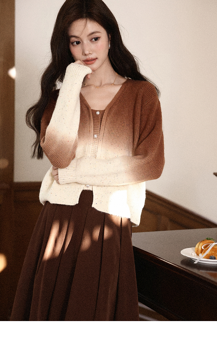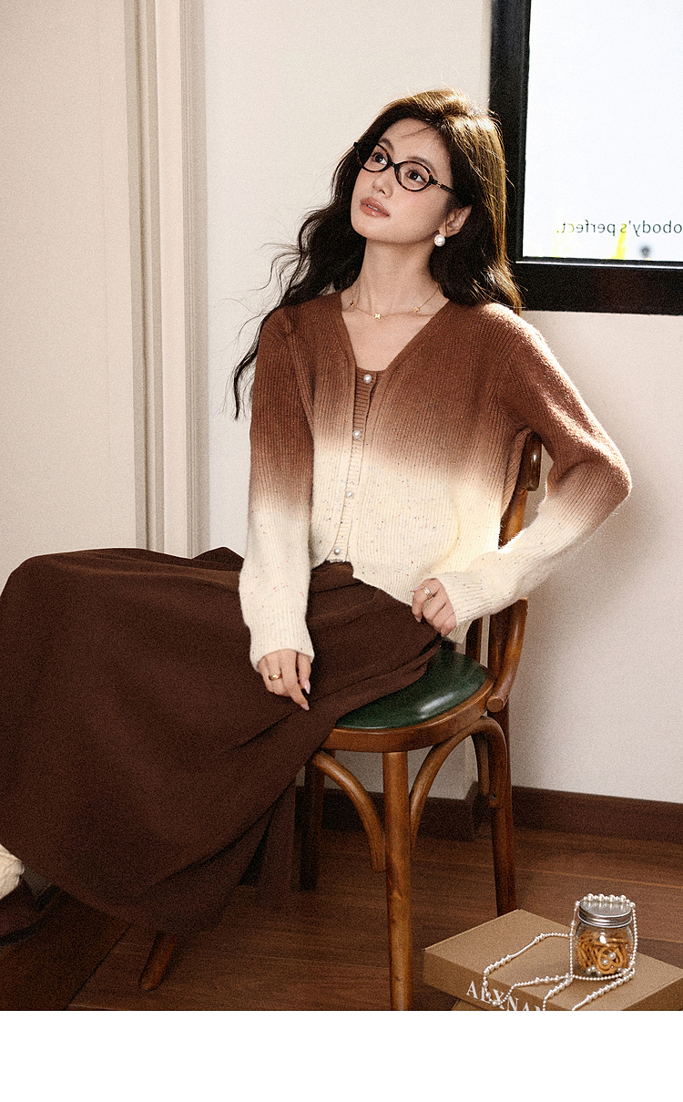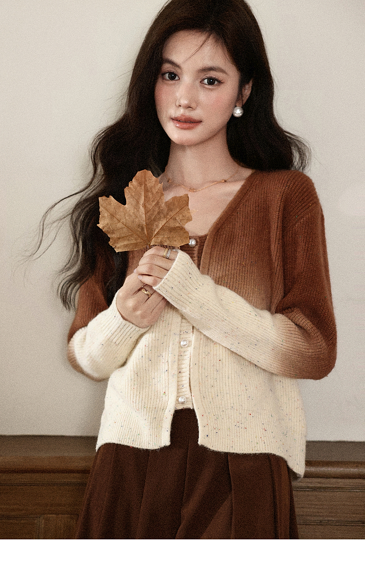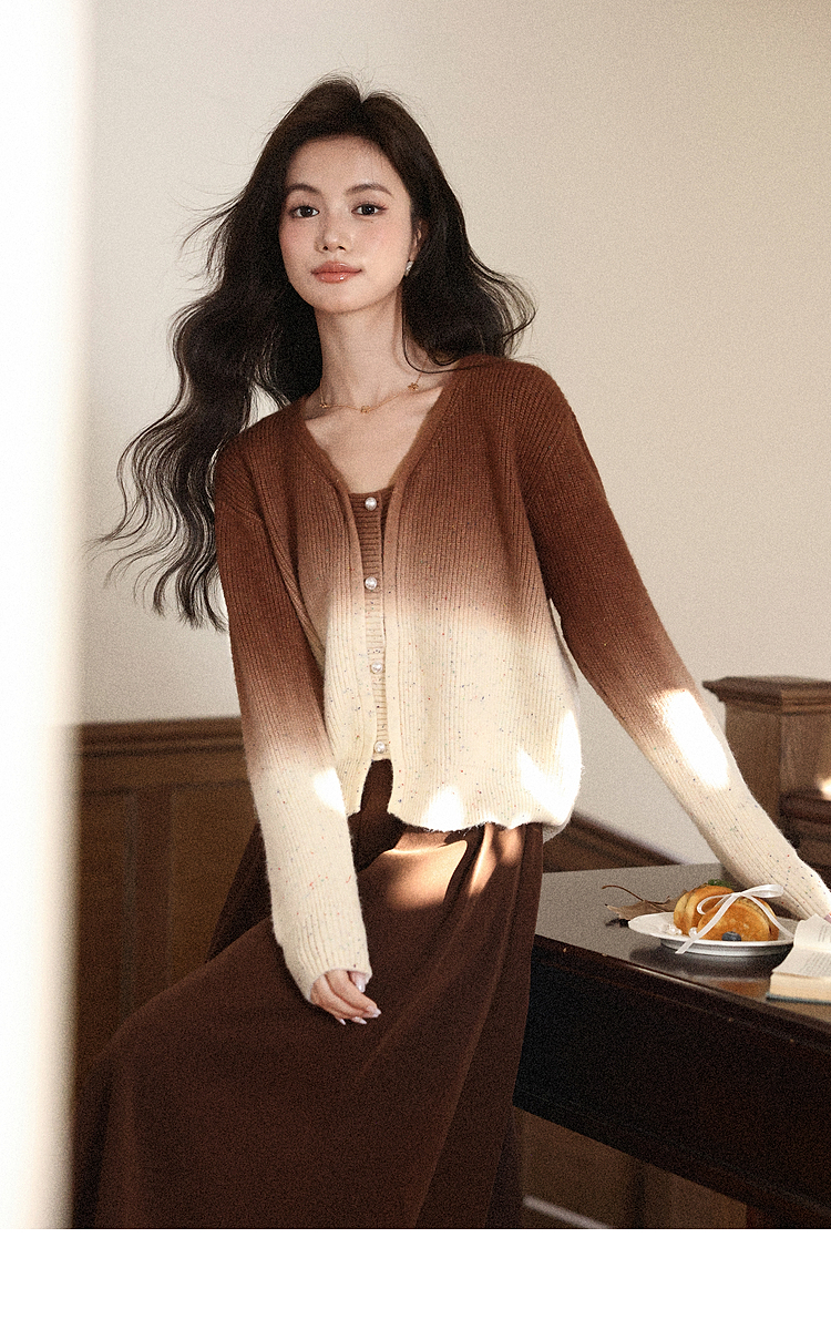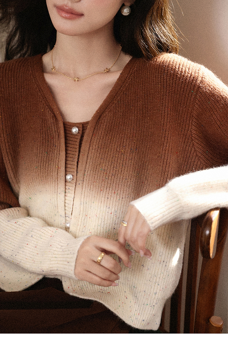 鹿向南「奶白慕斯」渐变咖色V领长袖毛衣女秋新款宽松通勤上衣女