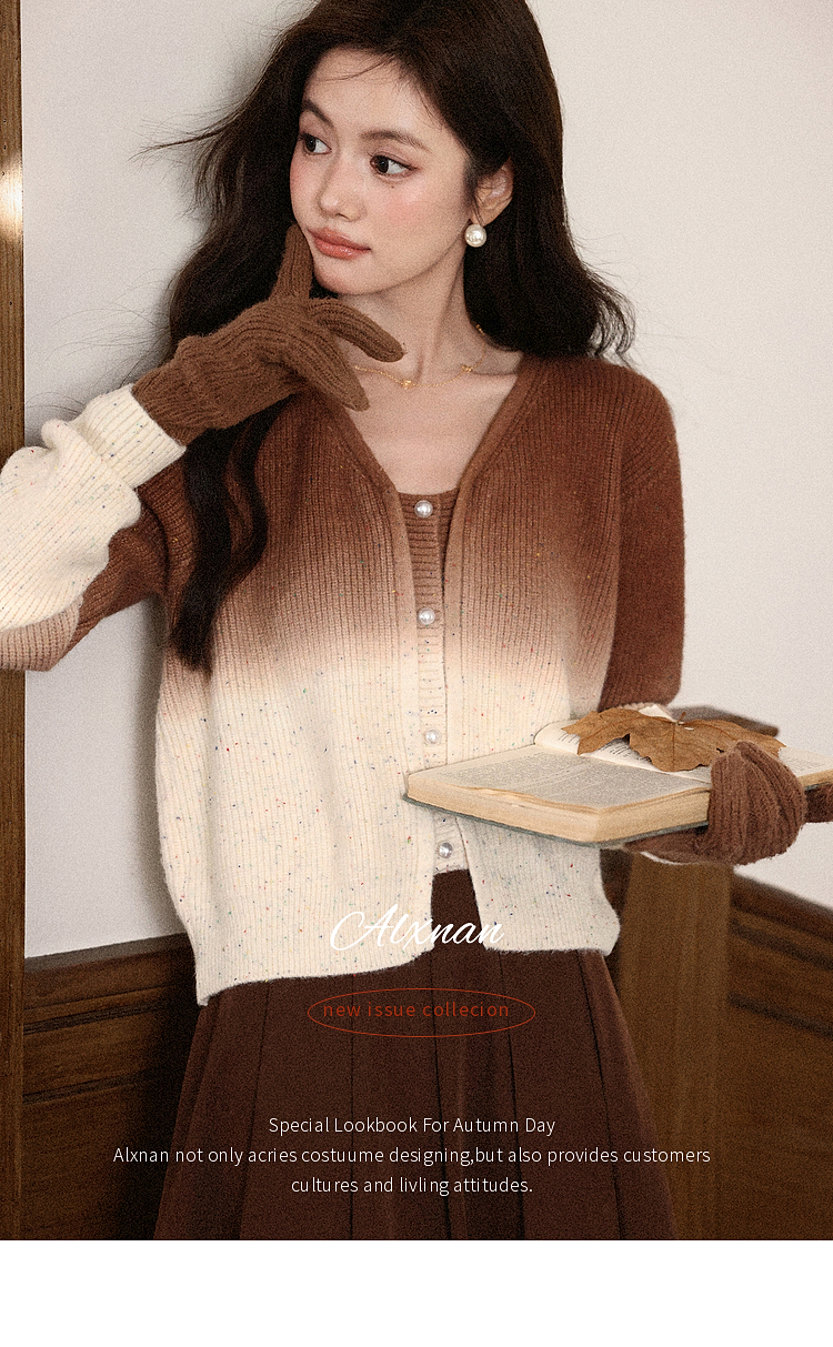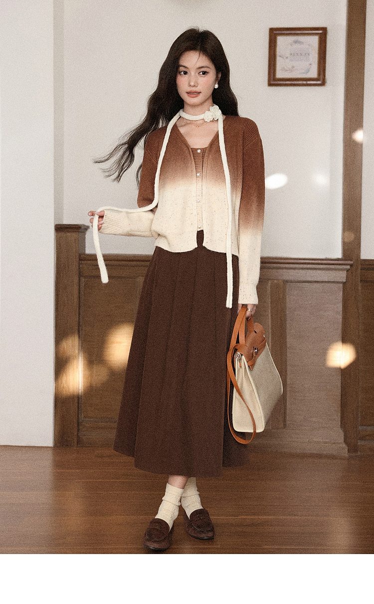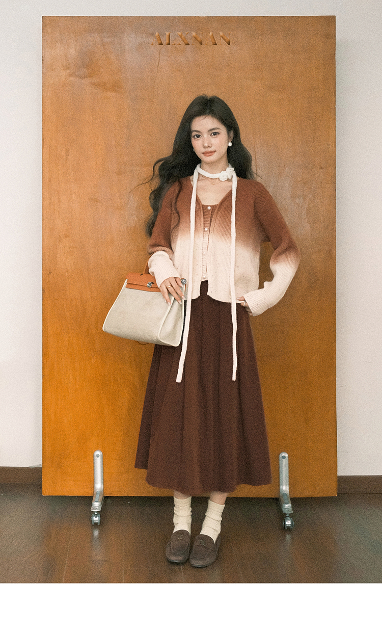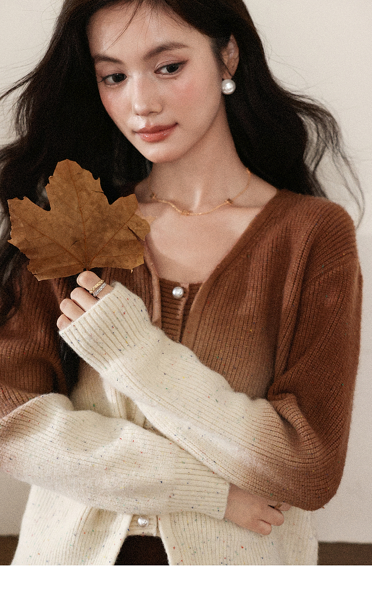 鹿向南「奶白慕斯」渐变咖色V领长袖毛衣女秋新款宽松通勤上衣女