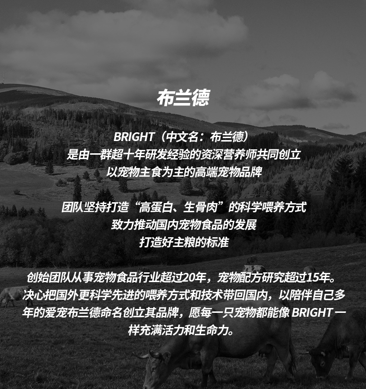 布兰德是一家专注于宠物主食的营养研发与创新的宠物公司,由多位营养学专家共同创立,创始团队成员宠物行业从业超15年,宠物配方研究超10年。布兰德始终坚持“科学有料,专业宠粮的”的产品理念,希望能给宠物看