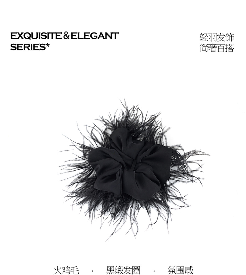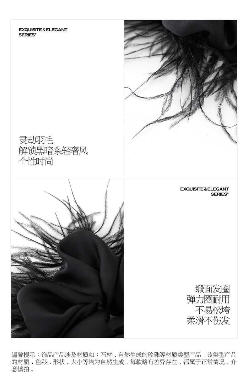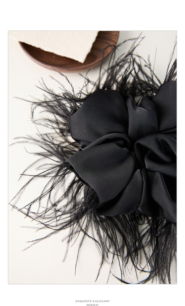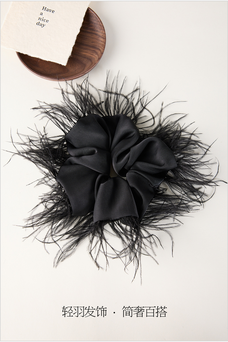 三彩2026新款羽毛装饰缎面发圈暗黑轻奢小众氛围感个性时尚灵动女