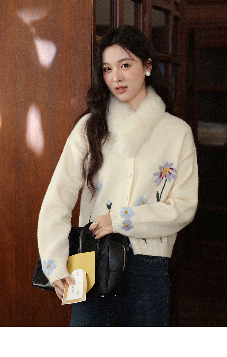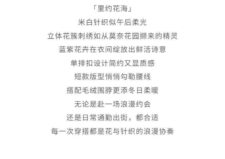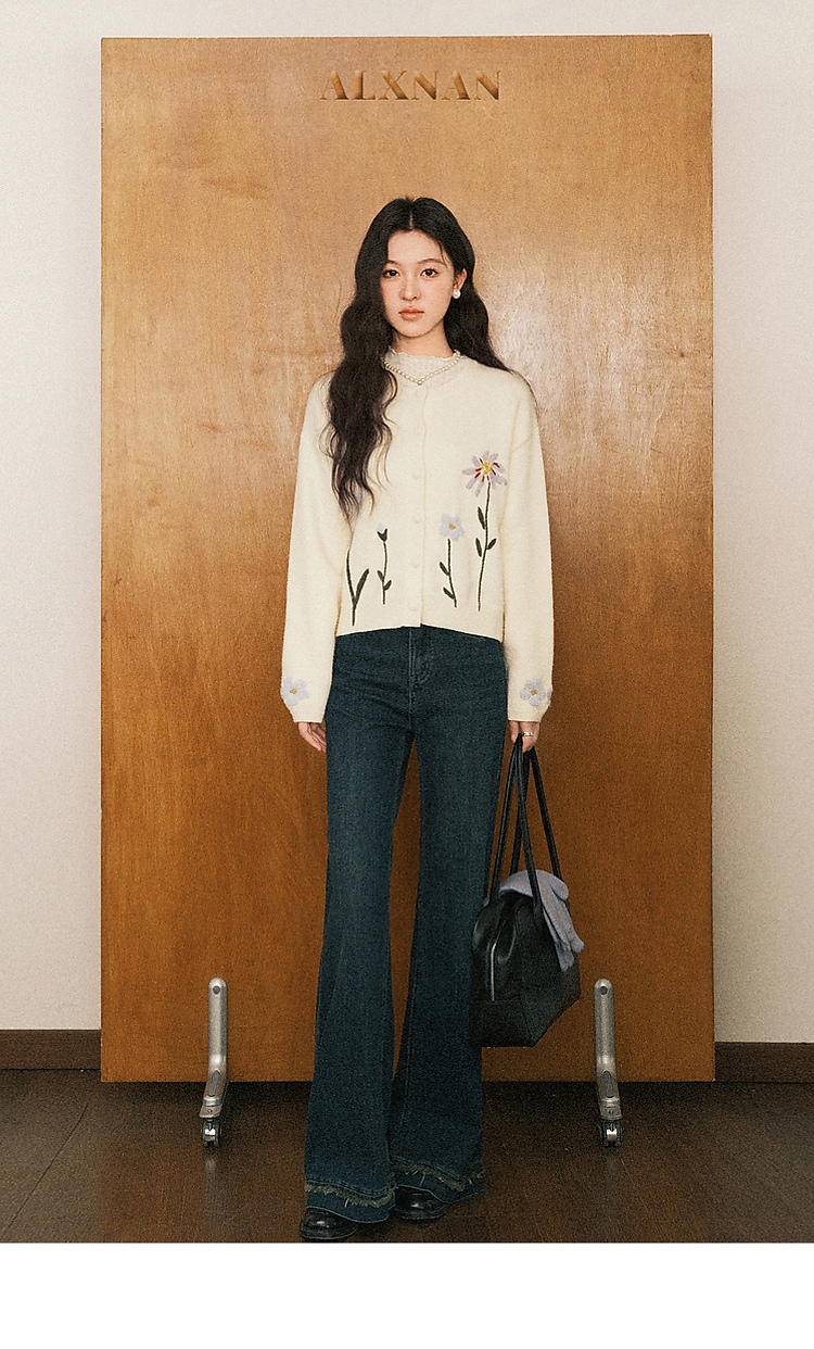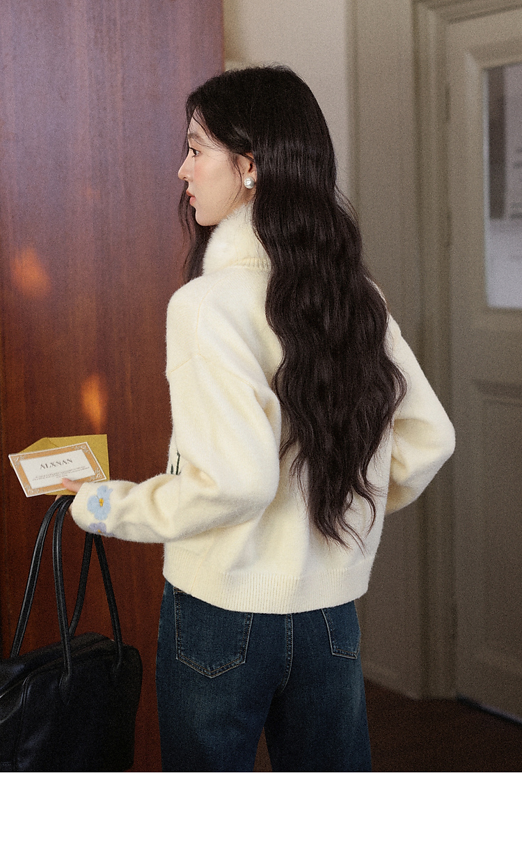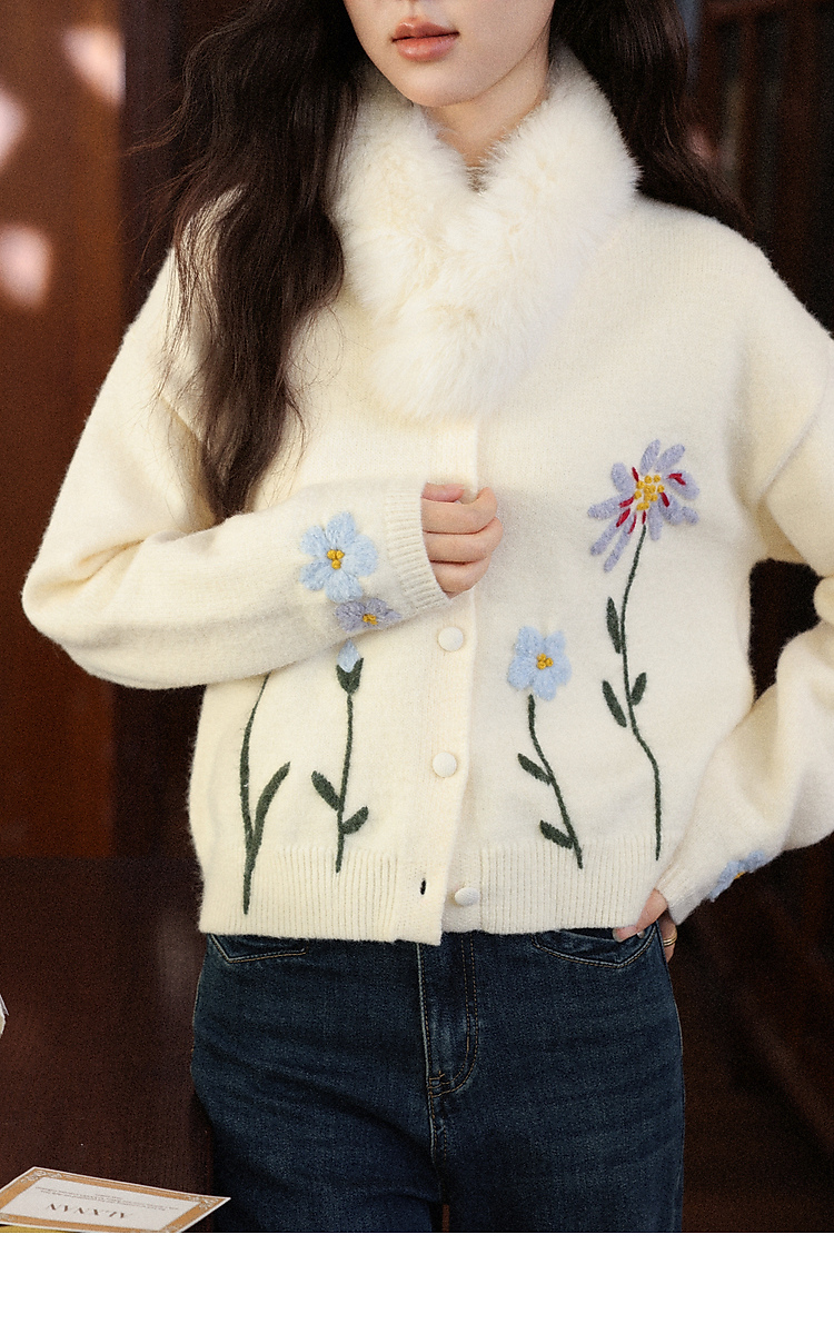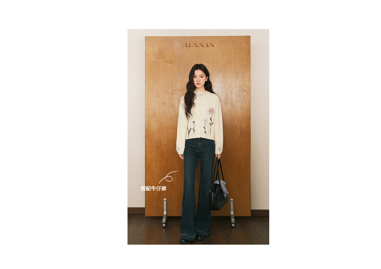 鹿向南「里约花海」米白色开衫针织毛衣女秋刺绣立体花朵长袖上衣