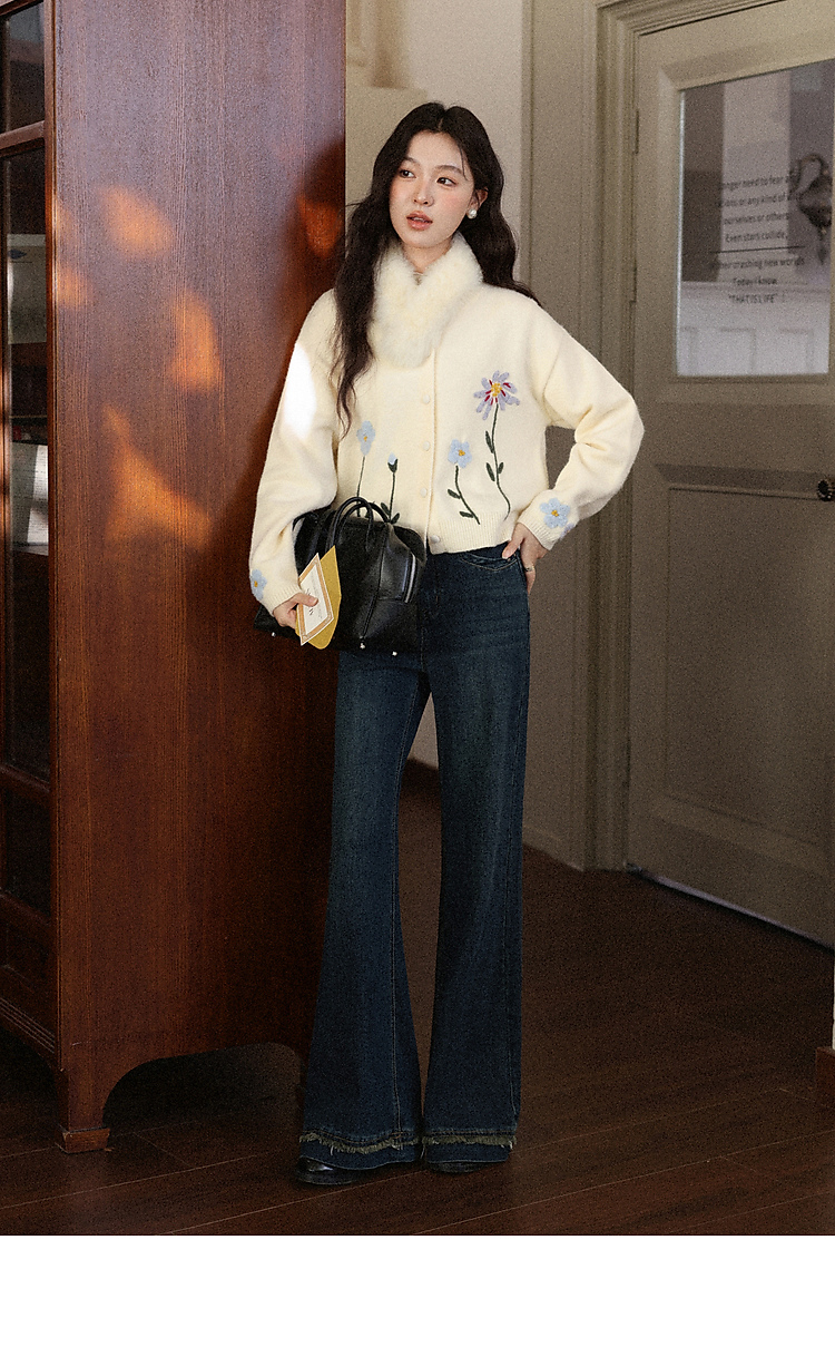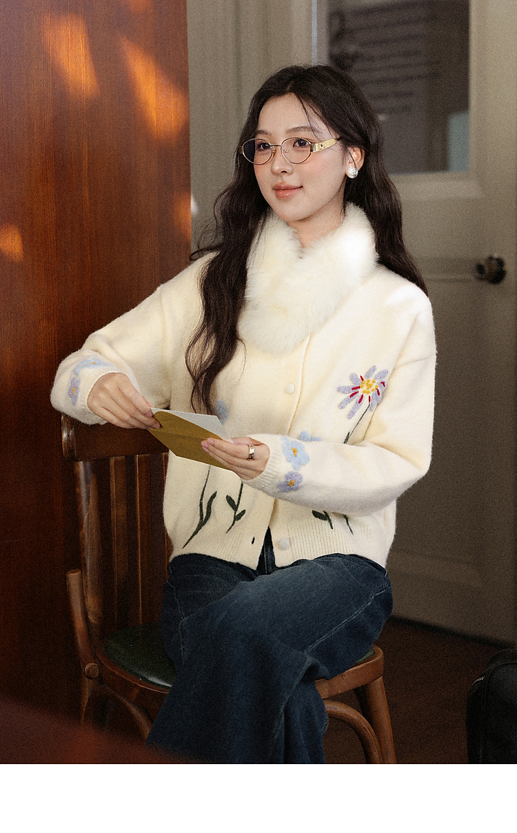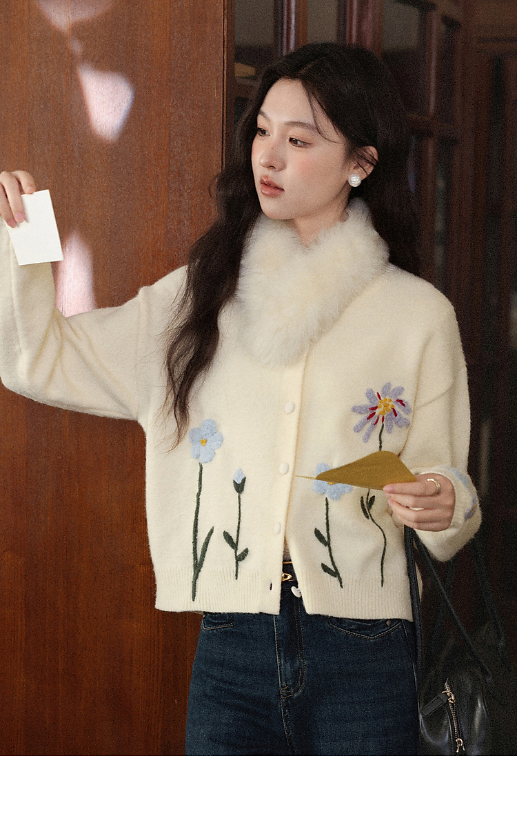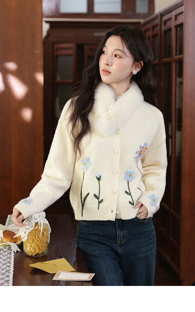 鹿向南「里约花海」米白色开衫针织毛衣女秋刺绣立体花朵长袖上衣
