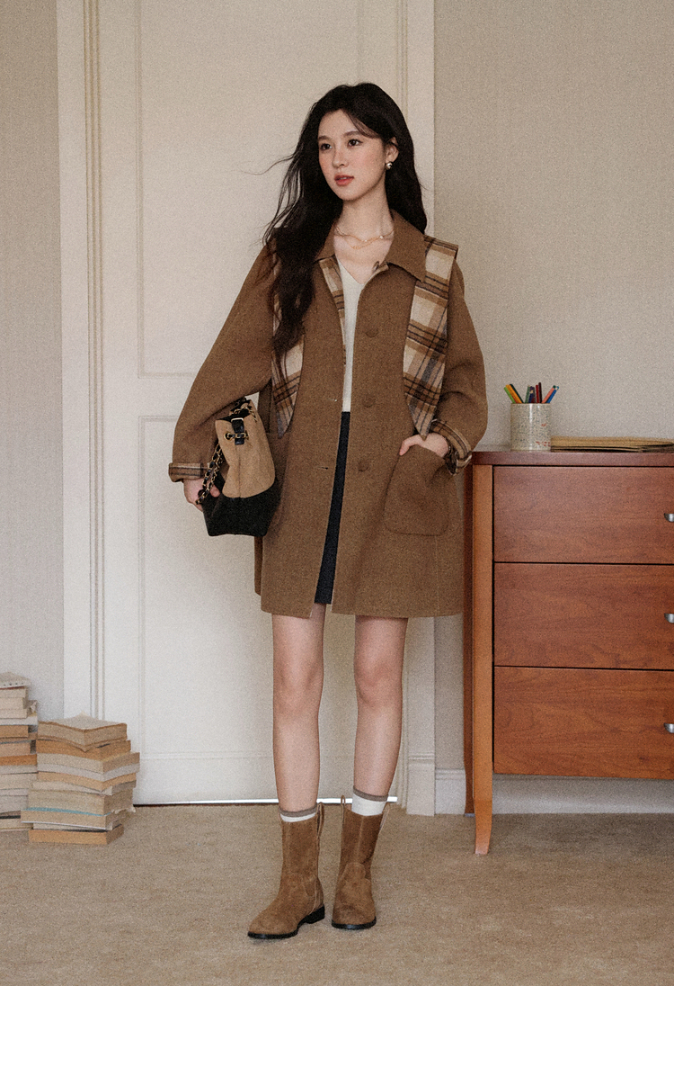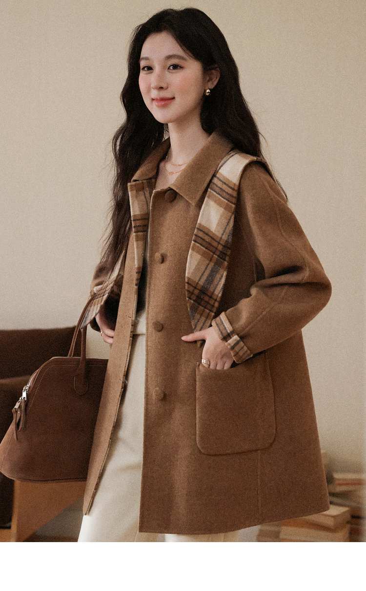鹿向南「焦糖卡纸」复古咖色双面穿披肩斗篷毛呢外套女秋新款上衣