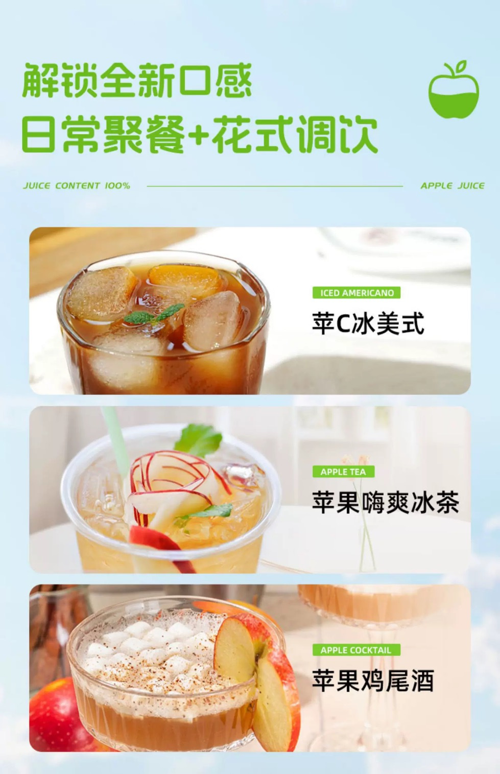 适用人群: 适合各个年龄段的人群饮用,特别是儿童、老人以及需要补充能量和营养的人。 但对于特定健康状况如糖尿病患者,应适量饮用并注意监控血糖水平,因为苹果汁含有天然糖分。