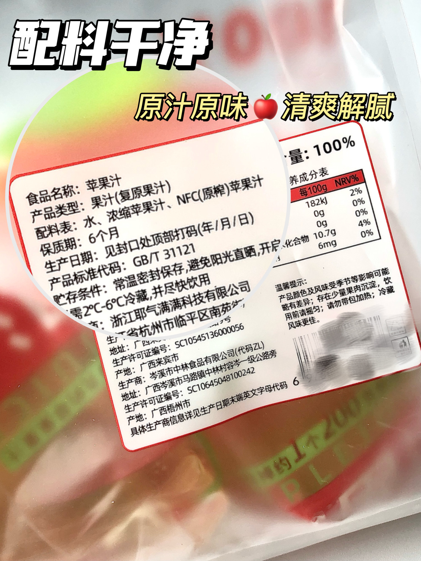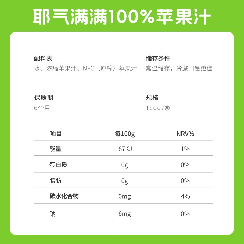 【品名】耶气满满100%苹果汁180g*10袋 【品牌】耶气满满 【规格】 100%苹果汁180g*10袋 【生产日期】最新生产 【保质期】6个月 【发货地】广西南宁 【发货快递】圆通快递&邮政快递(不指定快递) 【发货时效】48-72小时 【运费标准】大部分地区包邮,停发区域:新疆、西藏、内蒙古、四川甘孜、阿坝、港澳台及当天快递停发区域,还请见谅 【加运费地区】无 【是否支持七天无理由退换货】不支持 【拒收是否扣除来回运费】 拦截和改地址每10袋需要扣除5元 【售后说明】1.收货请当面验收,如遇到破损、少件、错发等情况,务必在签收24小时内申请售后,提报售后请提供快递面单图,产品问题图(所有的售后都基于提供照片或视频为凭证,未提供凭证或超过售后时效,不予处理,请理解!) 2.由于顾客未及时接听电话、未及时取货、储存不当造成的问题,不售后,不赔付。商品本身没有质量问题,因个人口感喜好不同、商品色泽、个人感官认知等,不做售后。