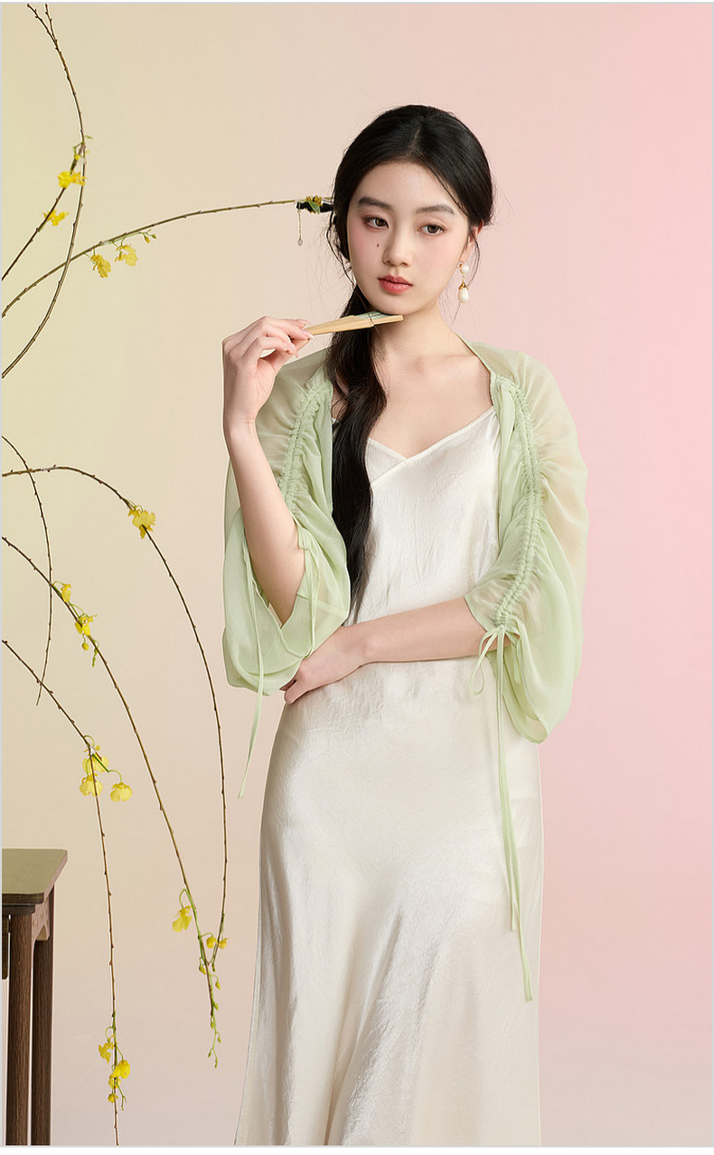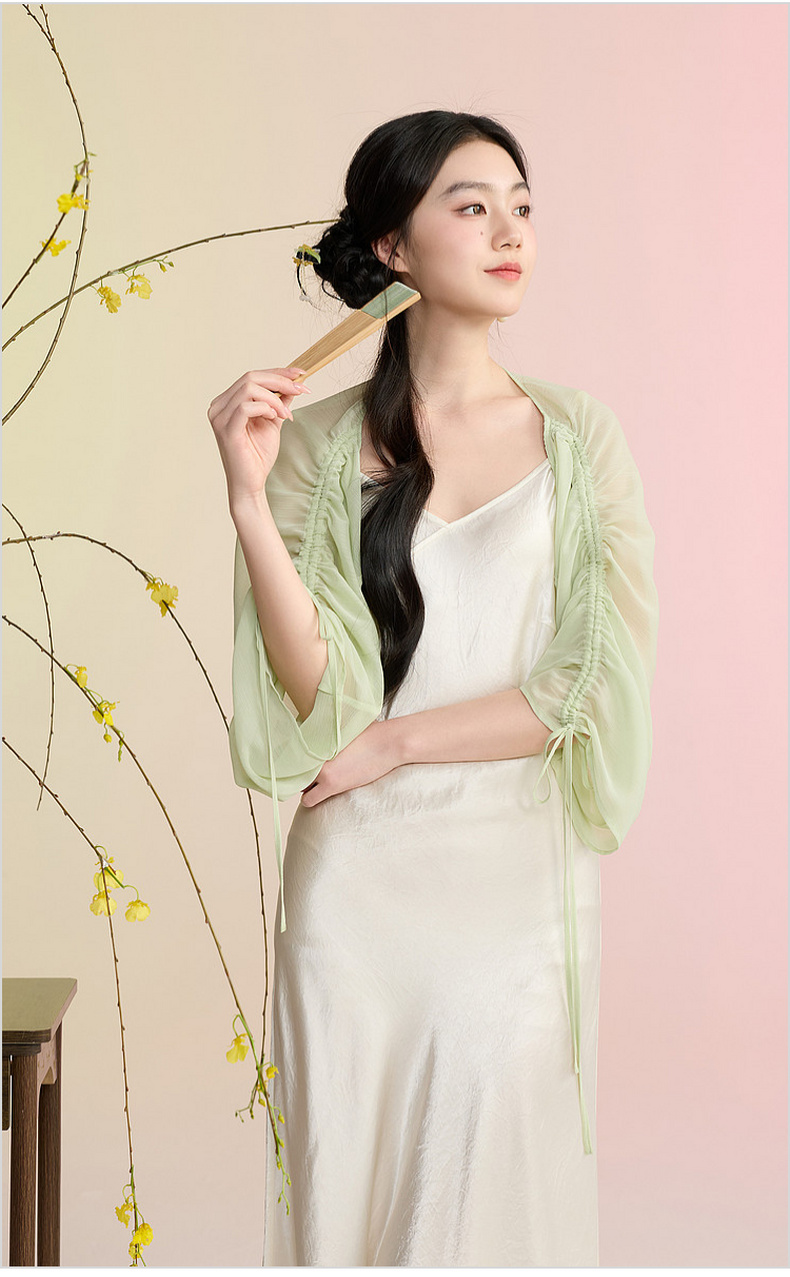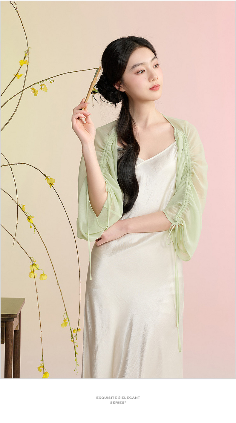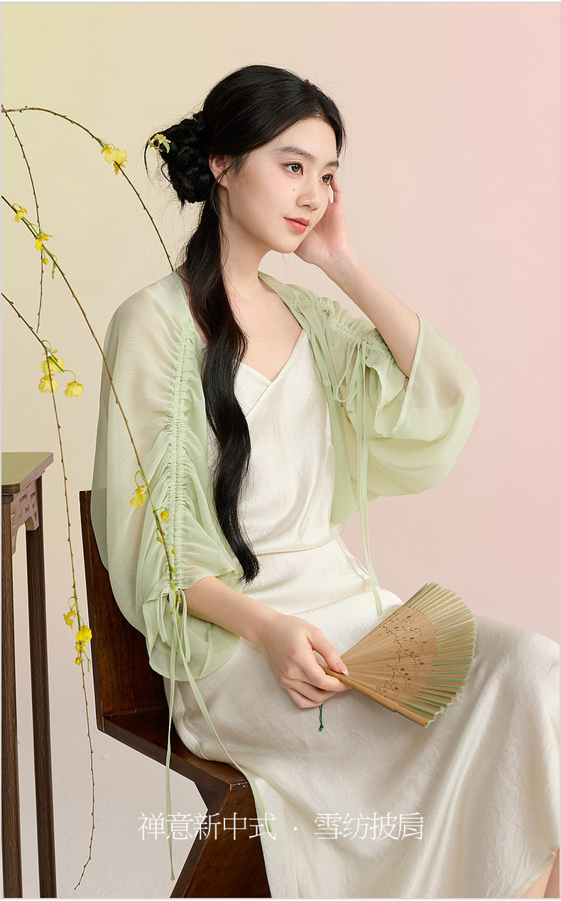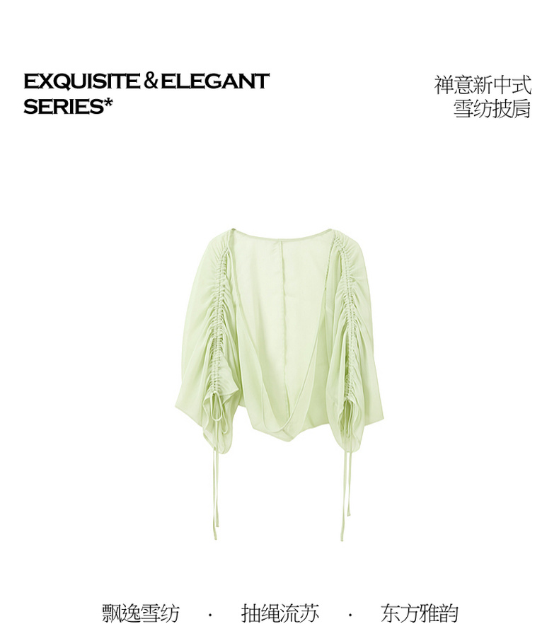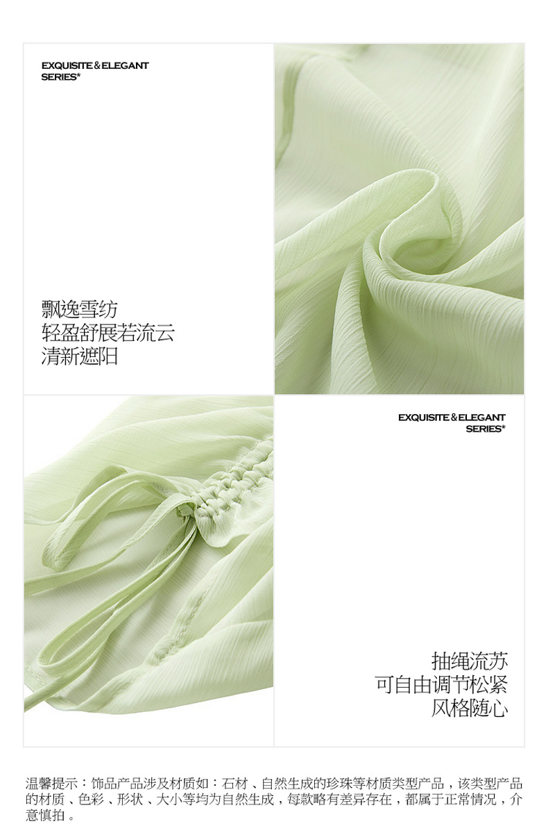 三彩2026新款国风雪纺披肩度假风遮阳灵动抽绳流苏朦胧通勤约会女